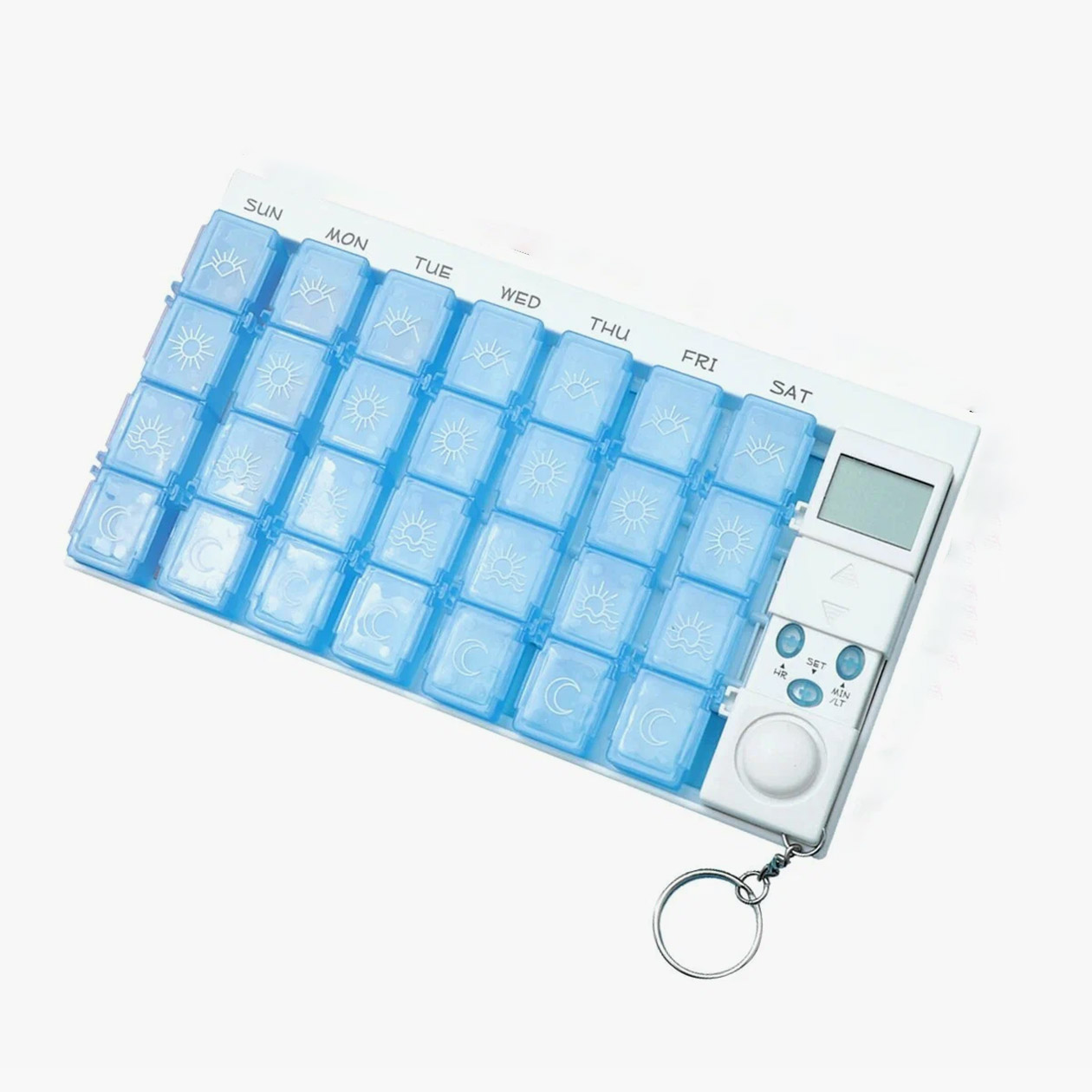 Таблетки можно разложить по ячейкам на каждый день недели. При этом они отсоединяются: например, в поездку можно взять только один отсек со всеми таблетками. У таймера есть дисплей, а напоминания сопровождаются громким звуком.