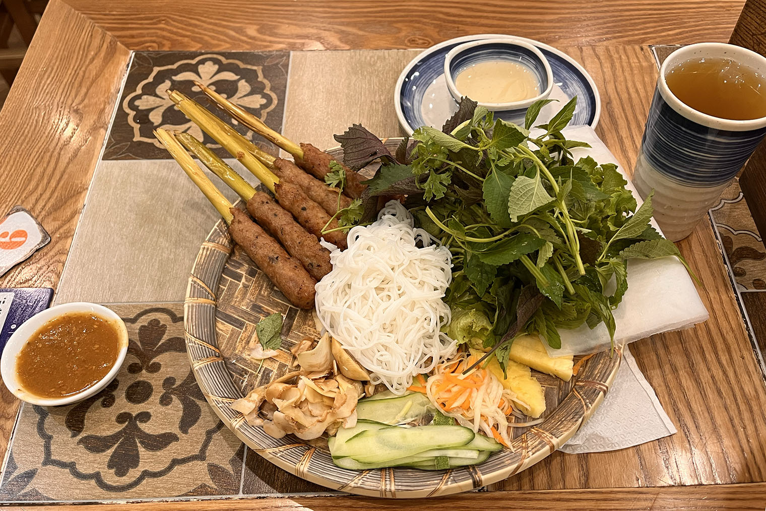 Спринг-роллы нравятся мне больше всего, потому что они невероятно вкусные и полезные. Обычно блюдо выглядит как тарелка с жареным мясом на шпажках, ломтиками ананаса и огурца, рисовой лапшой, маринованной капустой, ореховым соусом и большим количеством зелени. Это может быть лемонграсс, мята, базилик, кориандр и другие. Кроме спринг-роллов такую зелень добавляют в суп и употребляют вместо хлеба в качестве закуски.