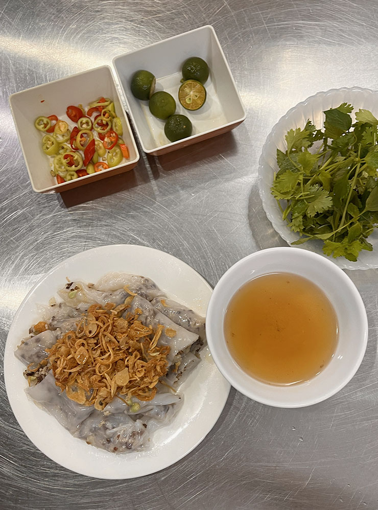 Бань куон — листы из рисового теста с мясной начинкой внутри — я всегда ела только в одном месте в Ханое. Однажды знакомые показали мне семейное кафе, которым заправляют три сестры. Там меня угостили главным блюдом, и я навсегда в него влюбилась. Когда пробовала бань куон в других заведениях, блюдо казалось совсем не таким: мясо безвкусное, начинки мало, а теста слишком много. В итоге стала ходить лишь в то семейное кафе. Там блюдо всегда подавали с тарелкой зелени, рыбным соусом, специями и дольками кумквата, чтобы придать кислинку.