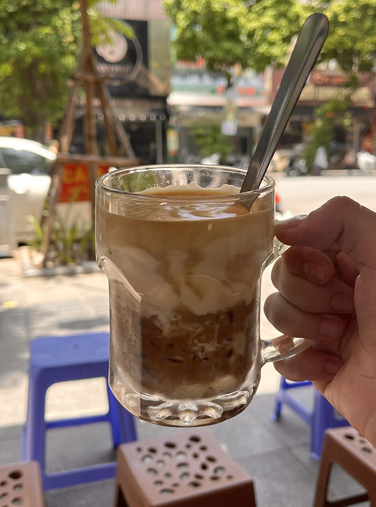 Вкус яичного кофе полюбился мне с первого раза, и я стала постоянным гостем этого заведения. Я жила в Ханое и не изменяла традиции: старалась приходить за яичным кофе в Kem Trứng Bà Khanh, хотя в обеденное время туда сложно попасть из-за огромного количества посетителей. Иногда меня предупреждали, что ждать заказ придется 20—30 минут, но оно того стоило. За несколько лет не изменились ни уникальный вкус, ни цена. Как и в 2023, в 2025 году яичный кофе стоит 40 000 VND (123 ₽).