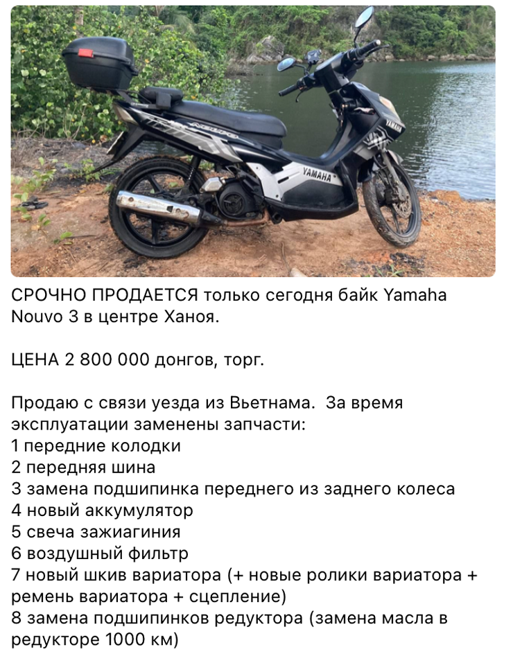 Аренда байка стоит от 150 000 VND (463 ₽) за сутки и от 800 000 VND (2 472 ₽) за месяц. Например, в Дананге я арендовала байк за 200 000 VND (618 ₽) в день, а в Ханое платила 900 000 VND (2 781 ₽) в месяц. Надежный прокат я нашла через ту же знакомую, что помогла с контактом риелтора. Также сервисы аренды можно искать самостоятельно через «Гугл-карты»: вбиваете в поиск Motorbike rental, смотрите точки поблизости и читаете отзывы. Или просите совета у местных экспатов. Например, в Нячанге аренду байков обсуждают в чате «Нячанг мото».