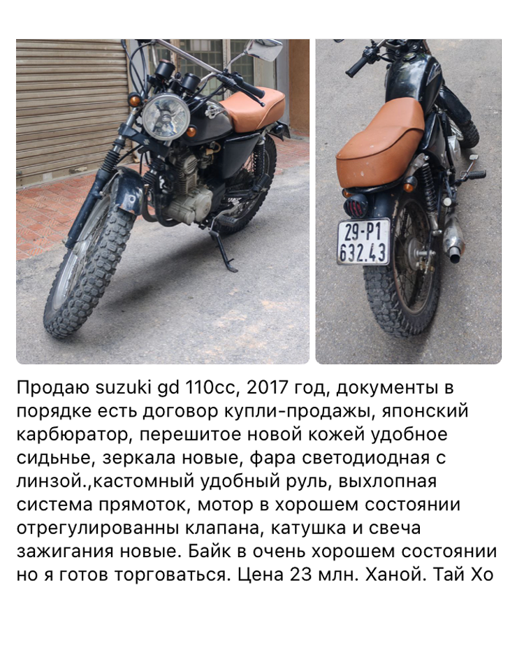 Покупка байка выгоднее аренды, если остаешься в стране дольше чем на полгода. Стоимость мотоцикла начинается от 4 000 000 VND (12 362 ₽) и доходит до 50 000 000 VND (154 525 ₽) за самые классные модели. Но для покупки у официального дистрибьютора необходима как минимум долгосрочная годовая виза, а в некоторых городах, например в Нячанге и Дананге, спрашивают двухлетнюю карту резидента. Так что иностранцы в основном приобретают байки друг у друга. Оформляют все, не спрашивая документов, под которыми часто подразумевают blue book, или «синюю книгу». Проще говоря, это паспорт мотоцикла (сайт недоступен из РФ), в котором указана информация о двигателе, номерных знаках и владельце.