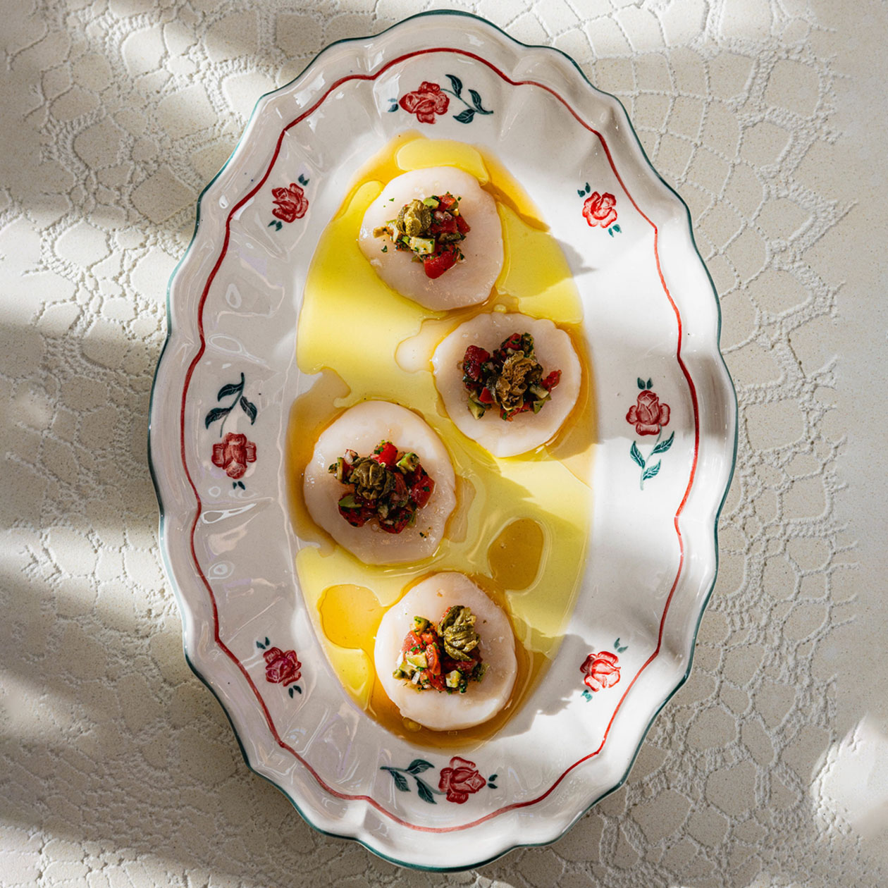 Как выглядит. Пространство делится на два уровня. На первом этаже — бар с высокой стойкой, где удобно начать вечер с коктейля, и витрина со льдом, на которой лежат свежие морепродукты: устрицы, креветки, рыба. Второй этаж — основной зал. Здесь просторнее и торжественнее, но за счет светлых стен и деревянных деталей сохраняется «южная» легкость.