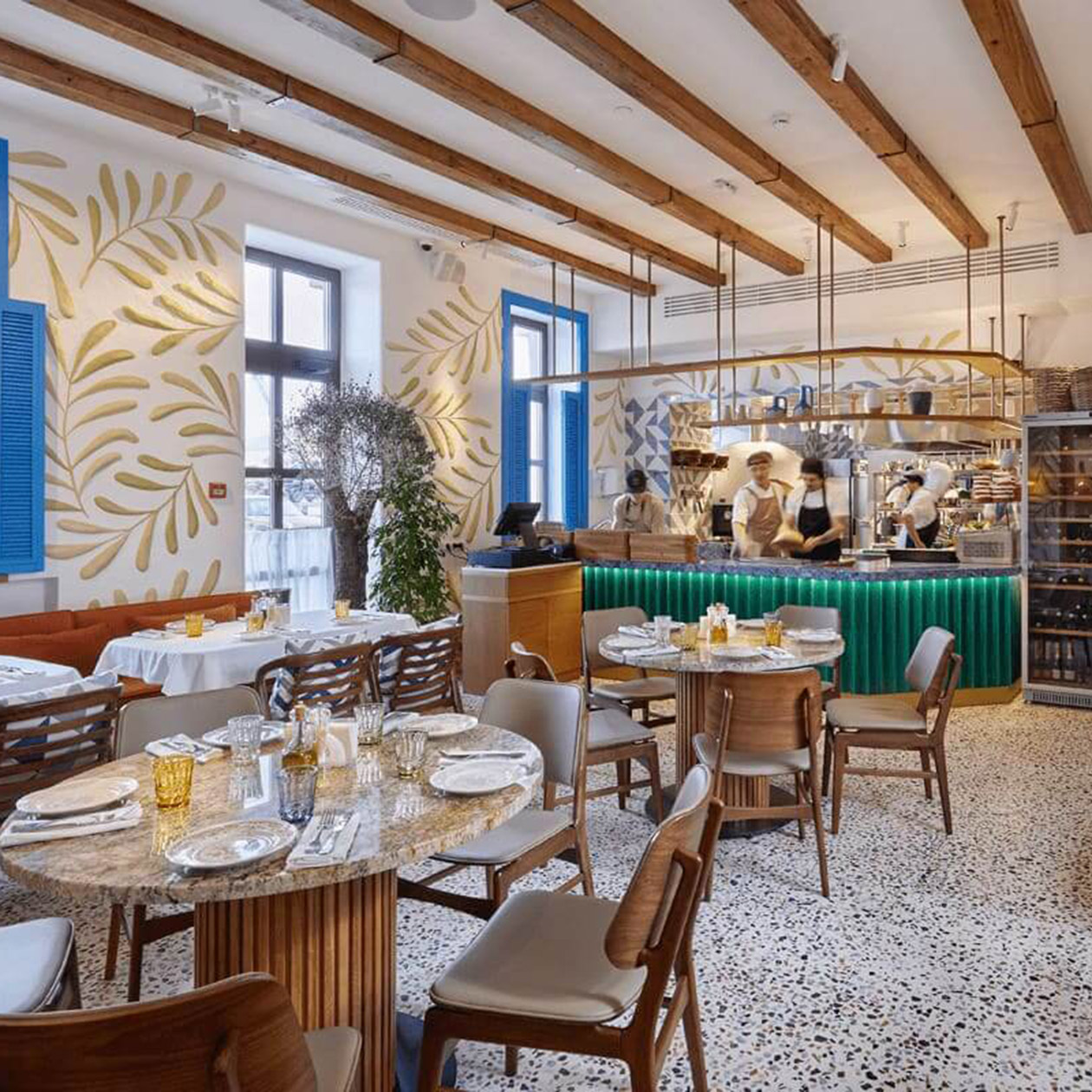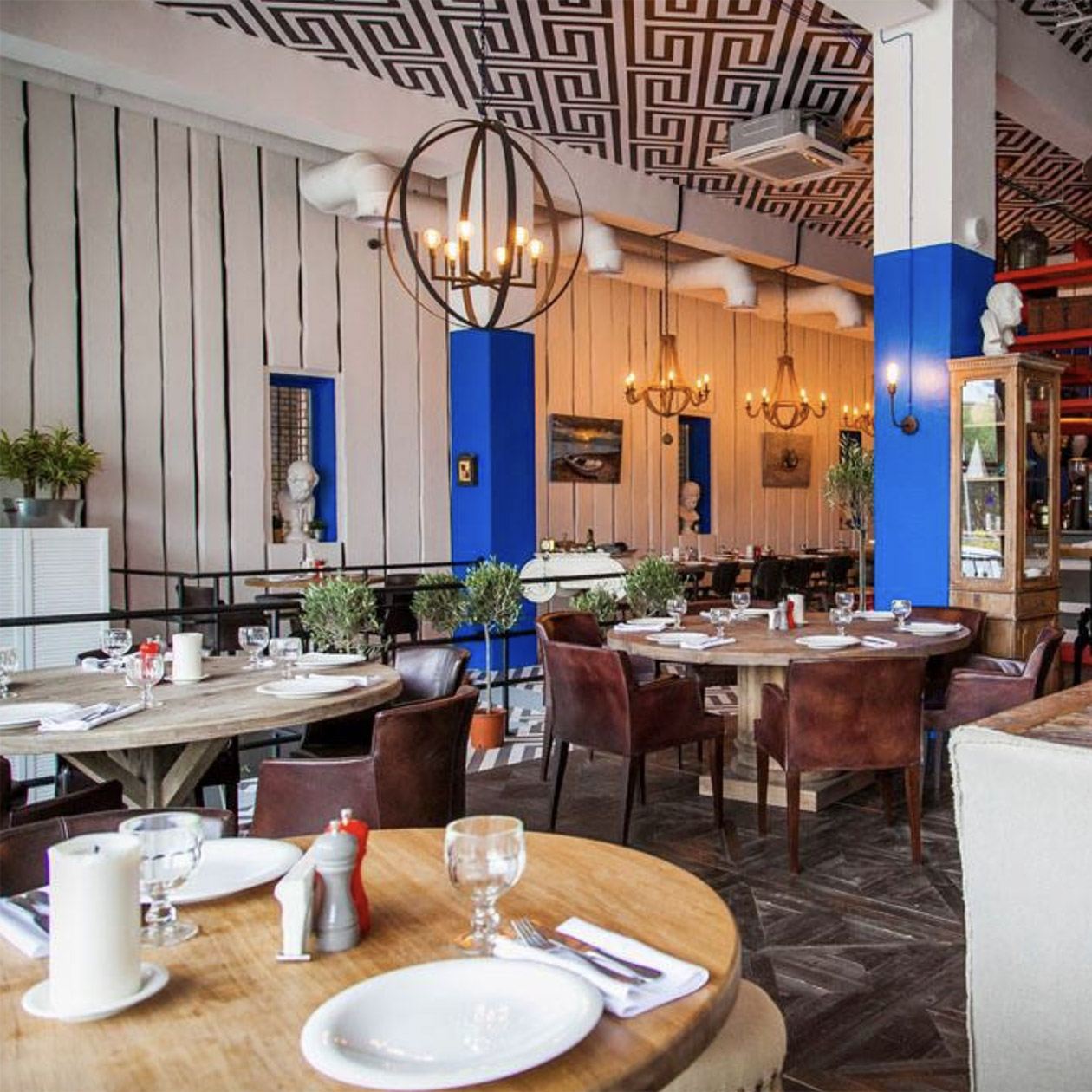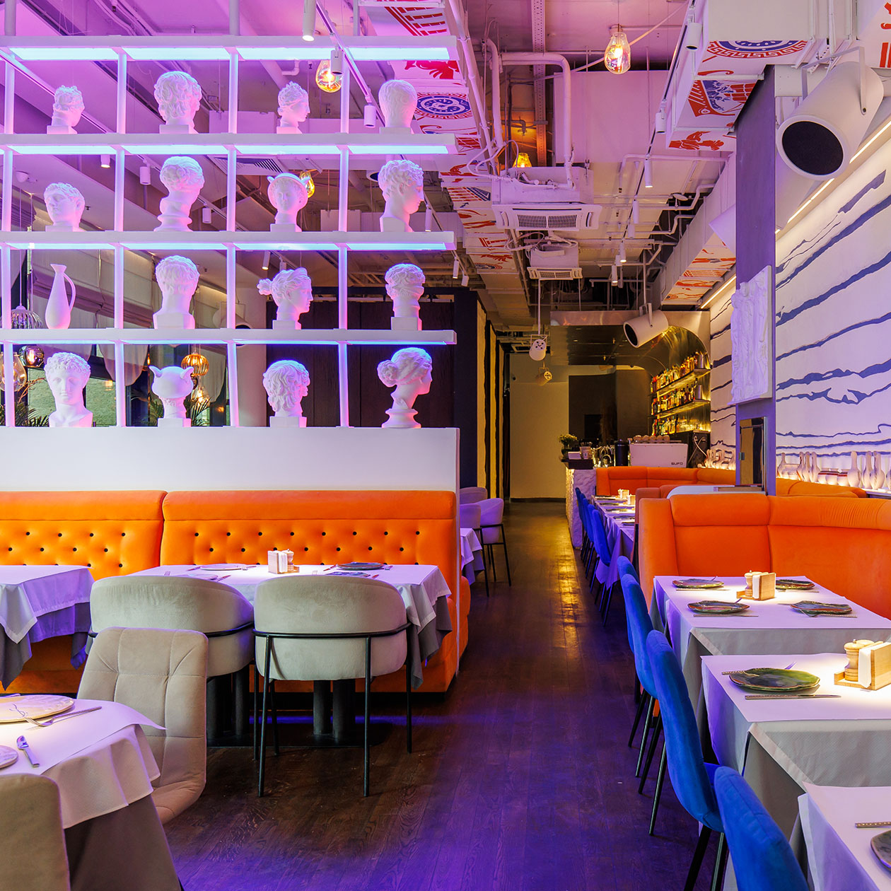 Как выглядит. Среди греческих проектов в Москве есть и демократичные — такие, как «Гермес», где большую часть блюд отдают за 400 ₽. Атмосфера внутри соответствует: ярко-оранжевые диваны, стены с электрически-синим узором и короткие белые скатерти. Здесь вряд ли будешь отмечать памятную дату, зато прийти за насыщенным обедом и не разориться — легко.