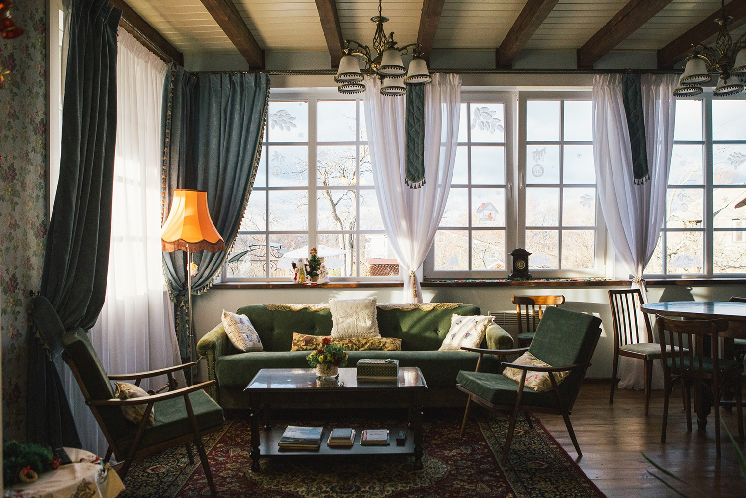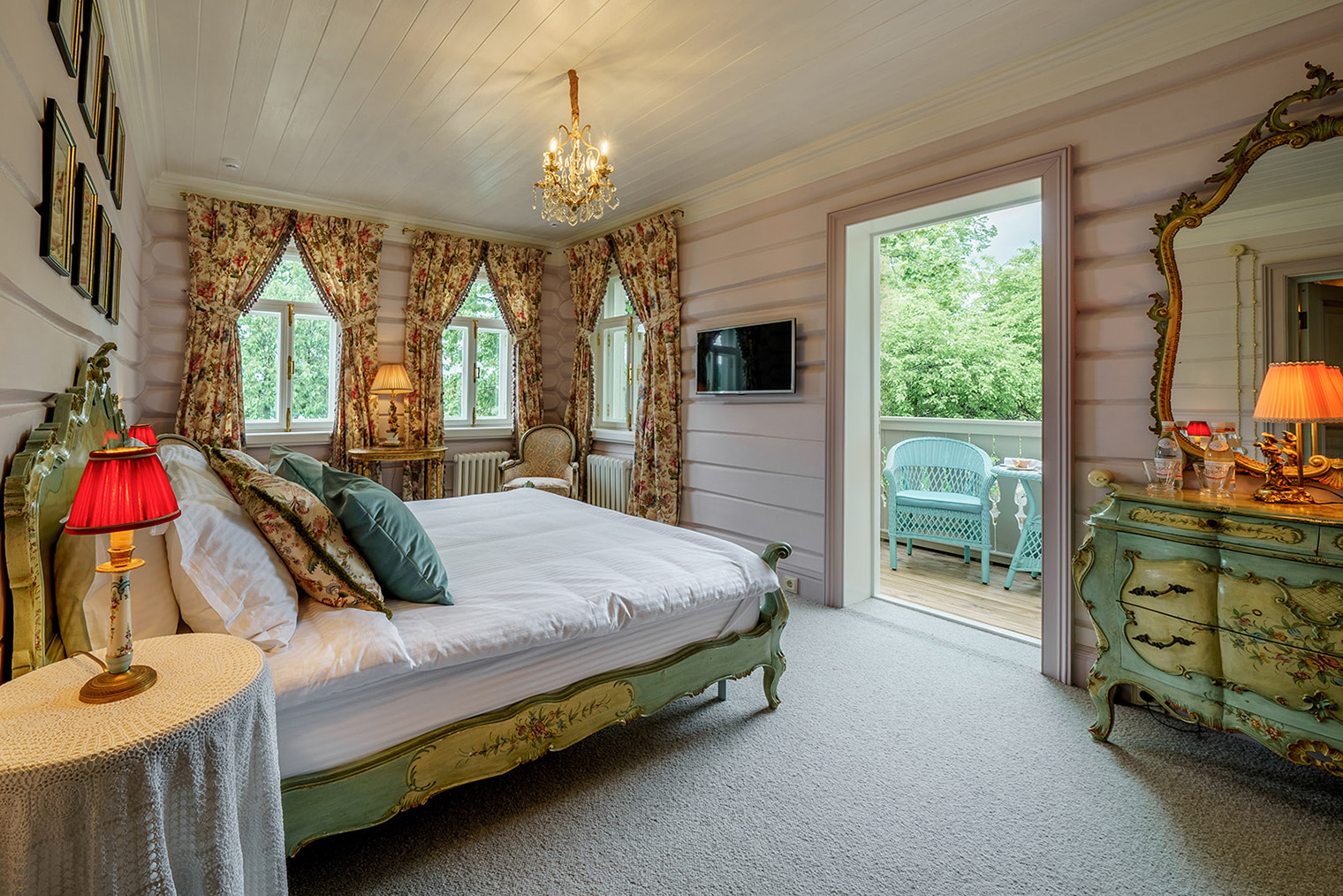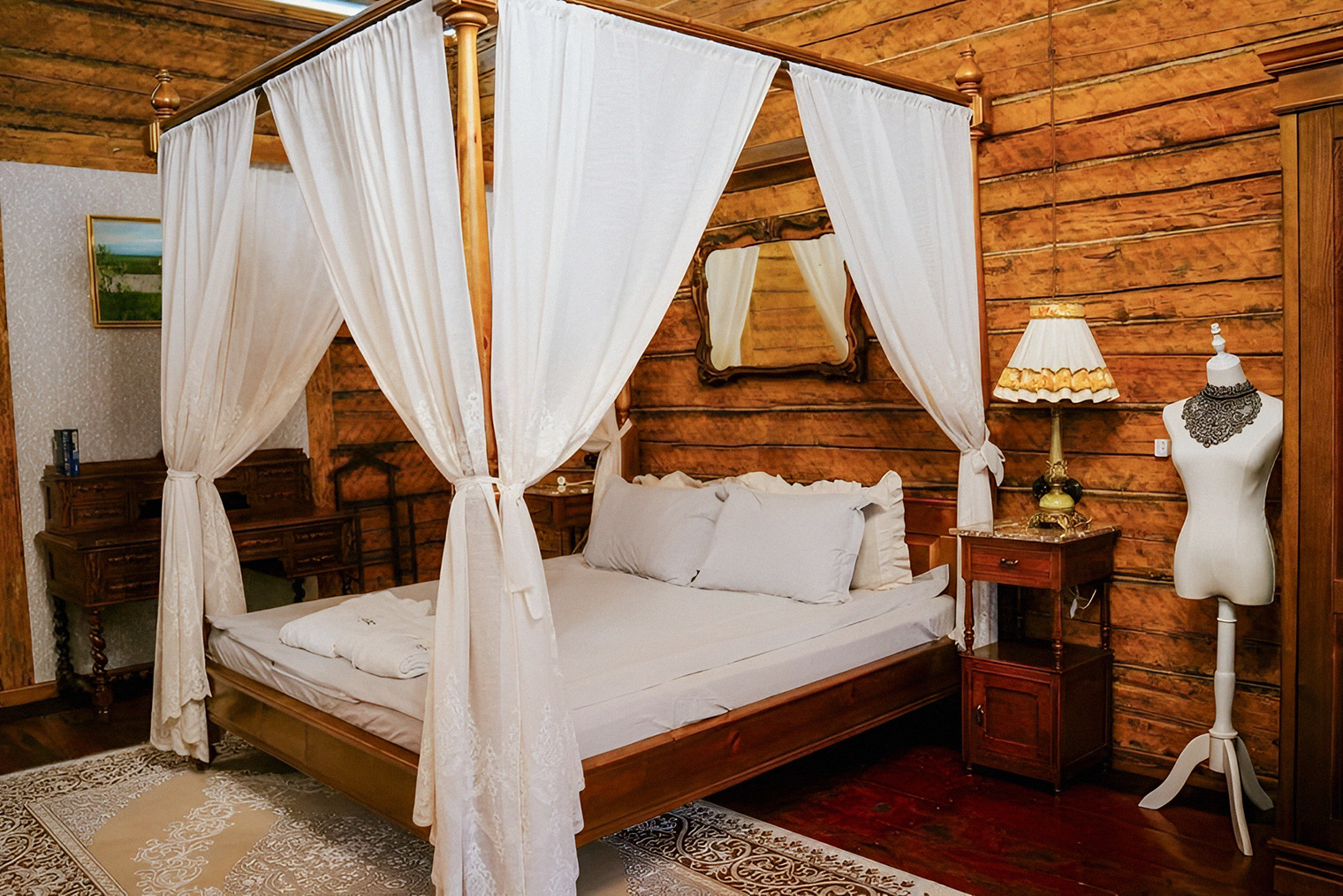 Обстановка. Десять номеров обставлены антиквариатом, за которым владельцы ездили в Европу: здесь и массивные комоды, и золоченые подсвечники, и множество замысловатых люстр. При отеле есть ресторан, который строили на самой высокой точке участка, — так, чтобы с веранды открывался лучший вид на Волгу.