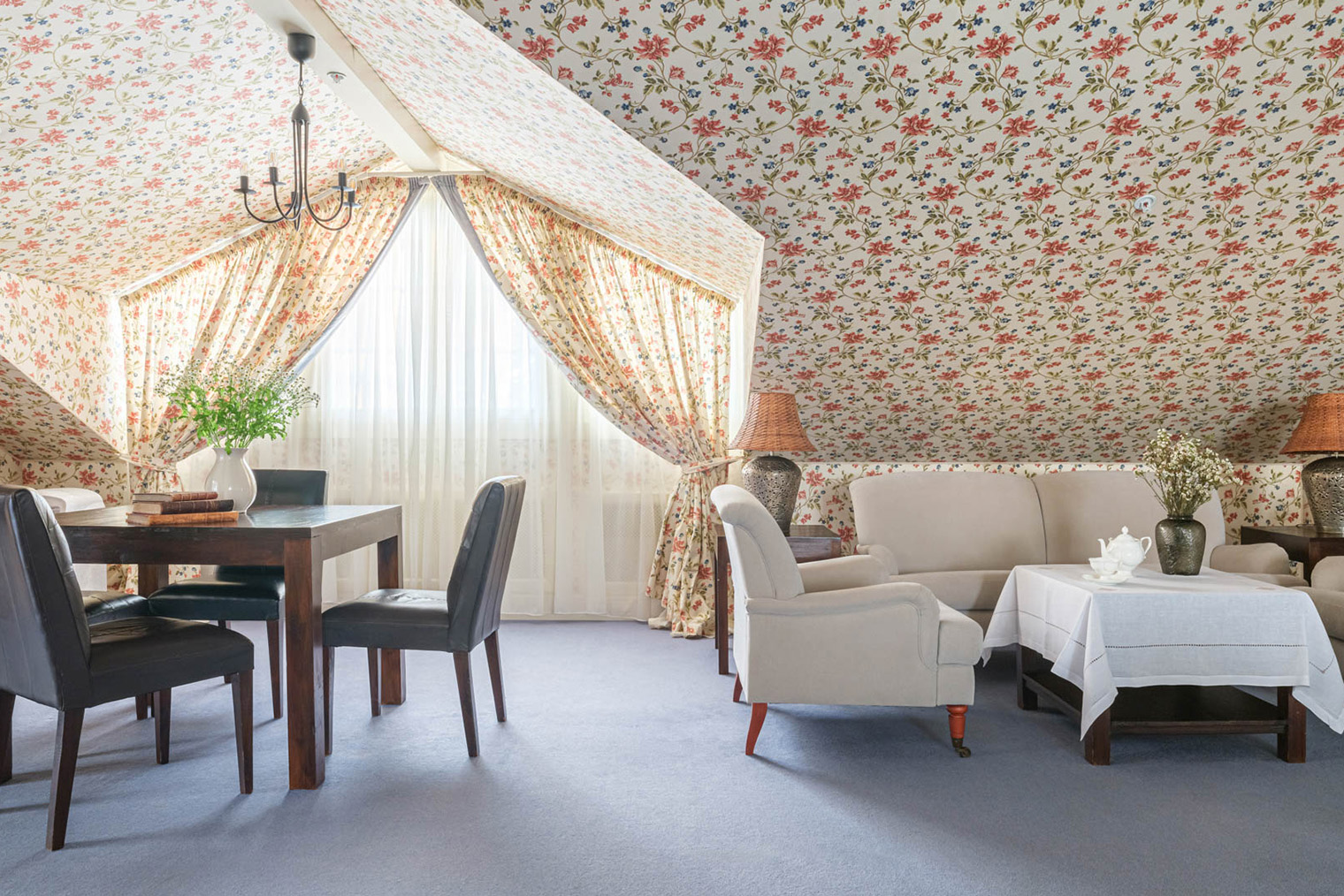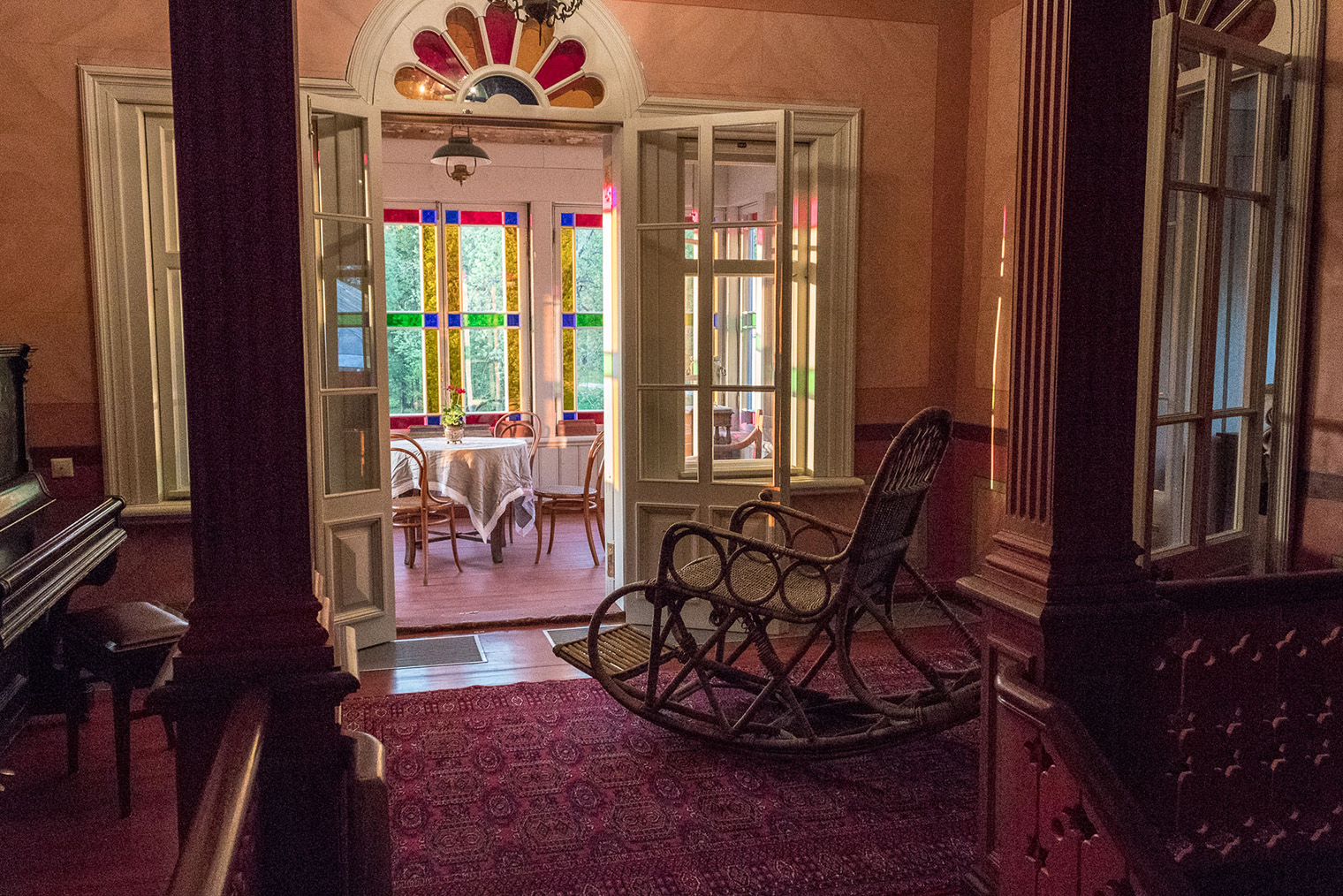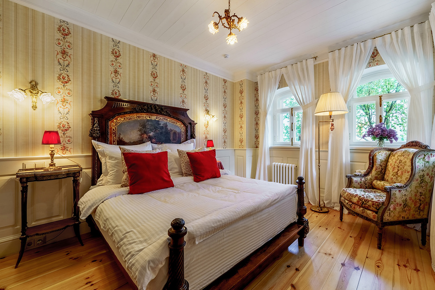 Обстановка. Десять номеров обставлены антиквариатом, за которым владельцы ездили в Европу: здесь и массивные комоды, и золоченые подсвечники, и множество замысловатых люстр. При отеле есть ресторан, который строили на самой высокой точке участка, — так, чтобы с веранды открывался лучший вид на Волгу.