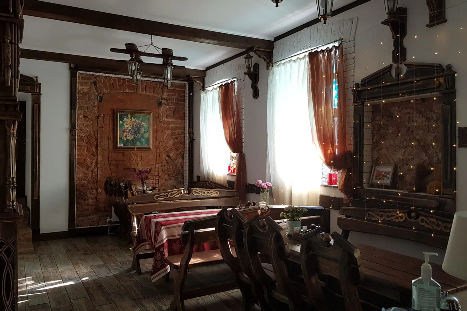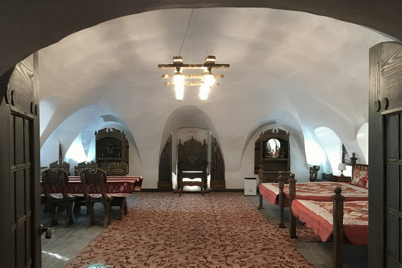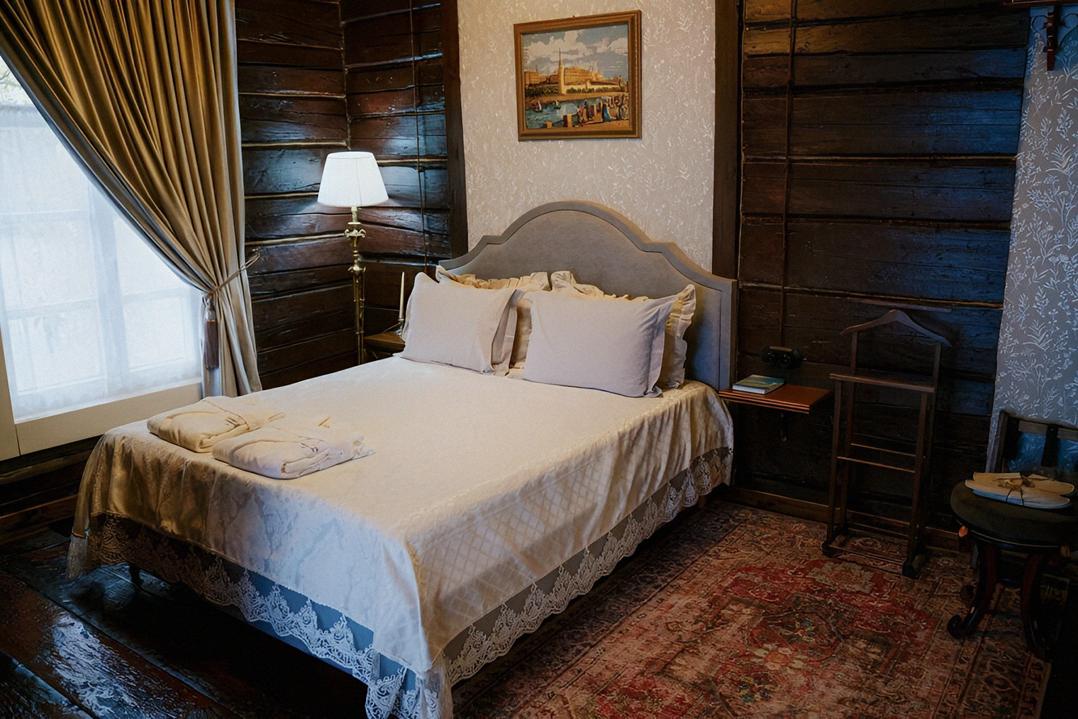 Обстановка. Мебель в гостинице новая, зато здесь много других старинных деталей: каменные наличники, раскрытая кирпичная кладка и буковые въездные ворота, которые считаются старейшим деревянным памятником Владимирской области. Если приезжаете компанией, снимите шестиместные апартаменты «Делюкс» за 22 500 ₽ в сутки в огромном зале со сводчатым потолком.
