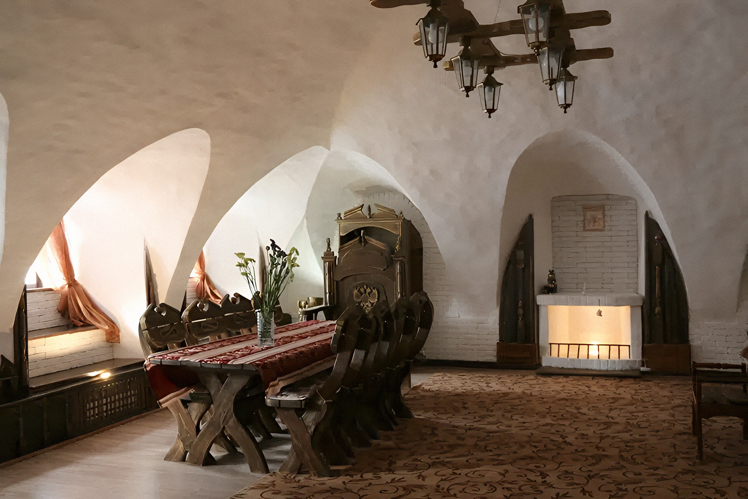 Обстановка. Терем вмещает девять спален, и в нем собрано множество старинных вещиц, которые собрали по окрестным деревням и у коллекционеров. Большая часть мебели и утвари старше самого дома, причем все можно трогать и использовать. В главной столовой — людской, как называли ее в старину, — построили русскую печь с лежанкой. На третьем этаже — музей советского быта и коллекция расписных прялок, а еще выше — смотровая башня, откуда удобно изучать окрестности.