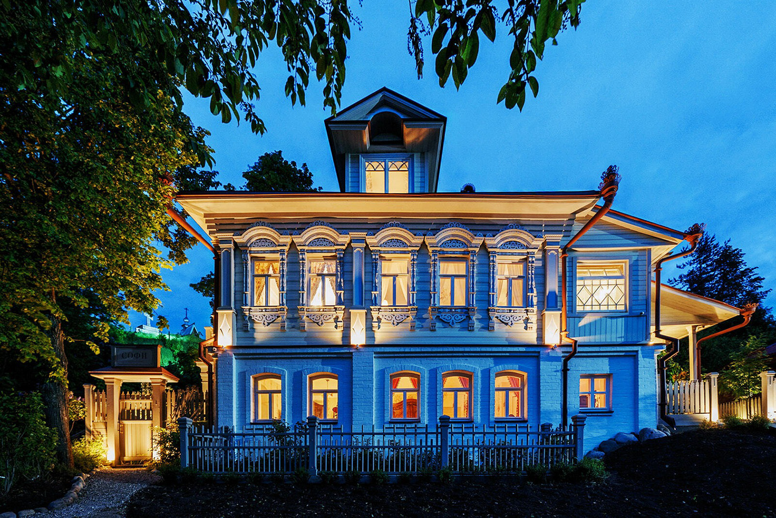 История. Строго говоря, это новодел: здание воспроизвели по канонам классической усадьбы, которая когда-то стояла в этой части Плеса. Но если об этом не знать, то кажется, что с 19 века в доме мало что поменялось. Декоративные детали скопированы с несохранившихся фасадов плесских купеческих домов, а многие элементы здания изготовлены вручную.