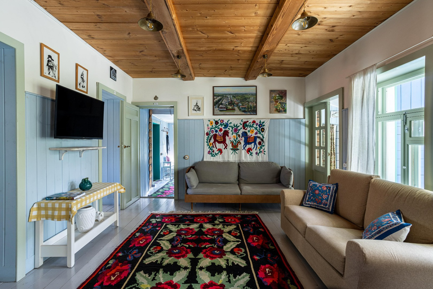 История. Этот дом неподалеку от заповедника Поленово построили в 1956 году. Первый хозяин был музыкантом и художником, он сам проектировал и украшал здание. Несколько лет назад участок выкупила семейная пара, которая открыла здесь гестхаус с небольшой фермой.