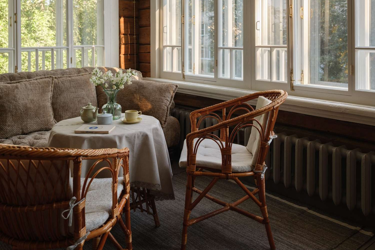 Обстановка. В отличие от других представленных здесь вариантов, снять дачи можно только целиком. Окна в зданиях деревянные, стены украшены изразцами, на верандах — печки-буржуйки и плетеные кресла. В домах есть мини-библиотеки с книгами о русском искусстве и множество приятных деталей: цветастые ковры и покрывала из узбекских тканей, вышитые салфетки, керамическая посуда.