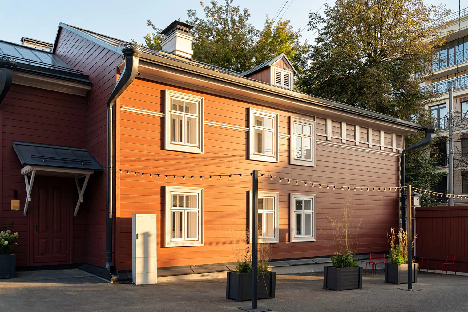 История. Купеческий дом был построен в 1887 году и относится к исторической застройке Тарусы. В ходе реставрации здание бережно восстановили, сохранив его архитектурный характер и ключевые элементы. Проект стал частью современного переосмысления старой застройки города, где исторические дома получают новые функции без утраты идентичности.