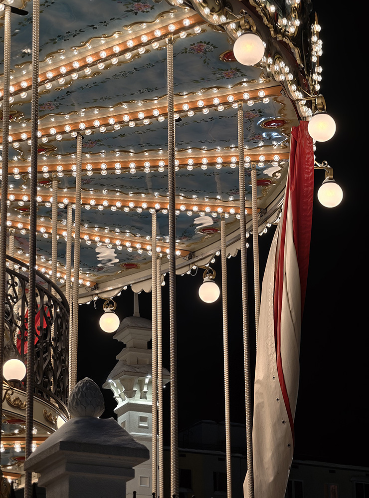Снимок карусели с сильным приближением 10×, на мой взгляд, вышел хорошо у обоих смартфонов. На Vivo точнее цветопередача, естественнее снег на заборе, можно различить больше четких деталей вроде цветов на потолке. С другой стороны, Honor в этот раз точнее угадал с атмосферой кадра, добавив ему теплоты и контрастности.