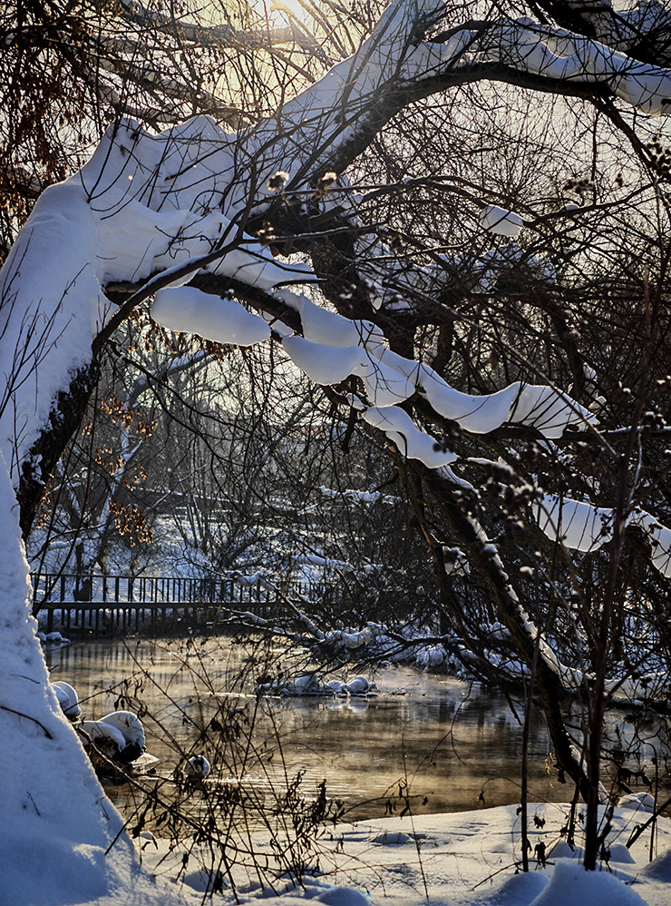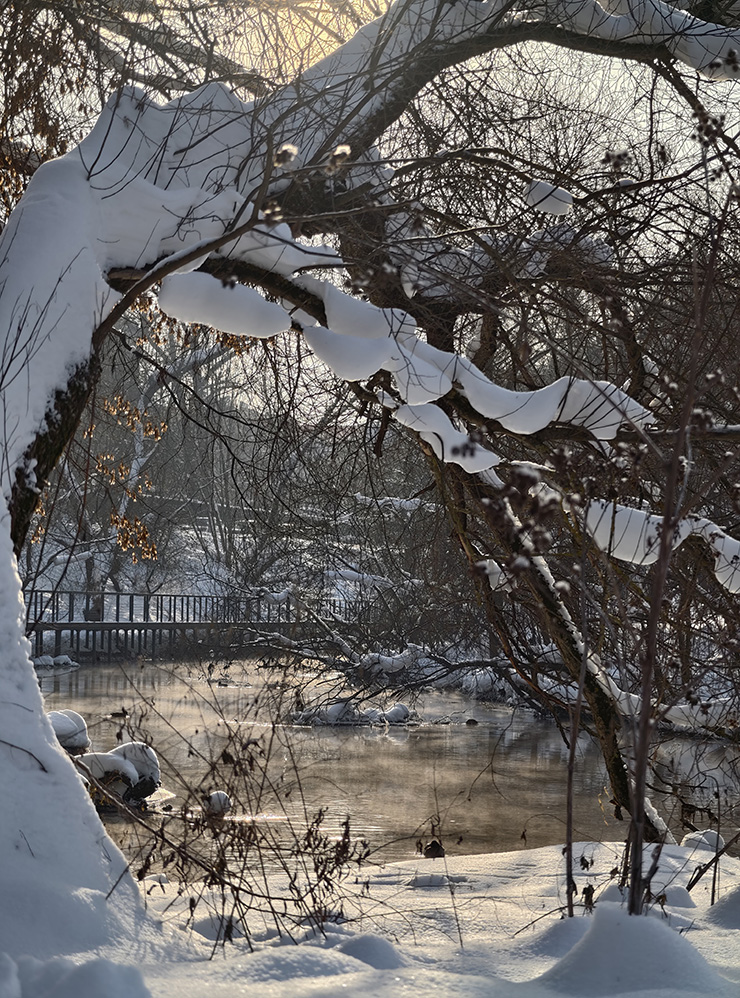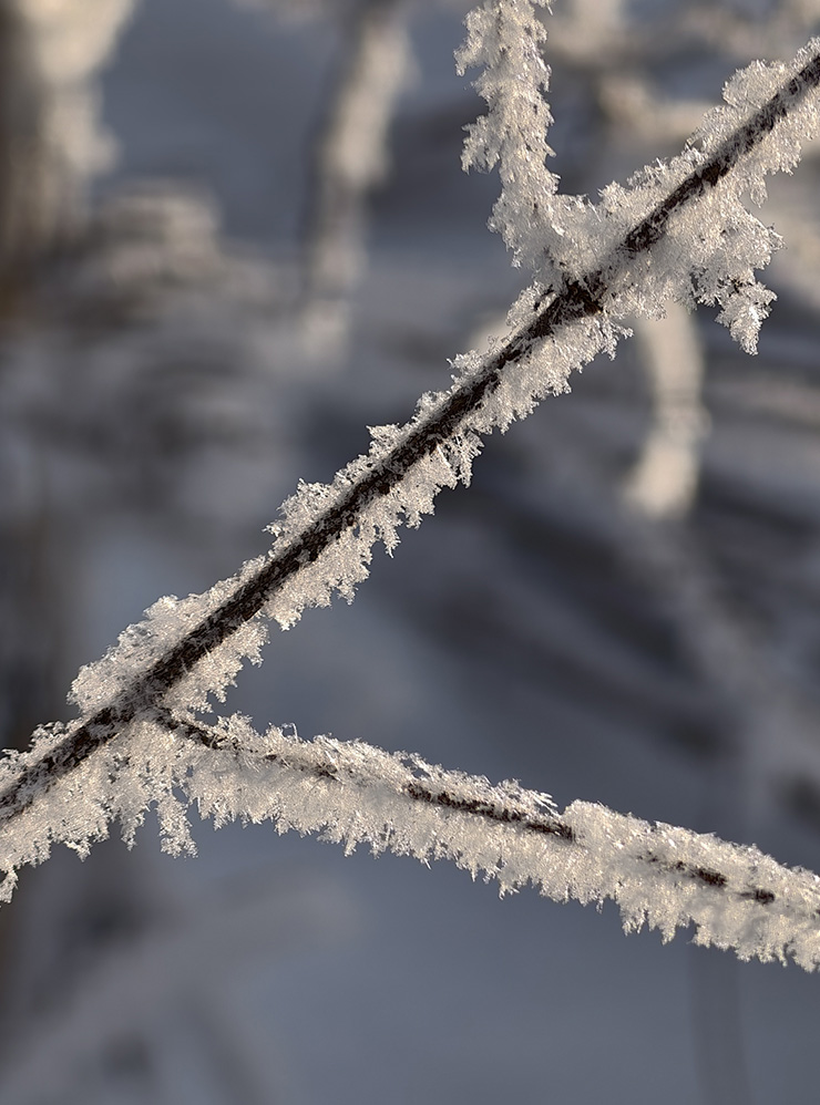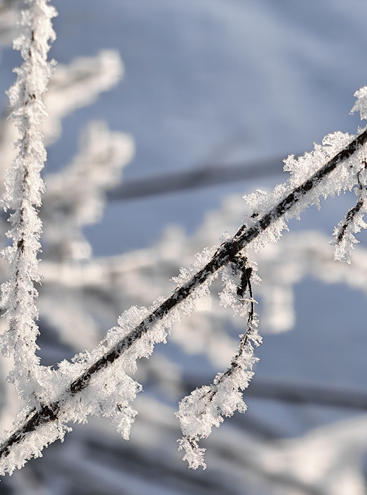 Намного лучше смотрятся кадры, сделанные с большим приближением с расстояния около полутора метров — на снимках очень тонких заиндевевших веток хорошо заметно, насколько четко и детально передана каждая снежинка.