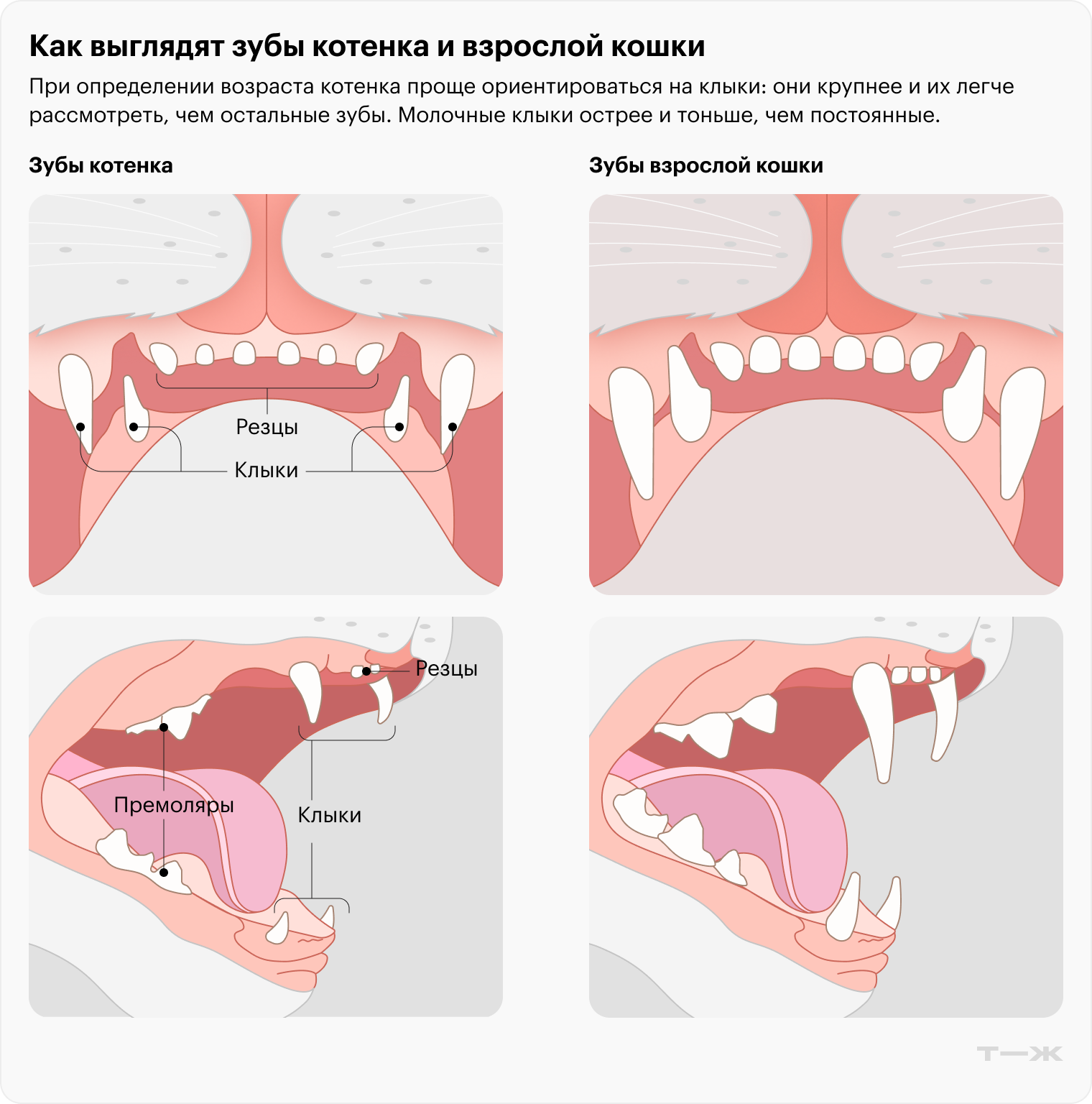 Зубы — одна из самых надежных подсказок. Они помогут определить, какого возраста зверь. У кошек, как и у людей, сначала появляются молочные зубы, которые в возрасте 3,5—7 месяцев постепенно сменяются постоянными. В норме у взрослой кошки 30 зубов: 16 сверху и 14 снизу. У котят — 26 молочных: 14 сверху и 12 снизу.