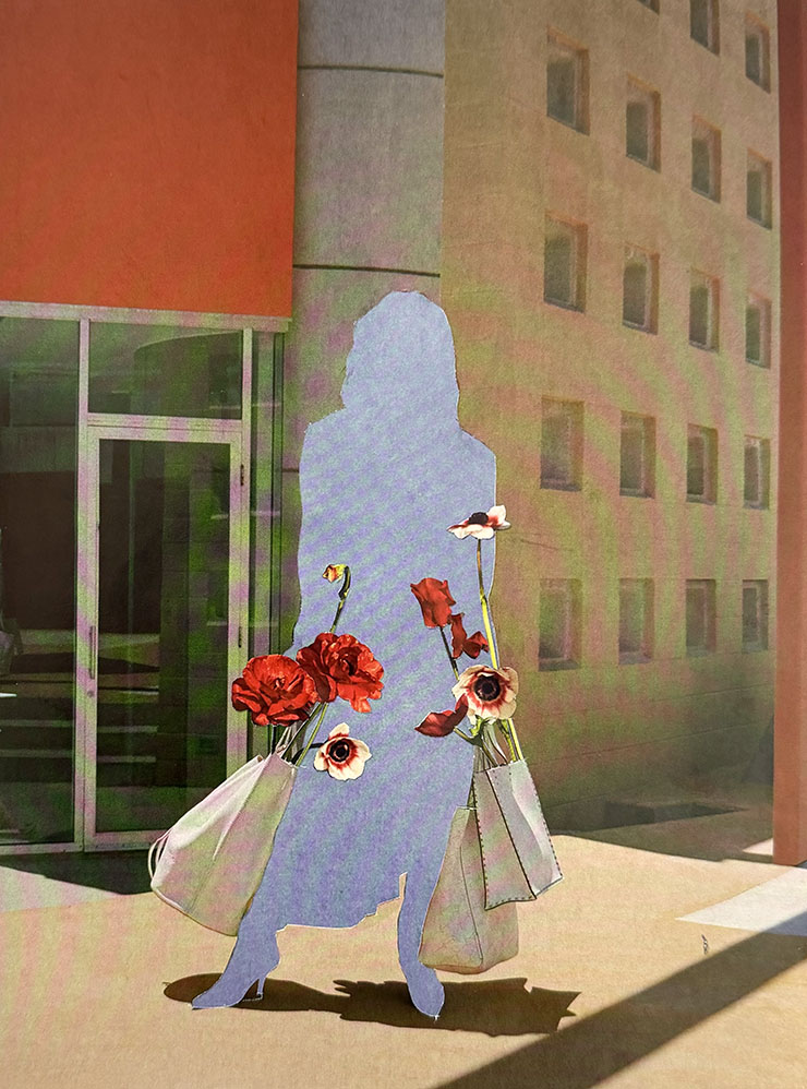 Я хотела сделать открытку для подруги и отразить в ней мысль, что женщины сильные и их сила может быть в хрупкости. Модель с сумками идеально подошла: она несет тяжелое, но важное. Чтобы подруга могла ассоциировать себя с героиней коллажа, вырезала модель и в силуэт вставила голубой фон: мне нравится сочетание голубого и красного. Еще вырезала и приклеила цветы: срезала стебли у края сумок.
