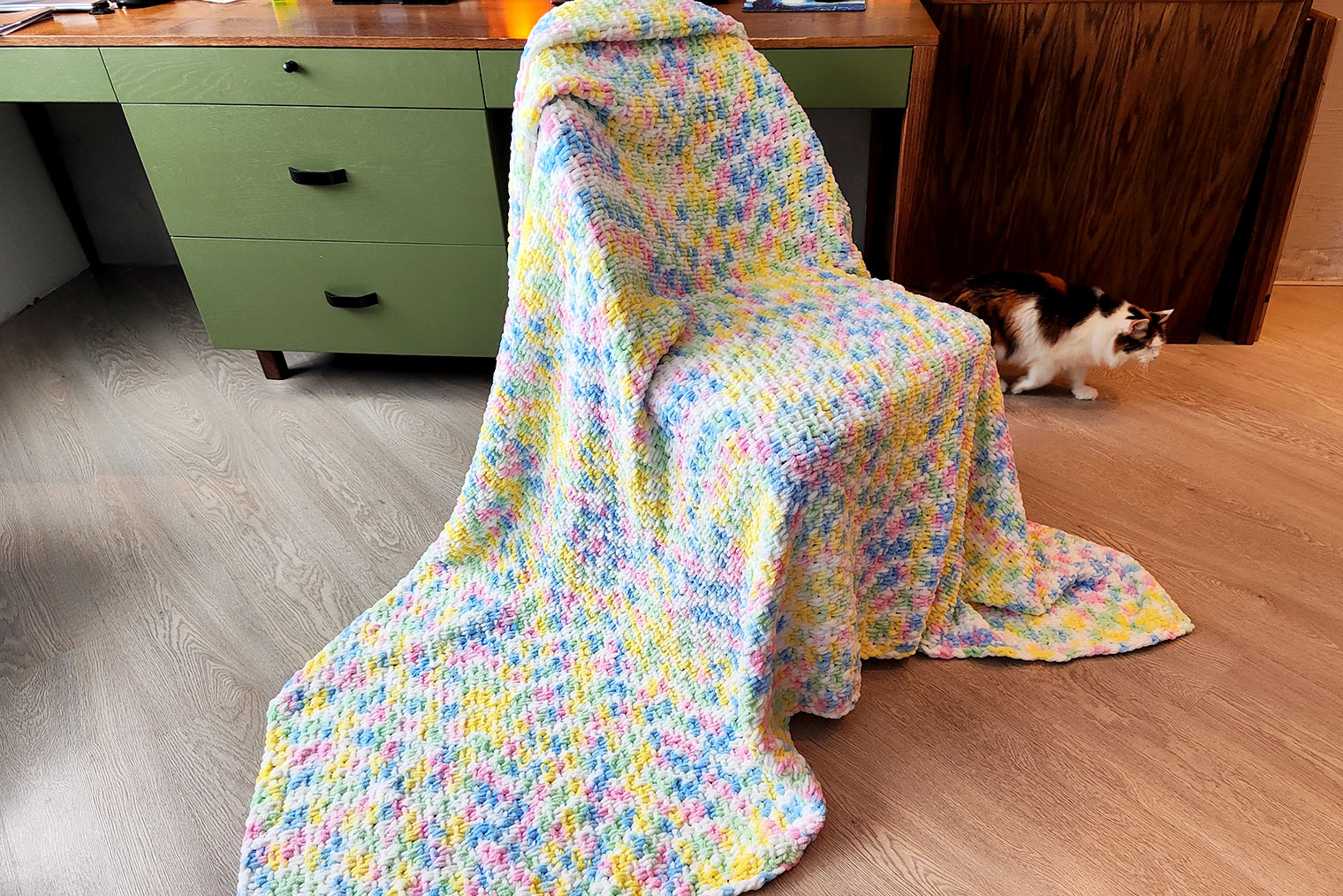 Размер пледа — 1,6 × 2 метра. Я связала его за шесть дней без спиц и крючка, только руками. Такой способ подойдет тем, кто хочет вязать быстро и без лишних инструментов. Плед получается плюшевым, теплым и тяжелым.
