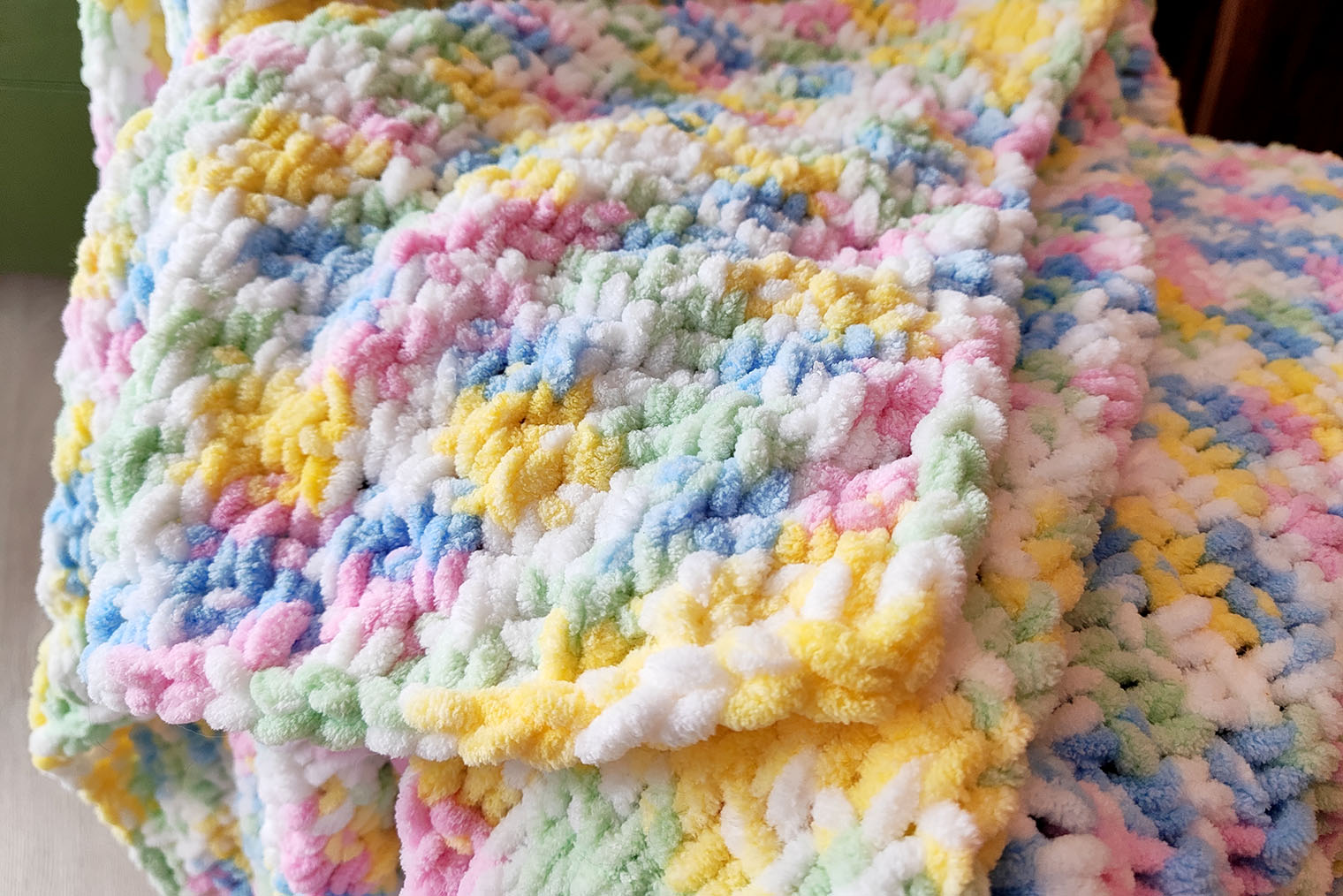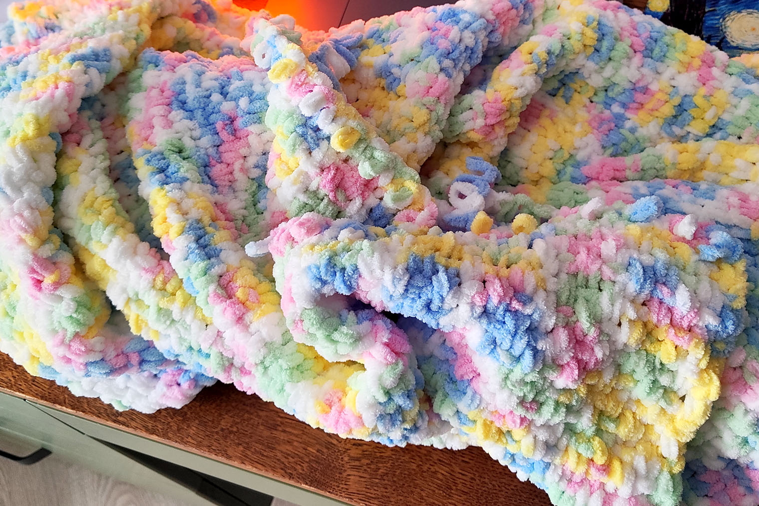 Понадобится специальная пряжа с петельками — купила ее на «Озоне». На мой размер ушло 16 мотков Alize Puffy Fine, которые по акции обошлись примерно в 2 500 ₽. Если брать пряжу Alize Puffy, на плед уйдет меньше времени, потому что размер петелек у нее в два раза больше.