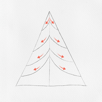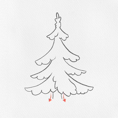 Такой рисунок делается на основе ели из первого способа. Сначала нарисуйте елку карандашом, как говорится там, но не закрашивайте ее — вместо этого переходите к инструкции ниже.