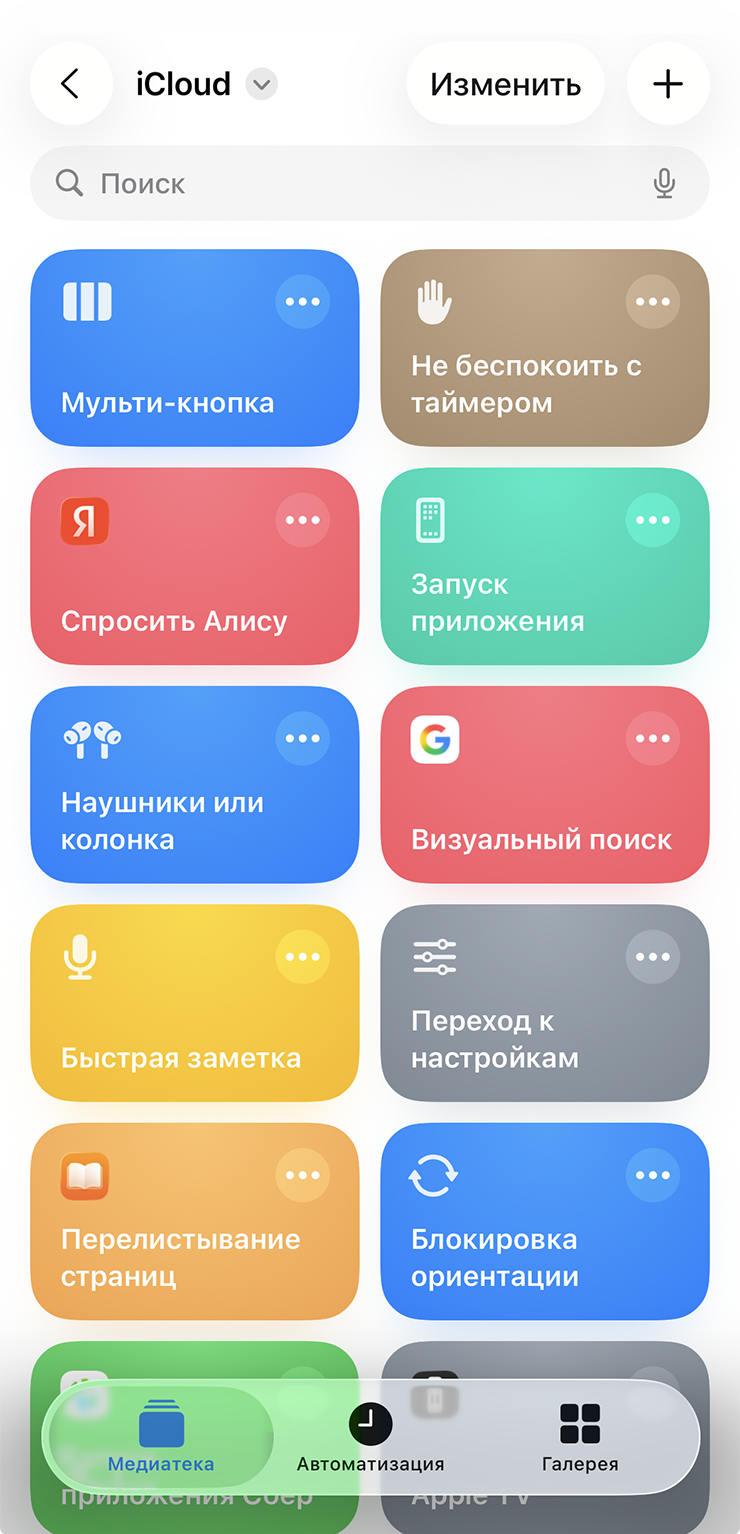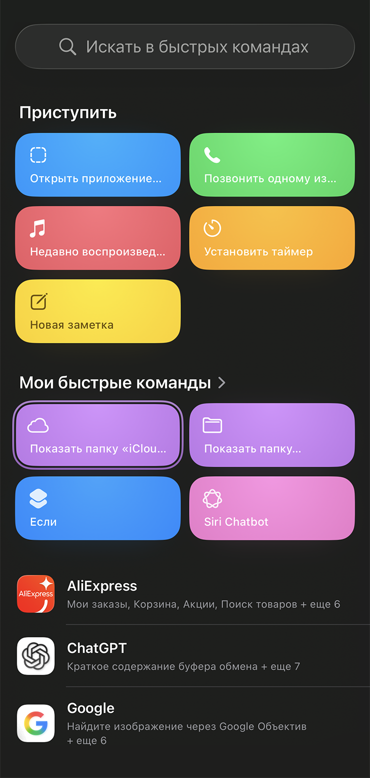 Последний пункт самый интересный. Можно запускать любой скрипт из приложения «Команды». Оно предустановлено на Айфоне из коробки, а если удалили, можно скачать из App Store.