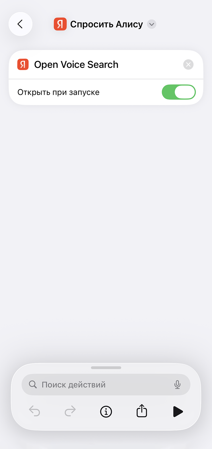 Добавьте команду «Спросить Алису» и установите апп Яндекса. После запуска команды можно сразу диктовать запрос голосовому ассистенту и видеть ответ в приложении.