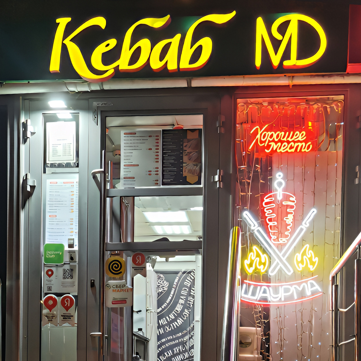 Поесть можно внутри за столиками, а с пятницы по воскресенье — забрать шаурму через окошко выдачи, оно работает до пяти утра.