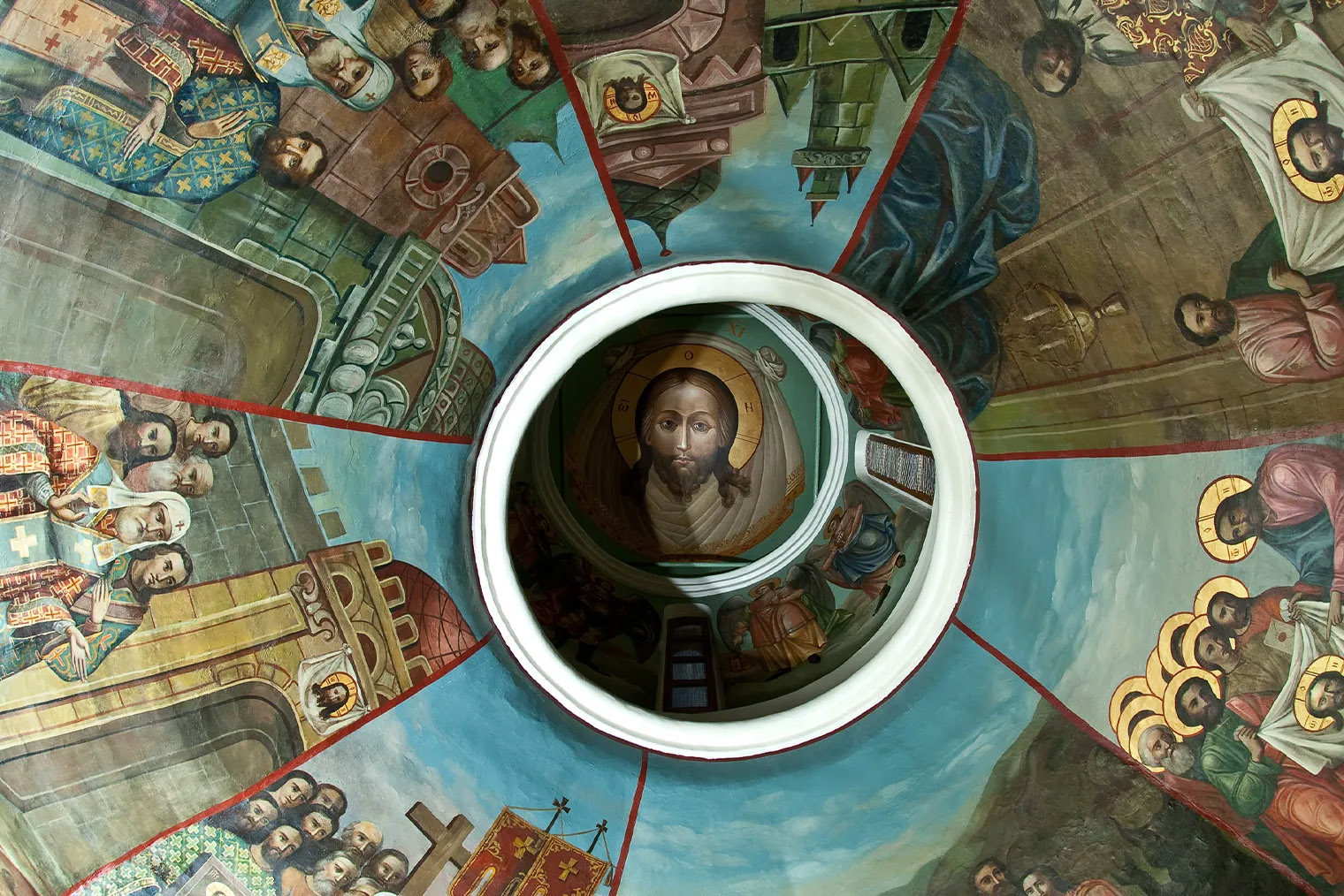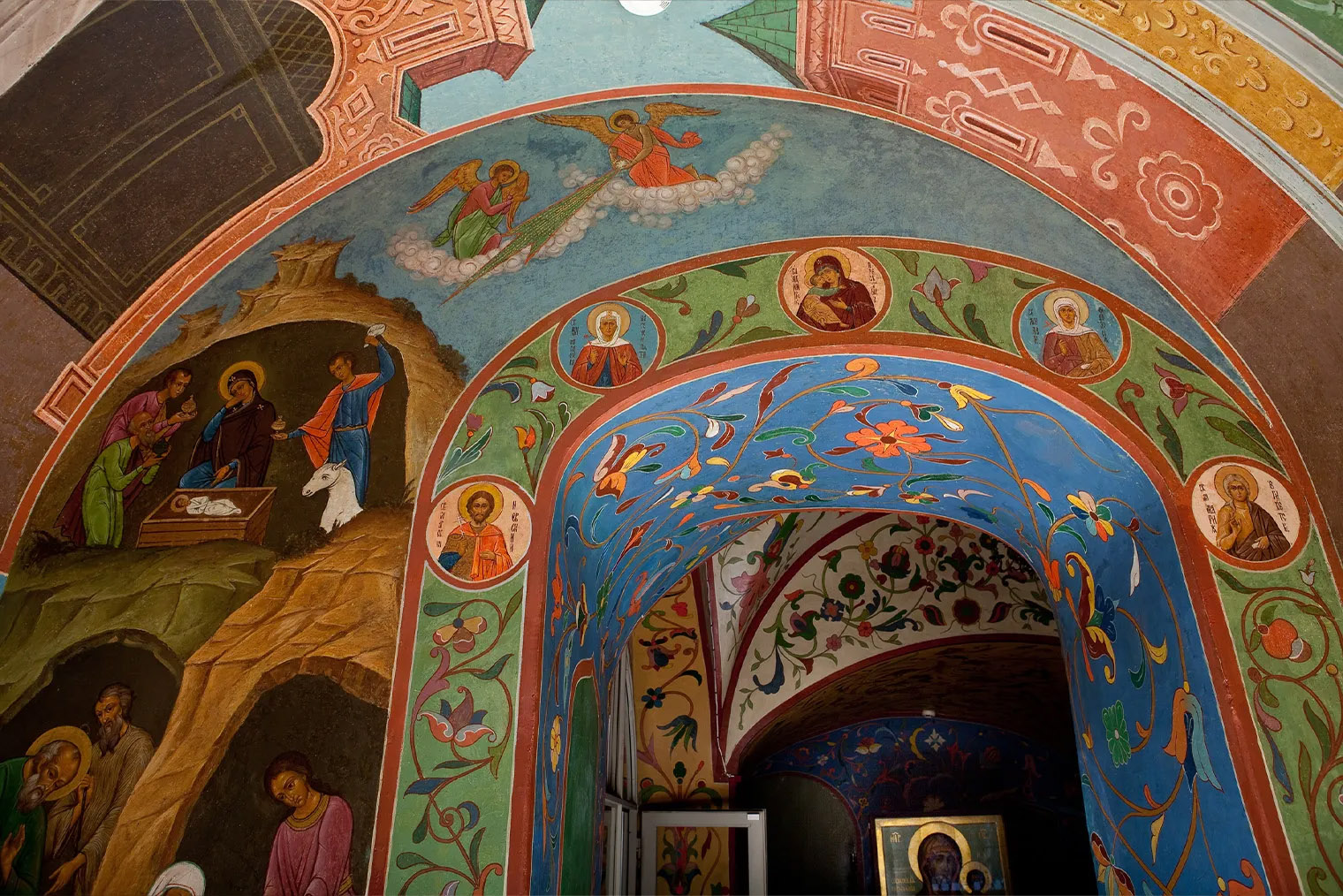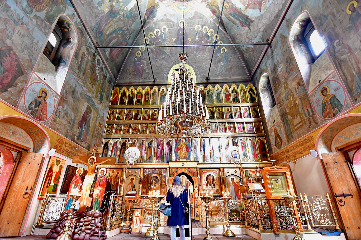 Этажом выше расположены молельные залы, собрания икон и фресок. Туда попадают по узкой винтовой лестнице, для маломобильных посетителей она не приспособлена.