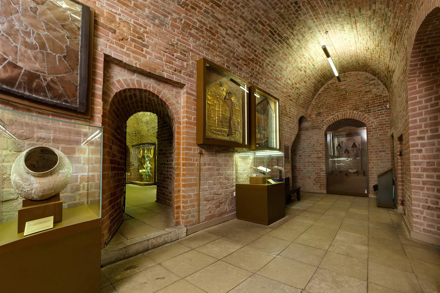На первом этаже действует музей, где хранятся рукописи и первые печатные книги, керамика, металлические вериги — тяжелые цепи и обручи, которые надевали для самоистязания в честь преданности богу. Еще здесь можно увидеть хоругви начала 20 века — полотнища с изображением святых, которые носили при церковных шествиях.