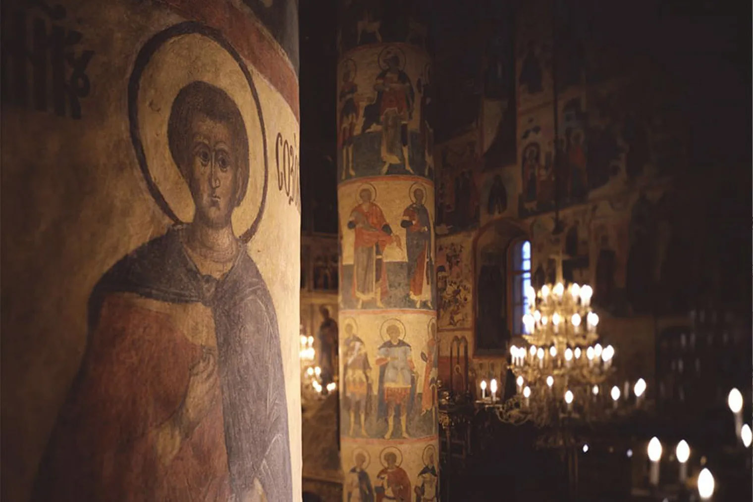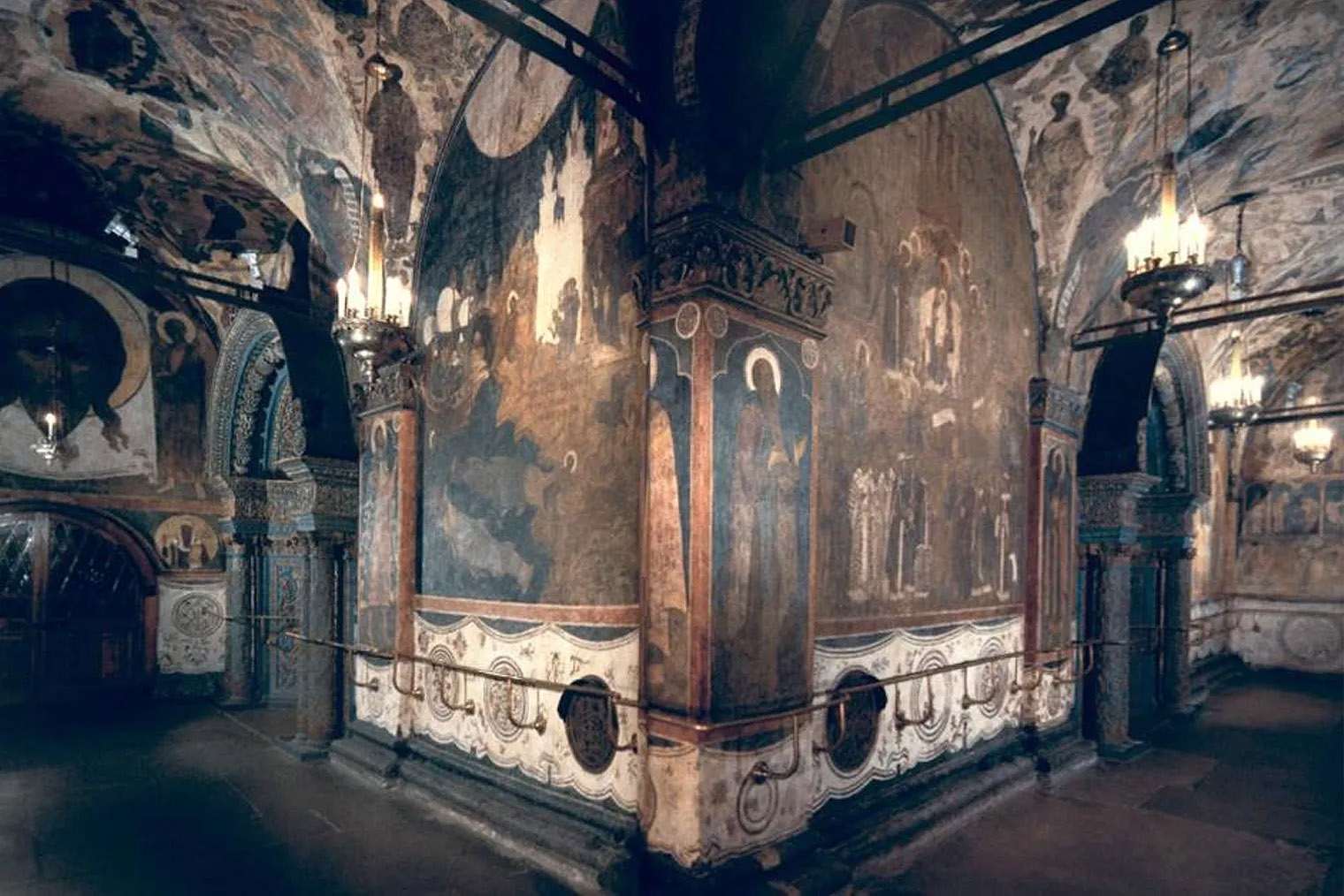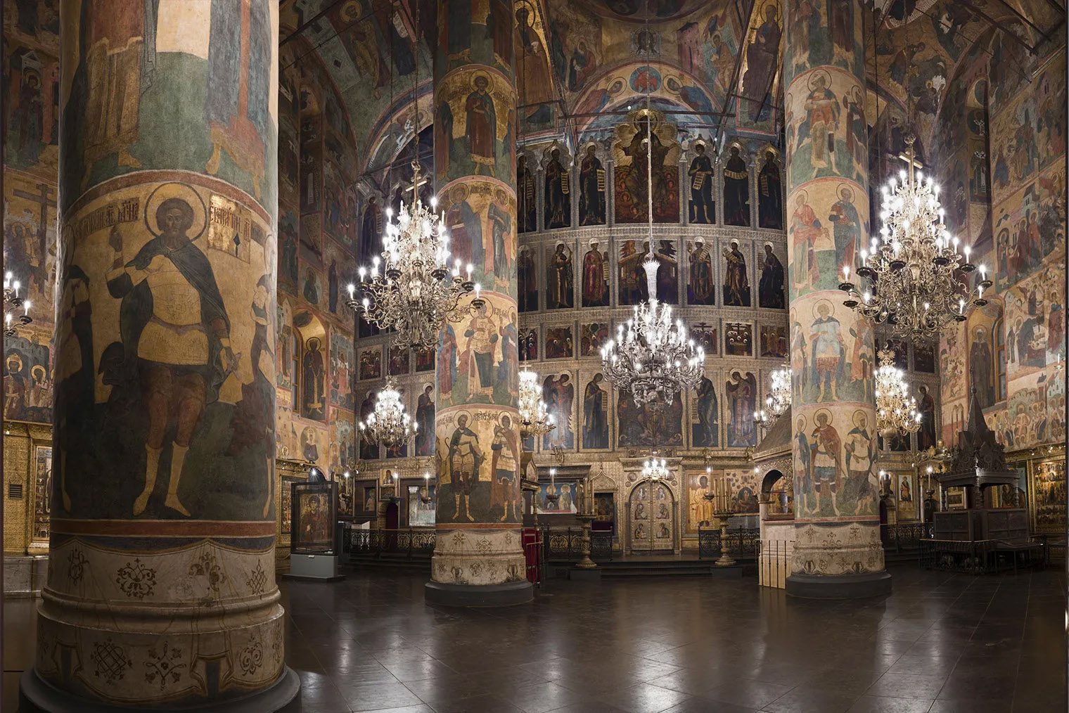 В соборе находится древнейший сохранившийся в России высокий иконостас. Авторами изображений святых на нем считают Андрея Рублева и Феофана Грека. Правда, некоторые историки оспаривают принадлежность фресок и икон кисти прославленных мастеров. Но это не умаляет их ценности, тем более росписи отлично сохранились.