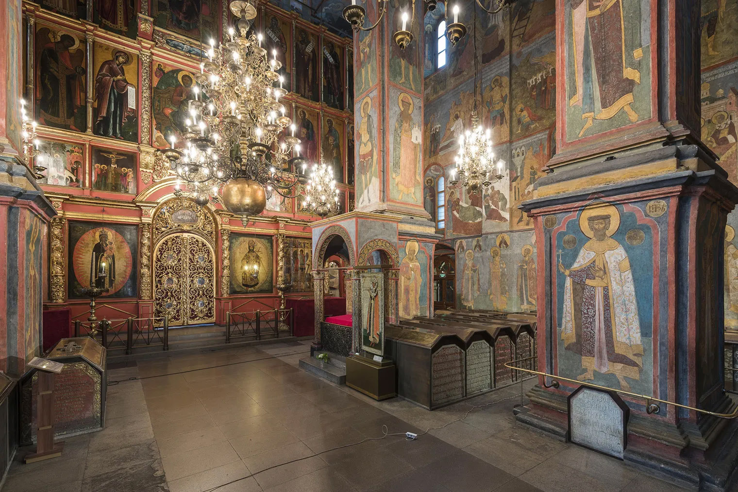 Советую зайти в Архангельский собор: он не похож на гармоничный Успенский или сияющий Благовещенский. Этот храм более строгий, сдержанный, с красными парадными стенами и росписями на них. По фрескам 17 века на его стенах можно учить историю России: на уровне глаз изображены более 60 портретов русских князей, среди них — Дмитрий Донской, Василий Третий, Иван Калита.