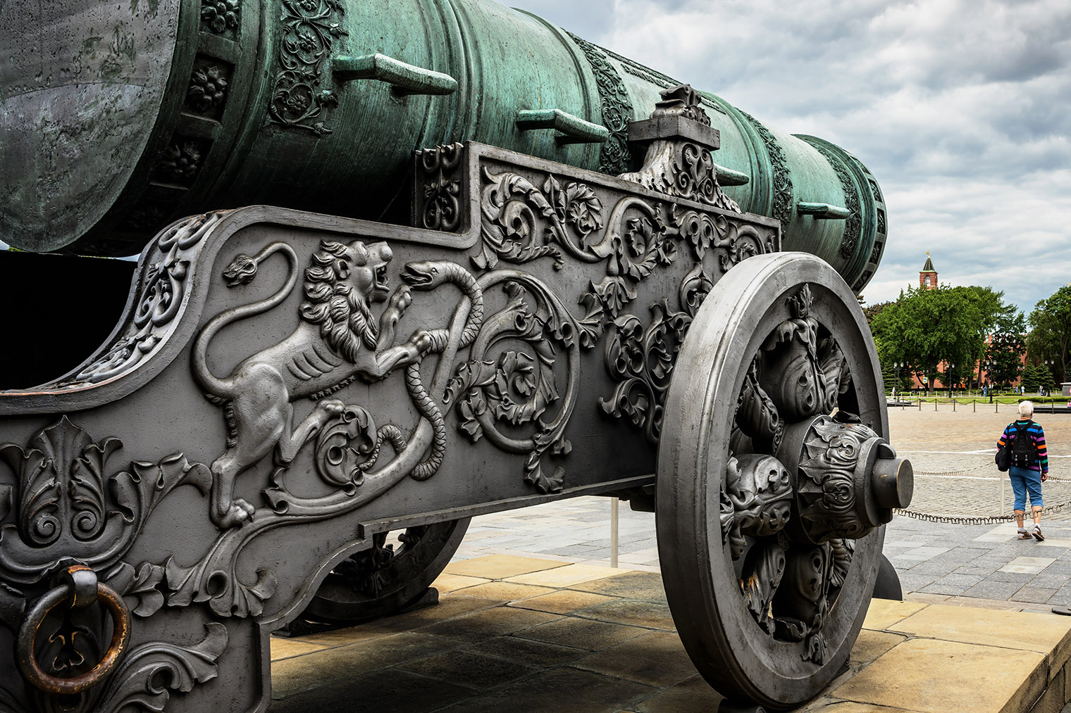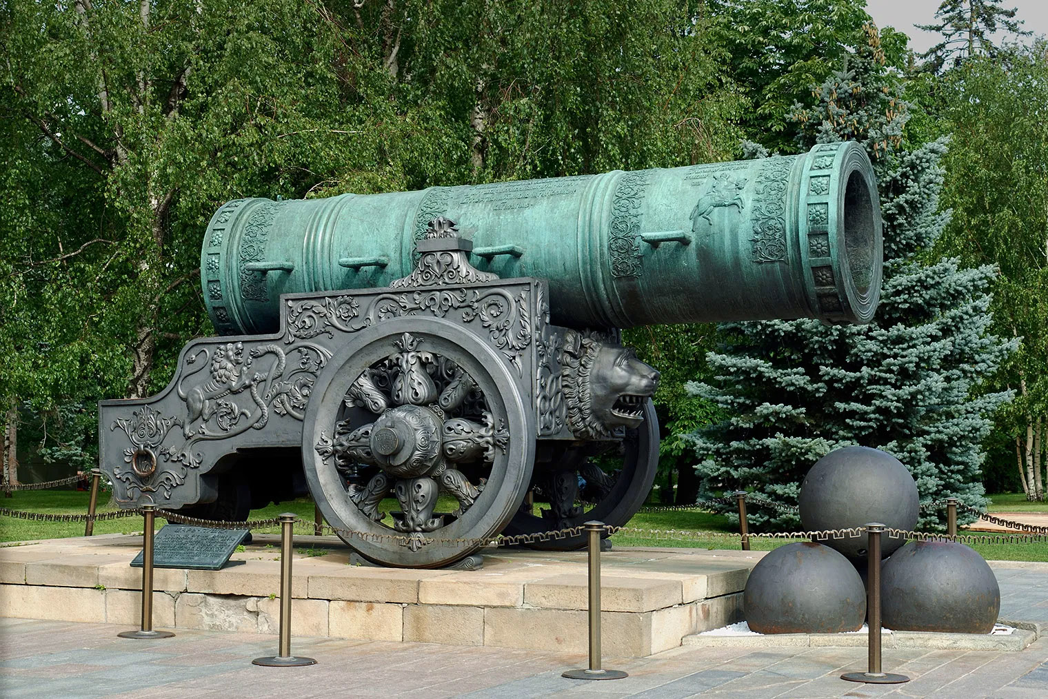 Бронзовая Царь-пушка — один из самых знаменитых памятников Московского Кремля. Ее вес — более 39 тонн, длина — 5,3 метра, диаметр ствола — 1,2 метра, а размер калибра — 890 миллиметров. Благодаря ему пушка попала в Книгу рекордов Гиннесса.