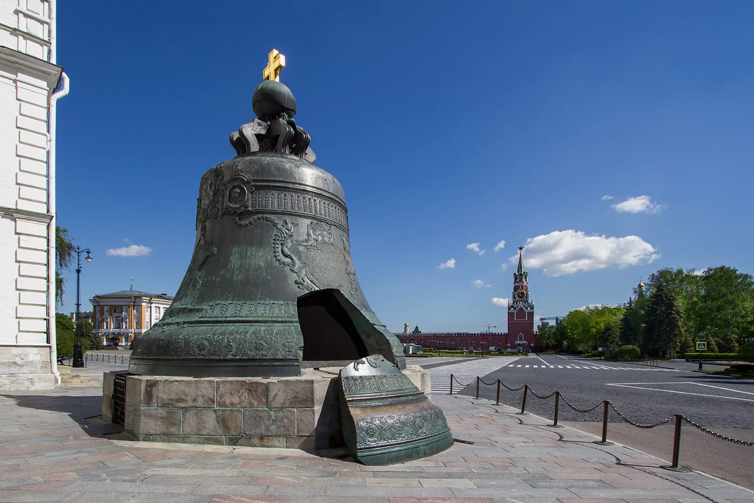 Неподалеку от Царь-пушки расположился еще один памятник русского литейного мастерства. Царь-колокол отлили по приказу императрицы Анны Иоанновны в 1733—1735 годах — на память потомкам о ее царствовании. В отличие от пушки, которую рассчитывали использовать по назначению, колокол сразу изготовили как огромный сувенир: его высота с перемычкой — 6,142 метра, диаметр — 6,6 метра, а масса — 202 тонны.