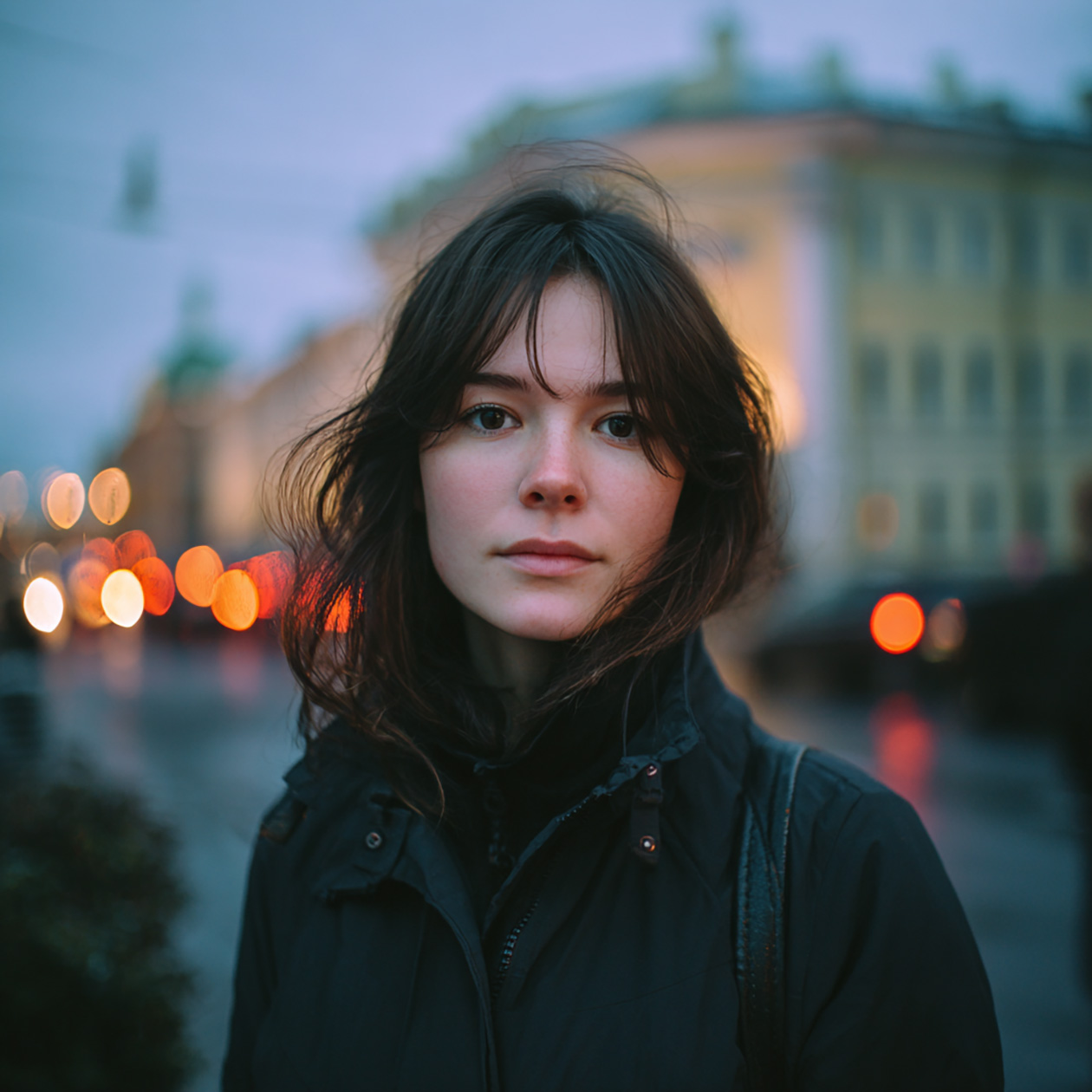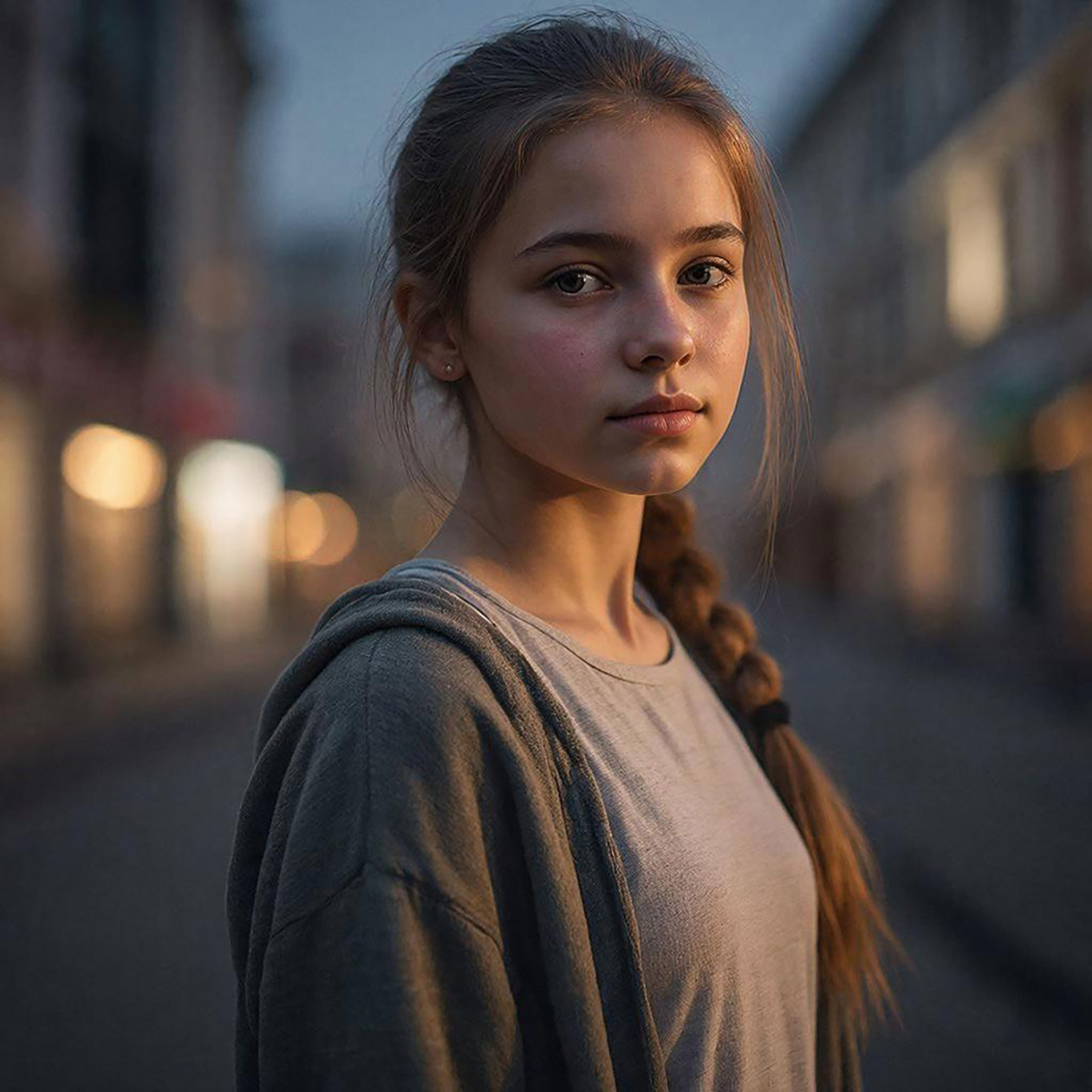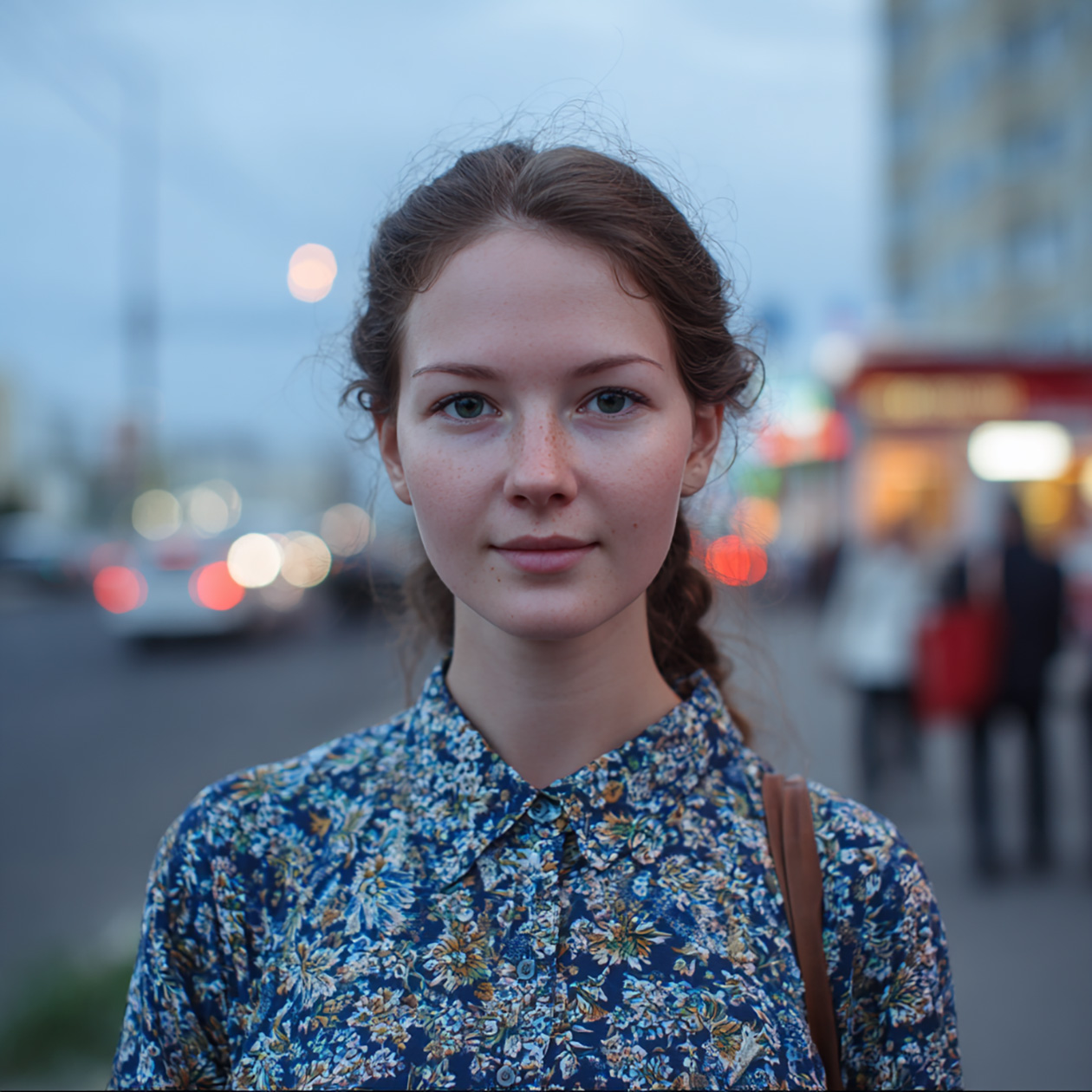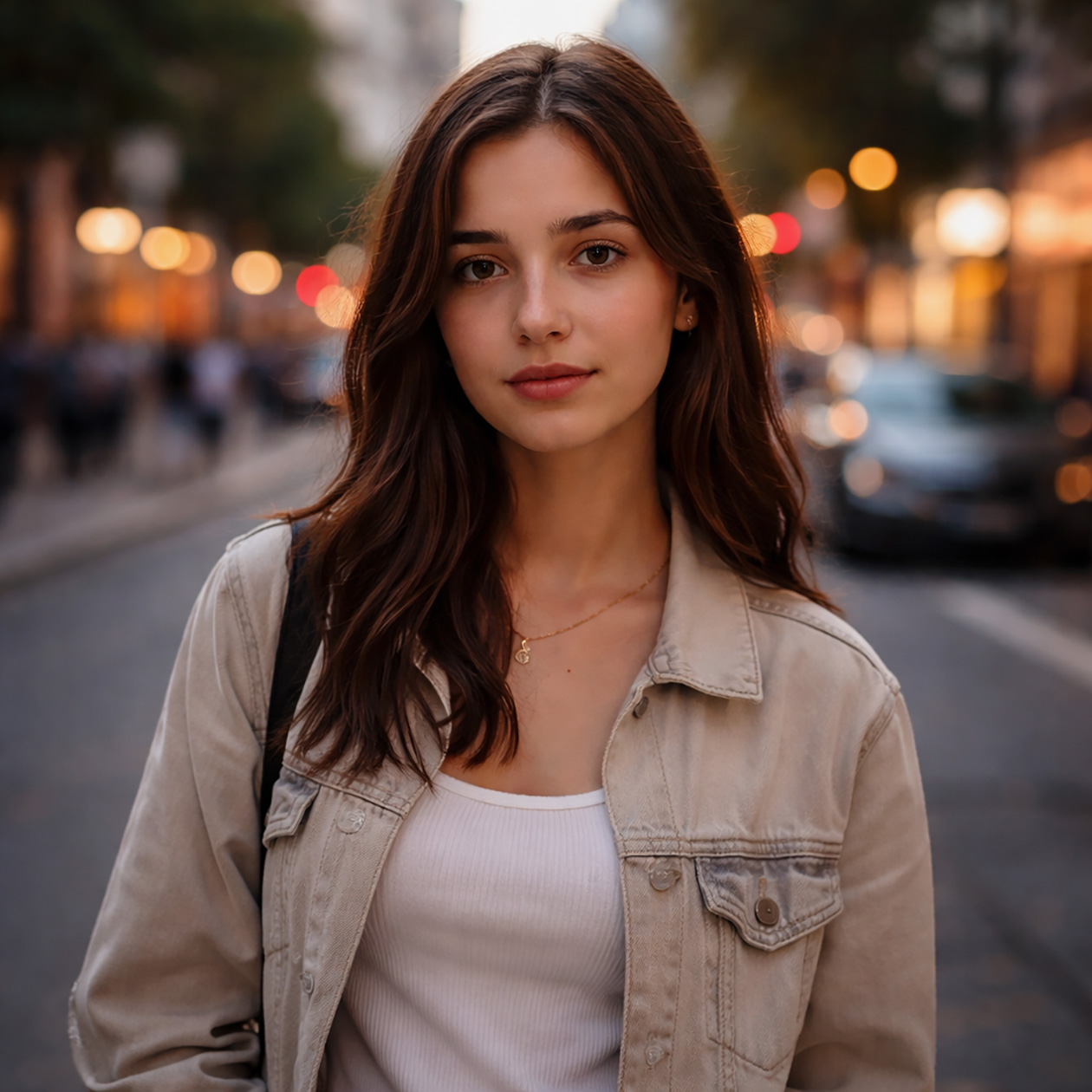 - A realistic portrait of a young woman standing on a city street in the evening, soft natural light, casual clothes, calm expression.