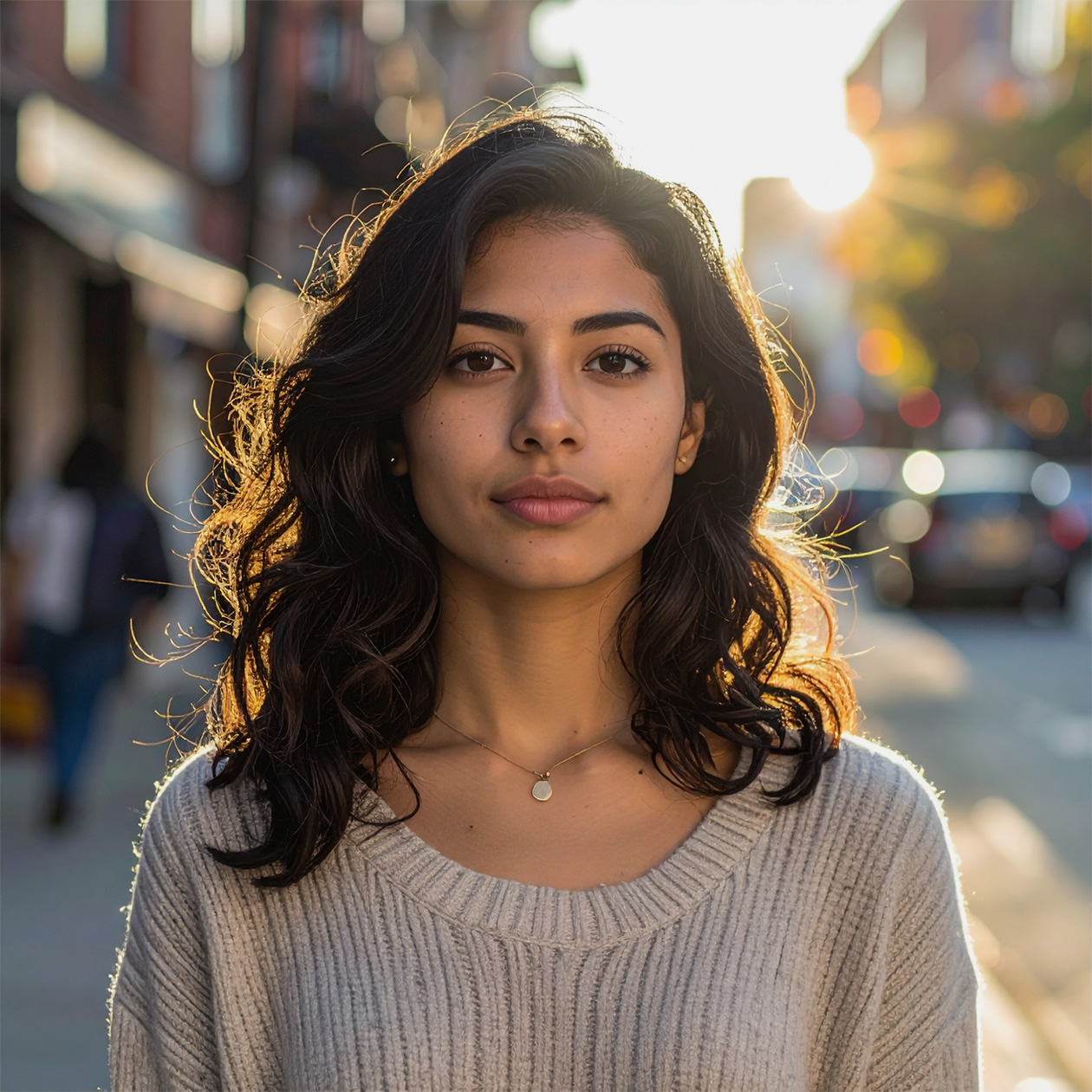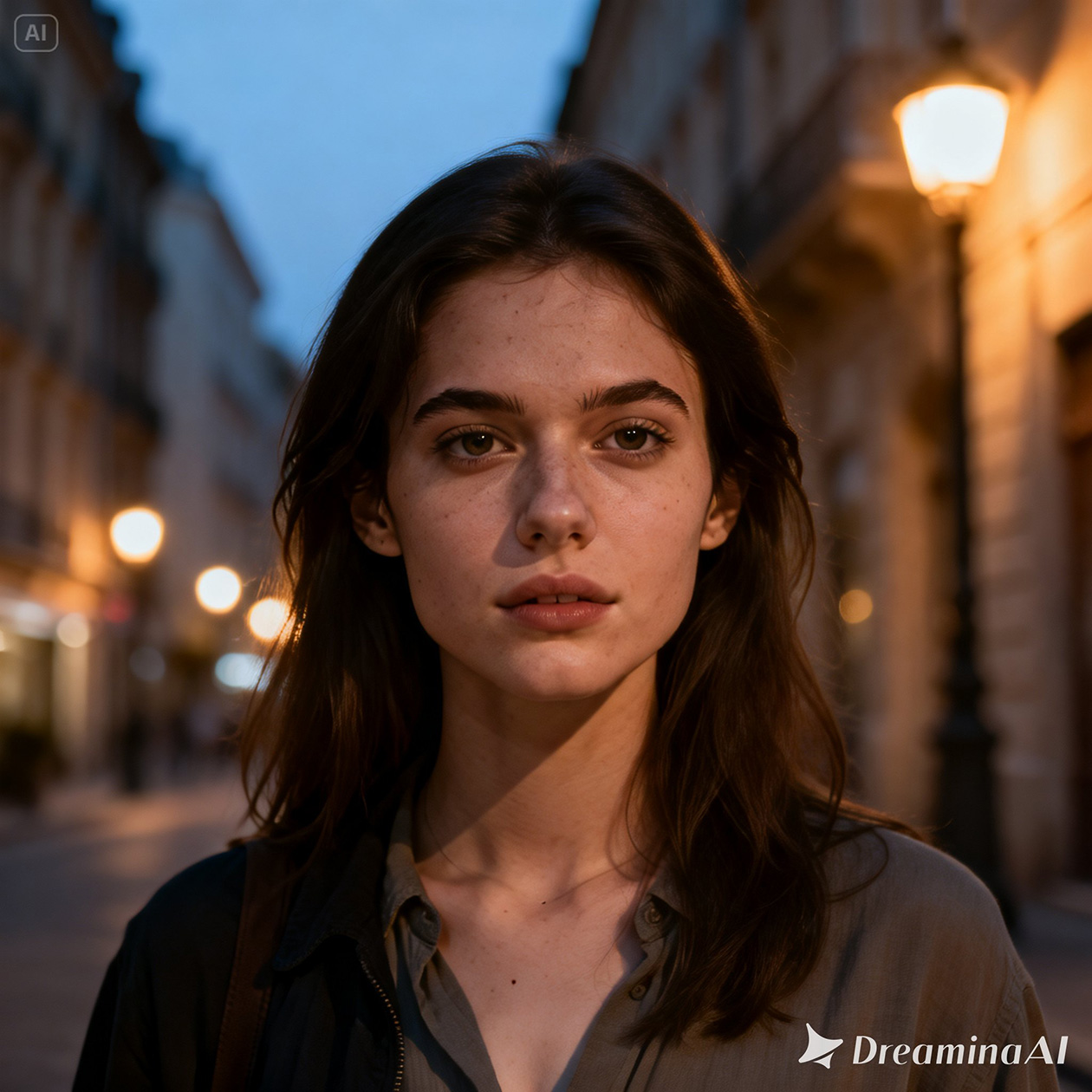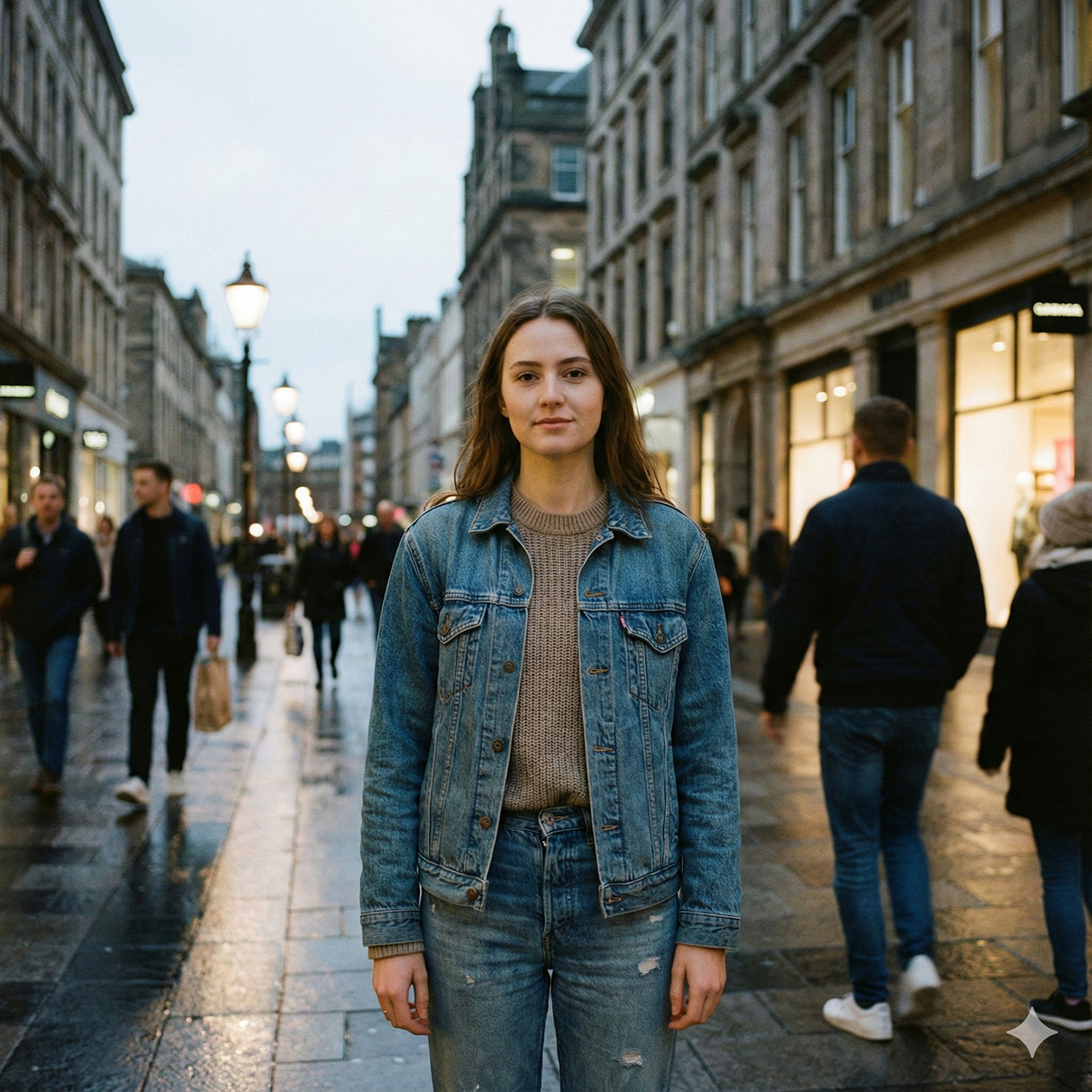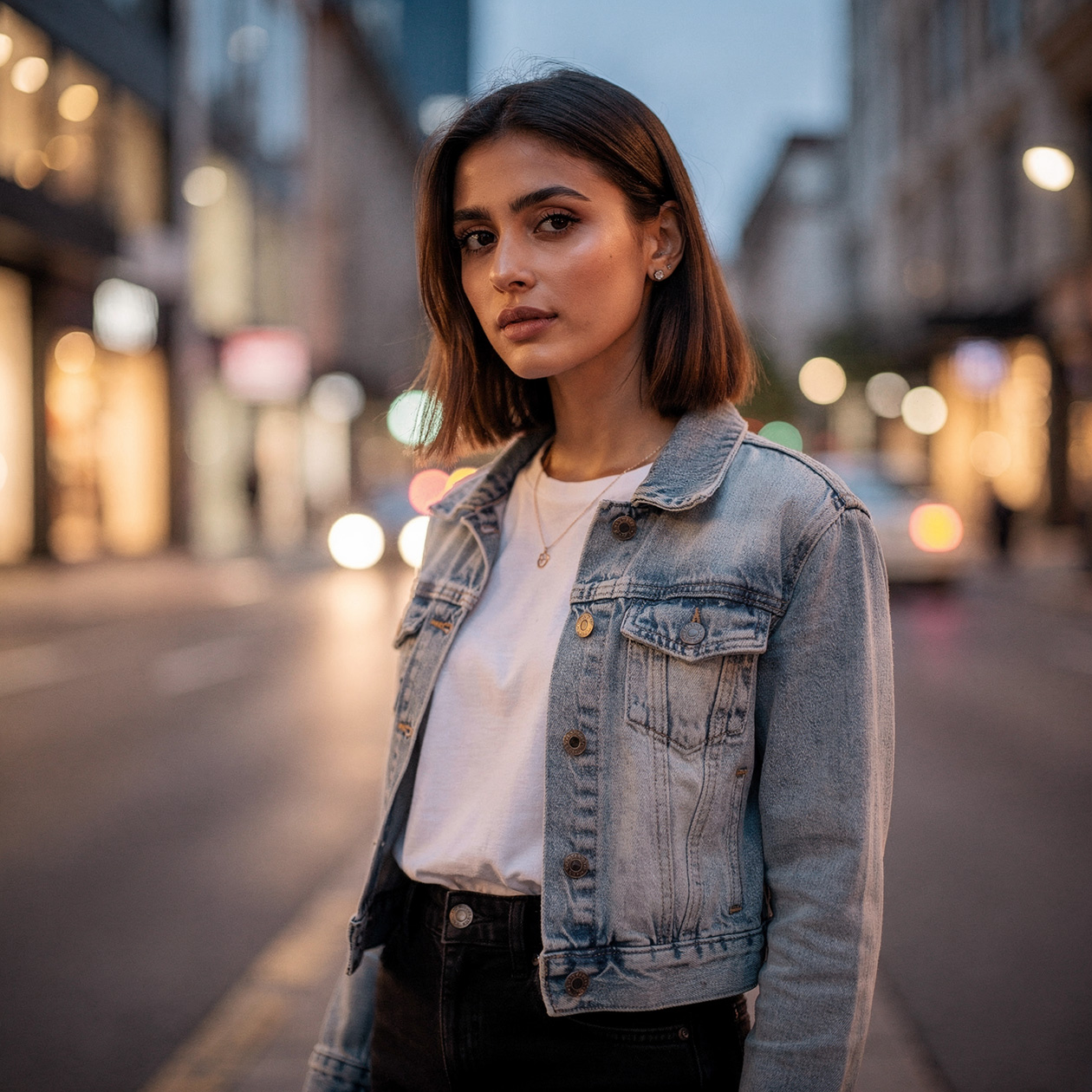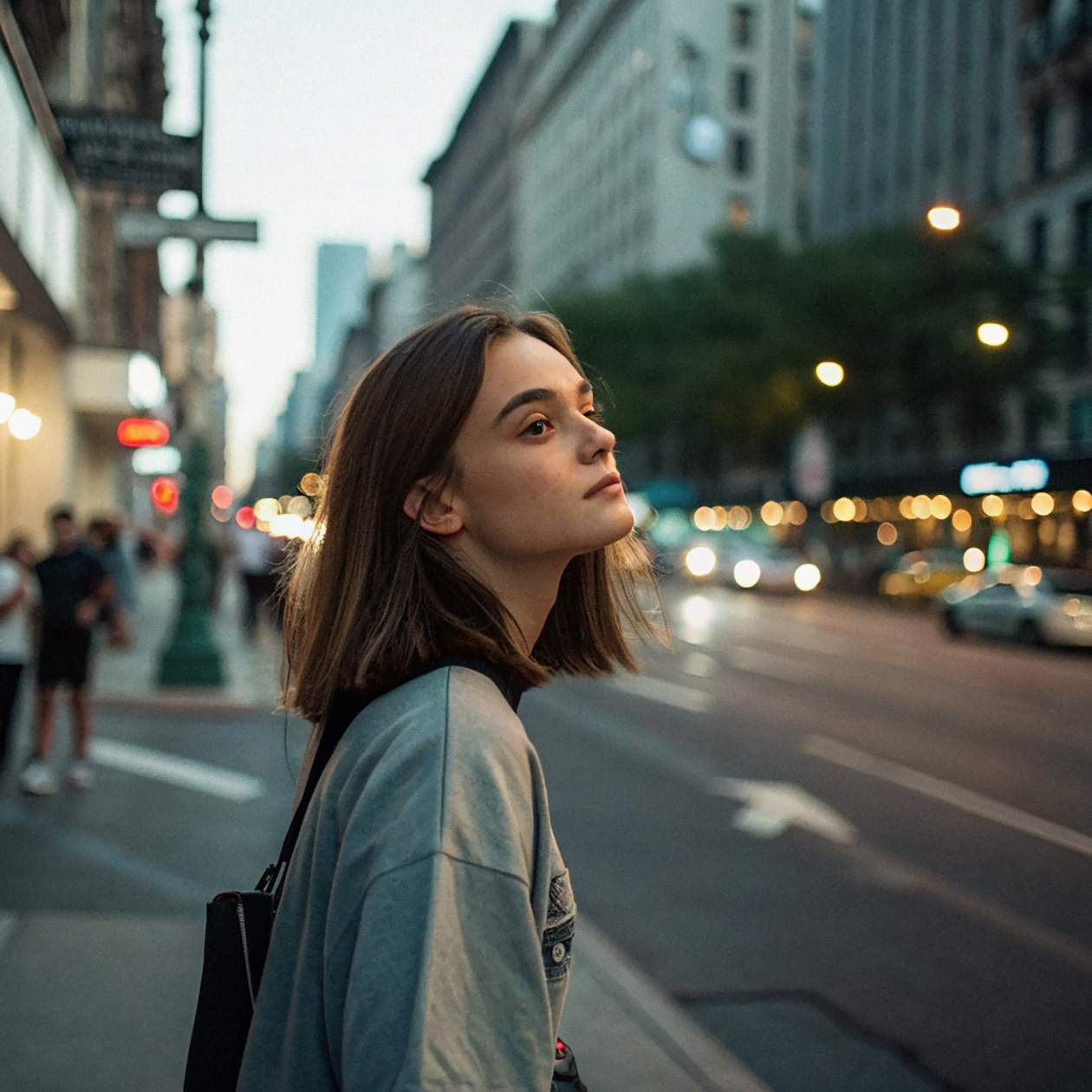 - A realistic portrait of a young woman standing on a city street in the evening, soft natural light, casual clothes, calm expression.
