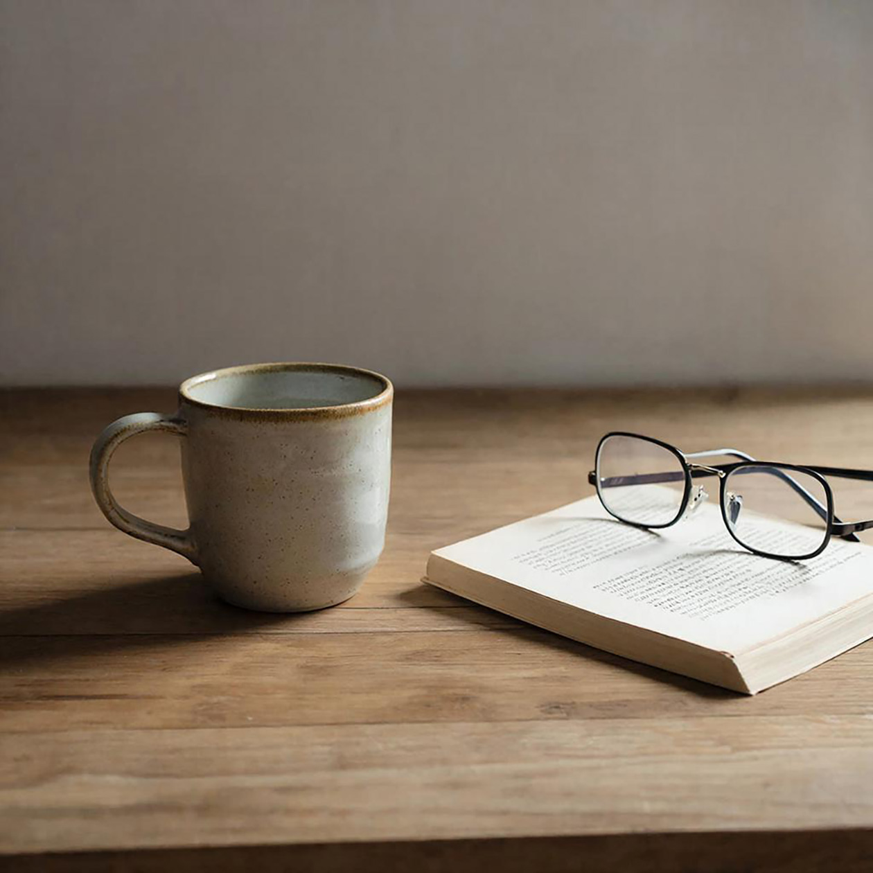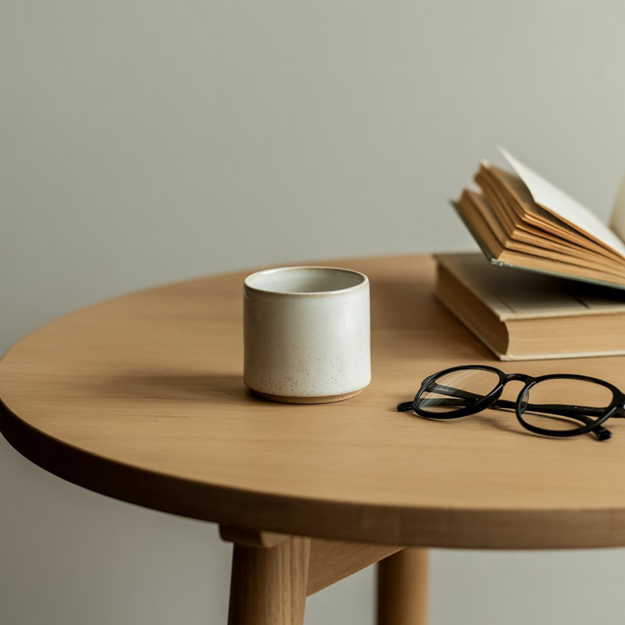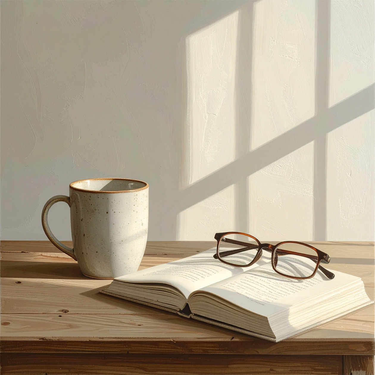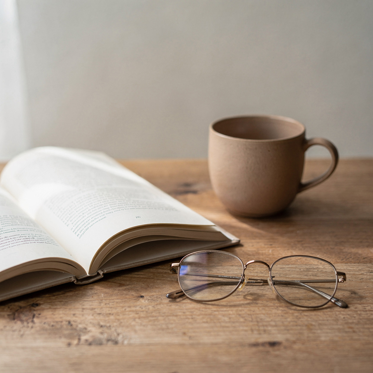 - A minimalist still life of a ceramic cup, an open book and a pair of glasses on a wooden table, soft daylight, clean and calm atmosphere.