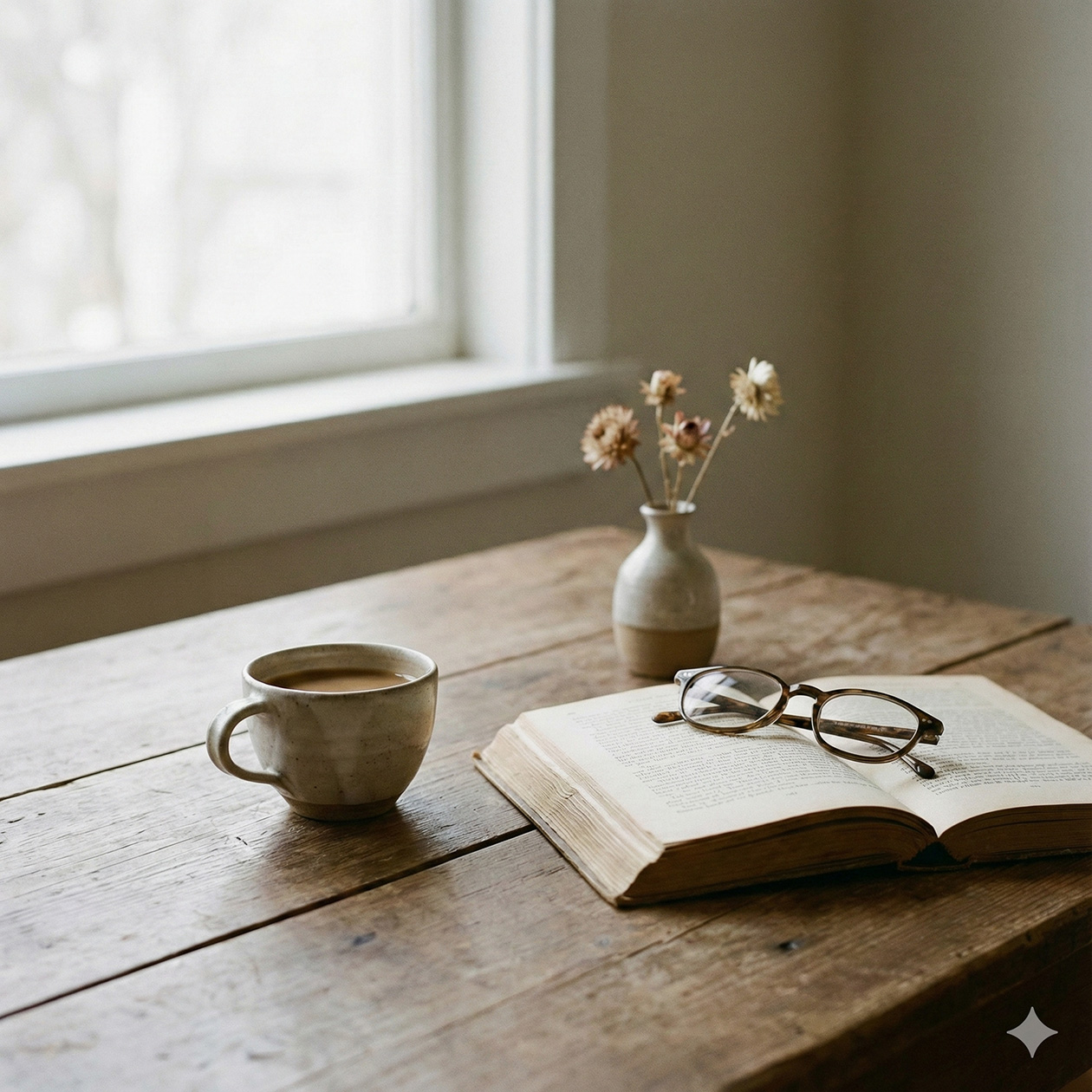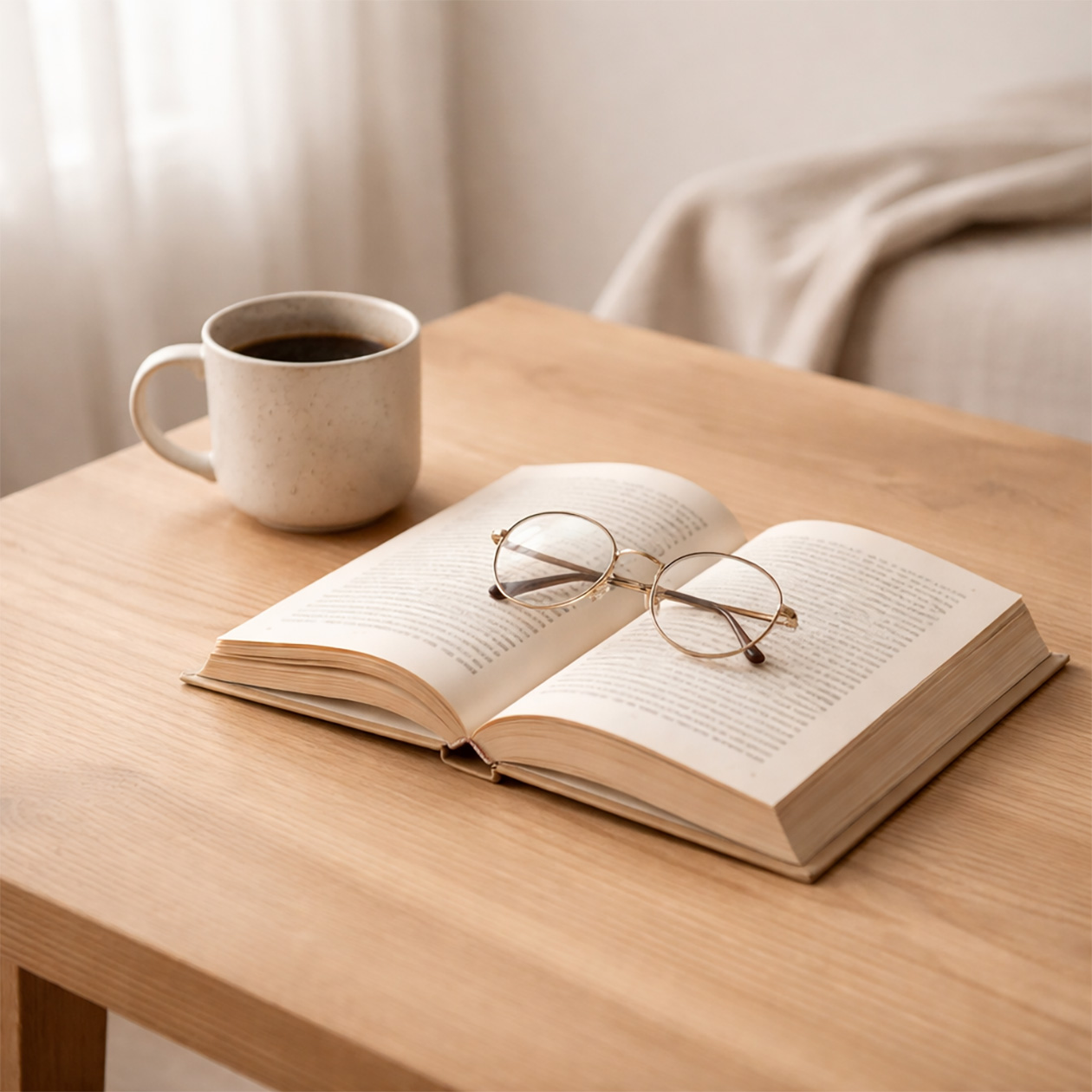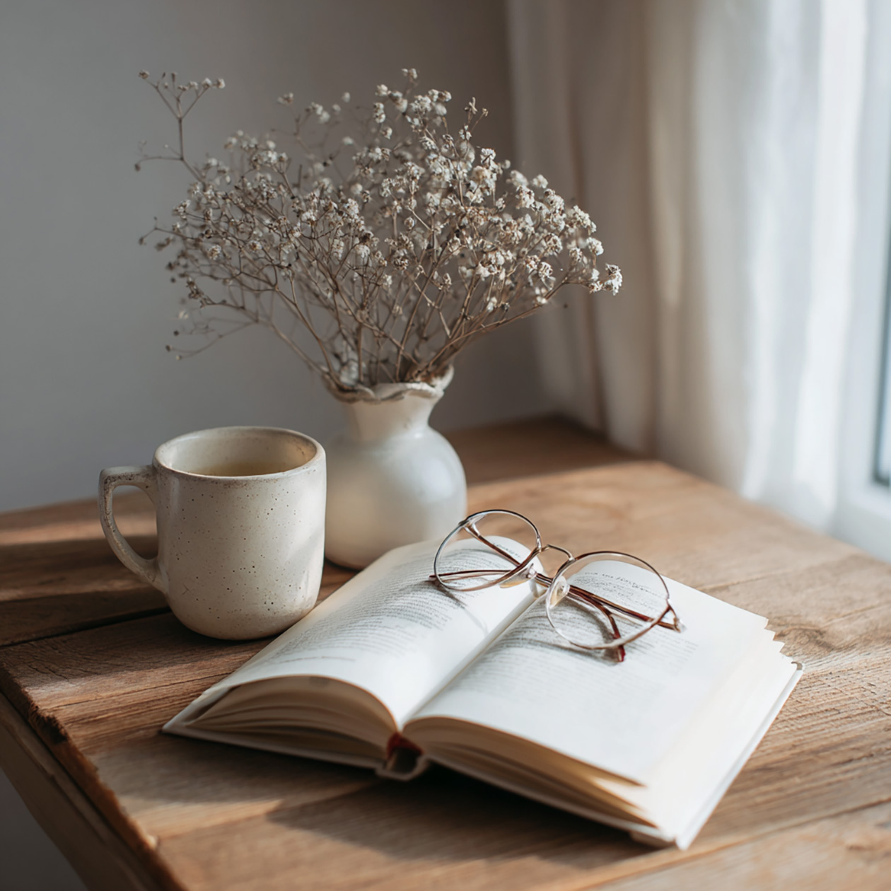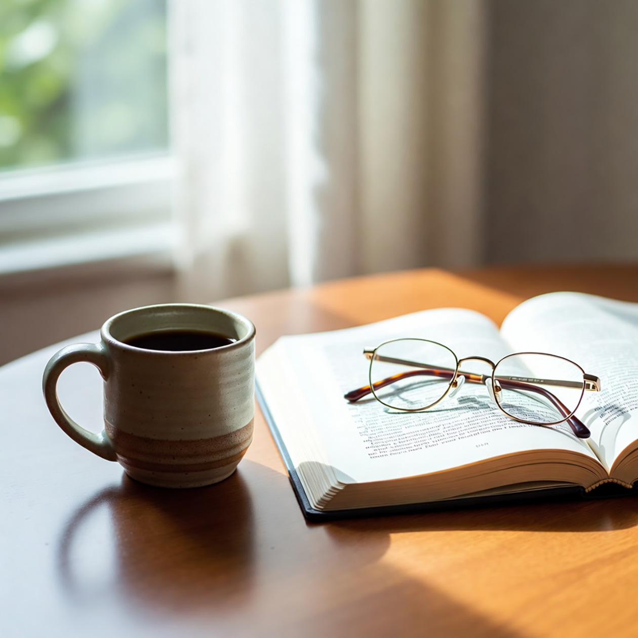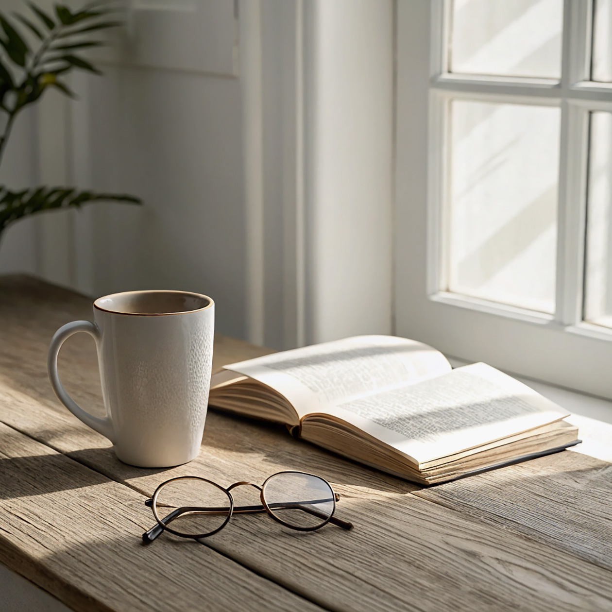 - A minimalist still life of a ceramic cup, an open book and a pair of glasses on a wooden table, soft daylight, clean and calm atmosphere.