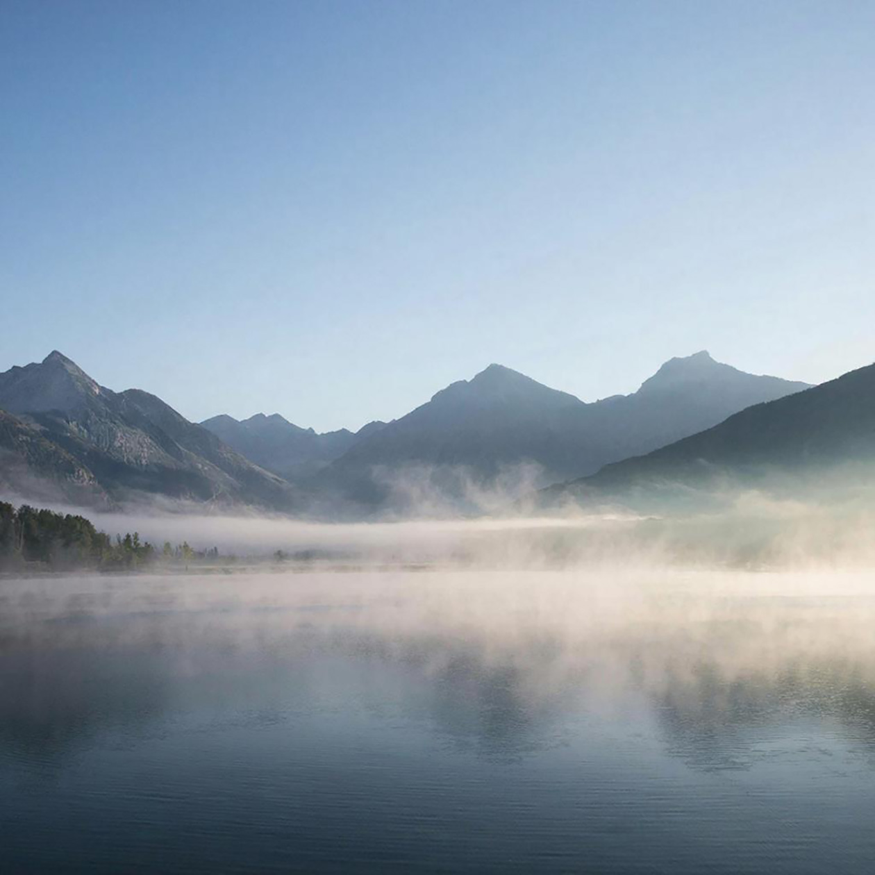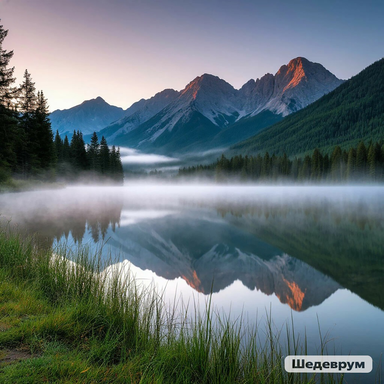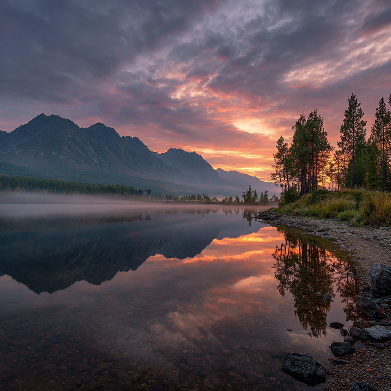 - Пейзаж широким планом с горами и озером на рассвете, легкий туман над водой, натуральные цвета, спокойный и реалистичный вид.