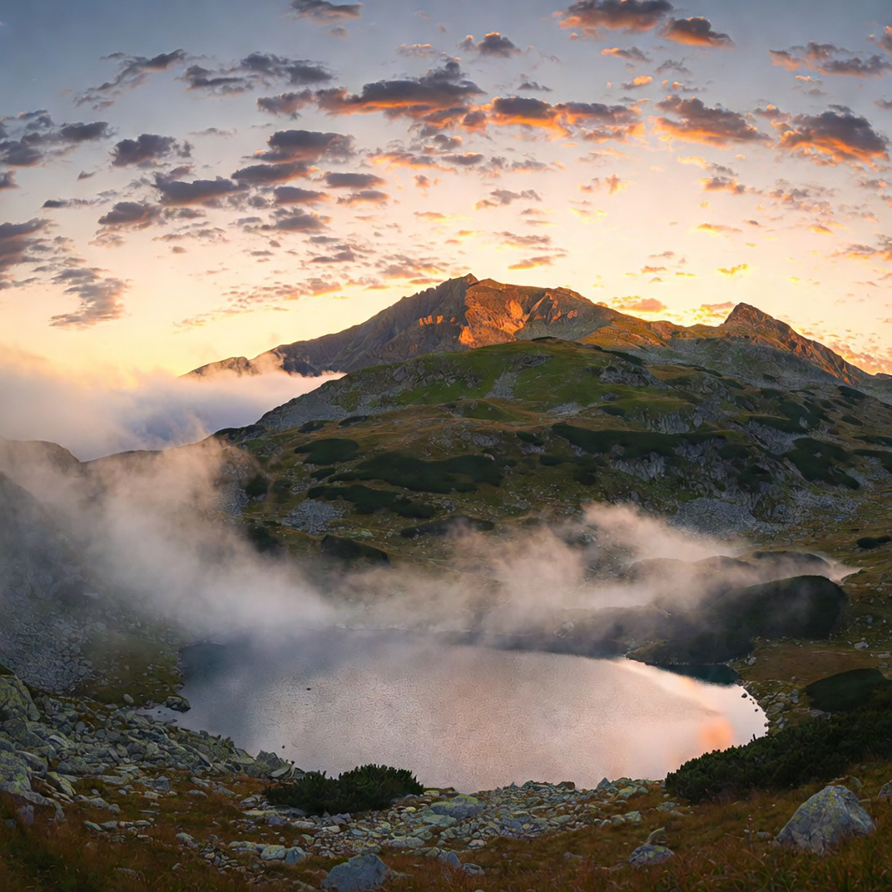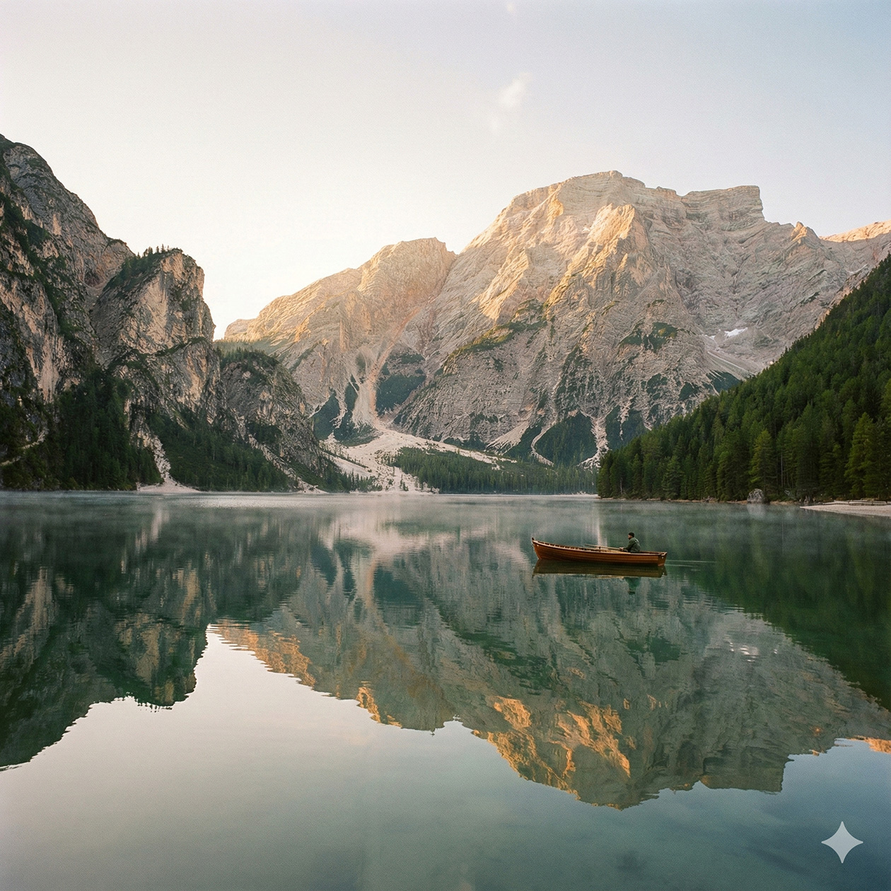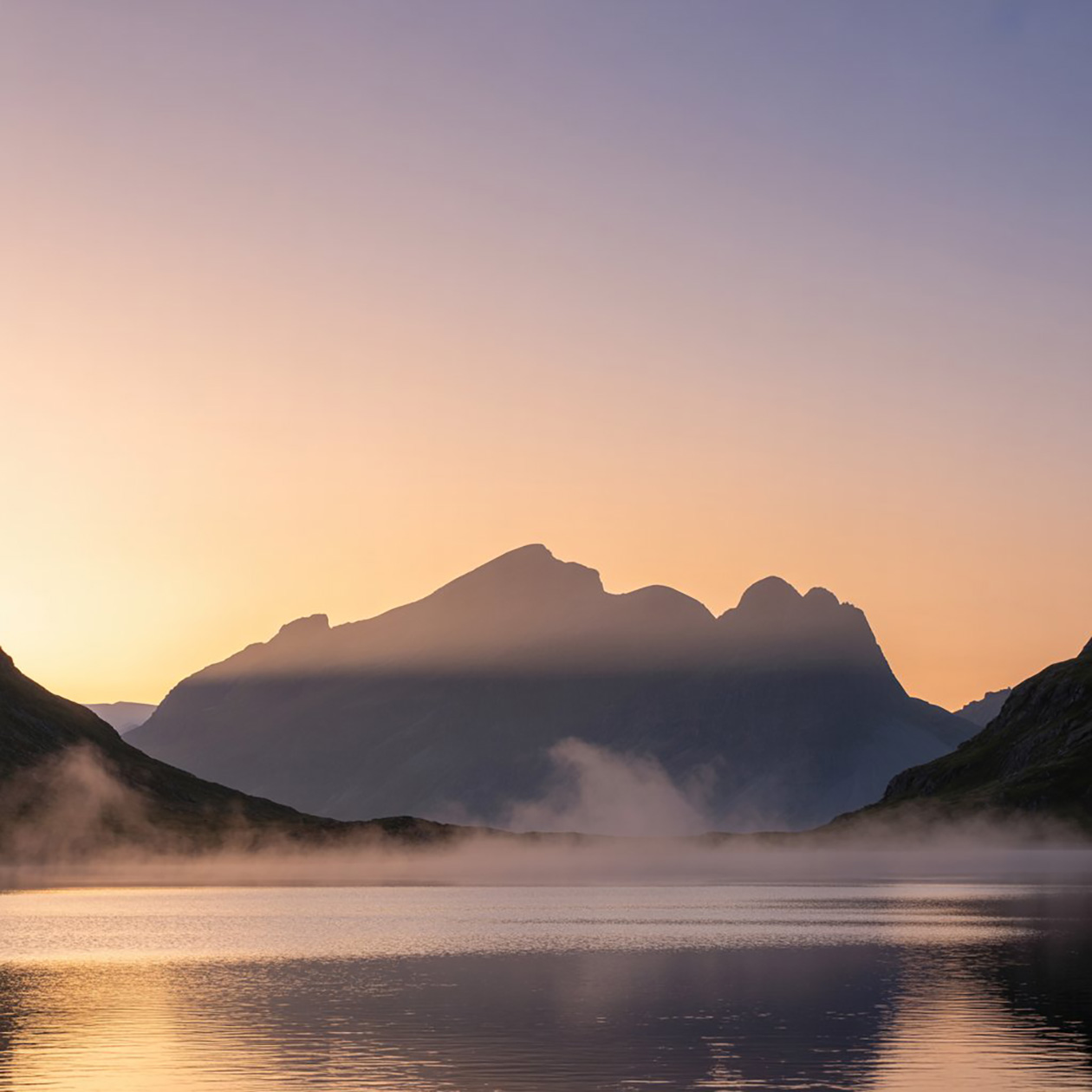 - Пейзаж широким планом с горами и озером на рассвете, легкий туман над водой, натуральные цвета, спокойный и реалистичный вид.
