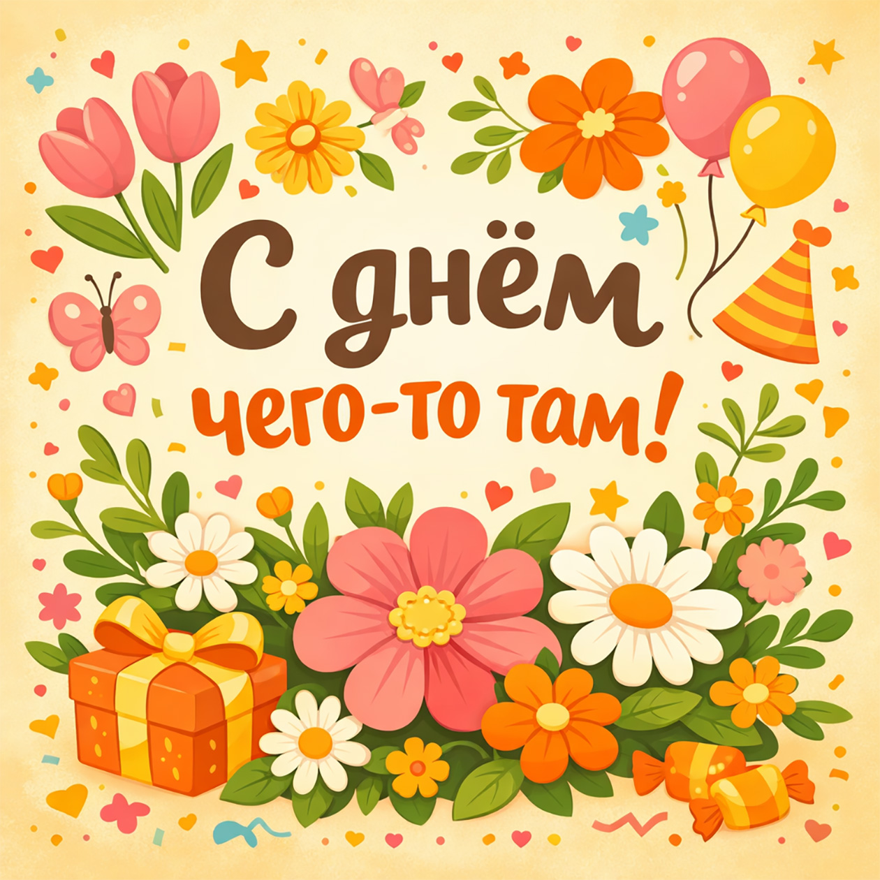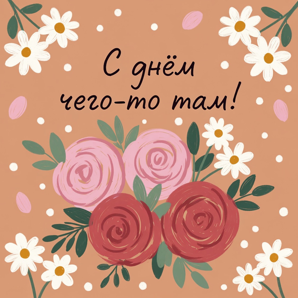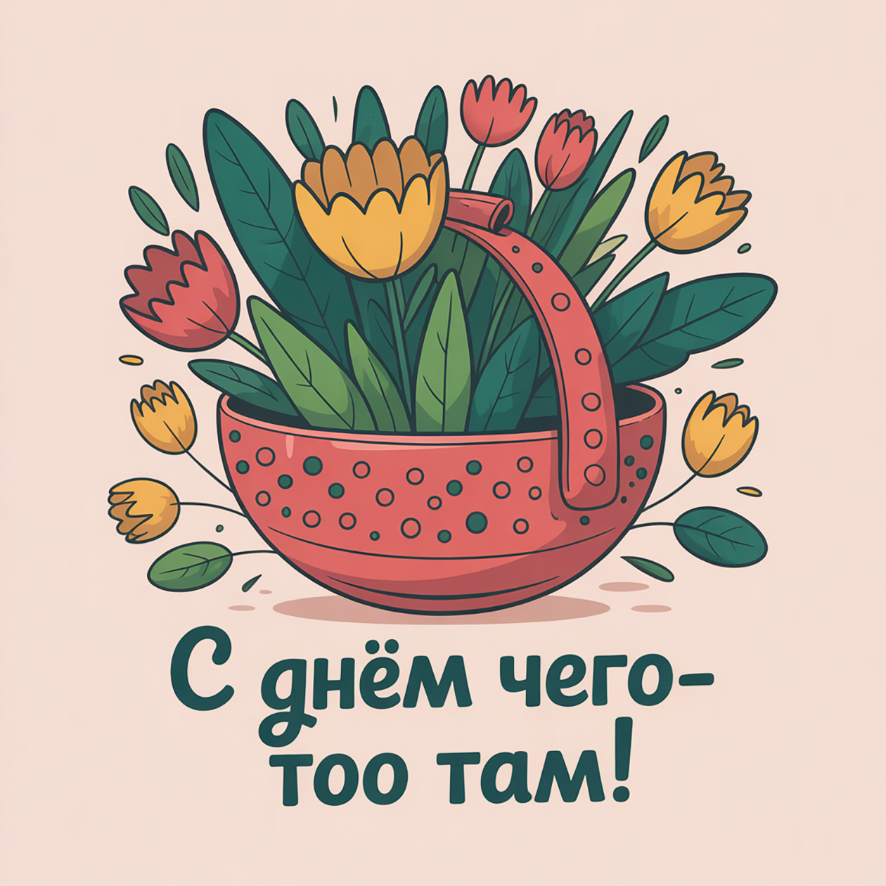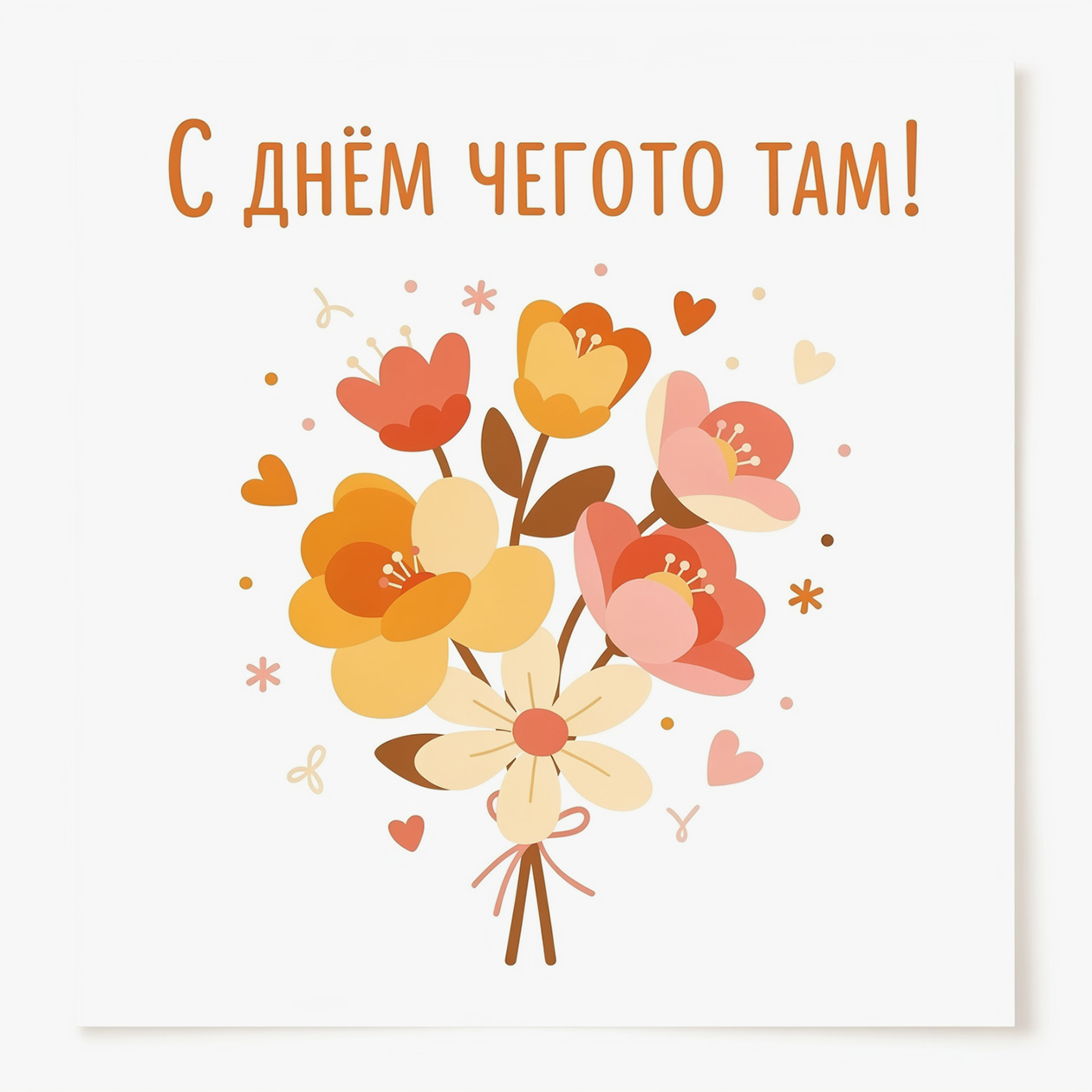 - Веселая иллюстрация для поздравительной открытки с цветами и теплыми оттенками, праздничный, но простой стиль, текст на изображении: «С днем чего-то там!».