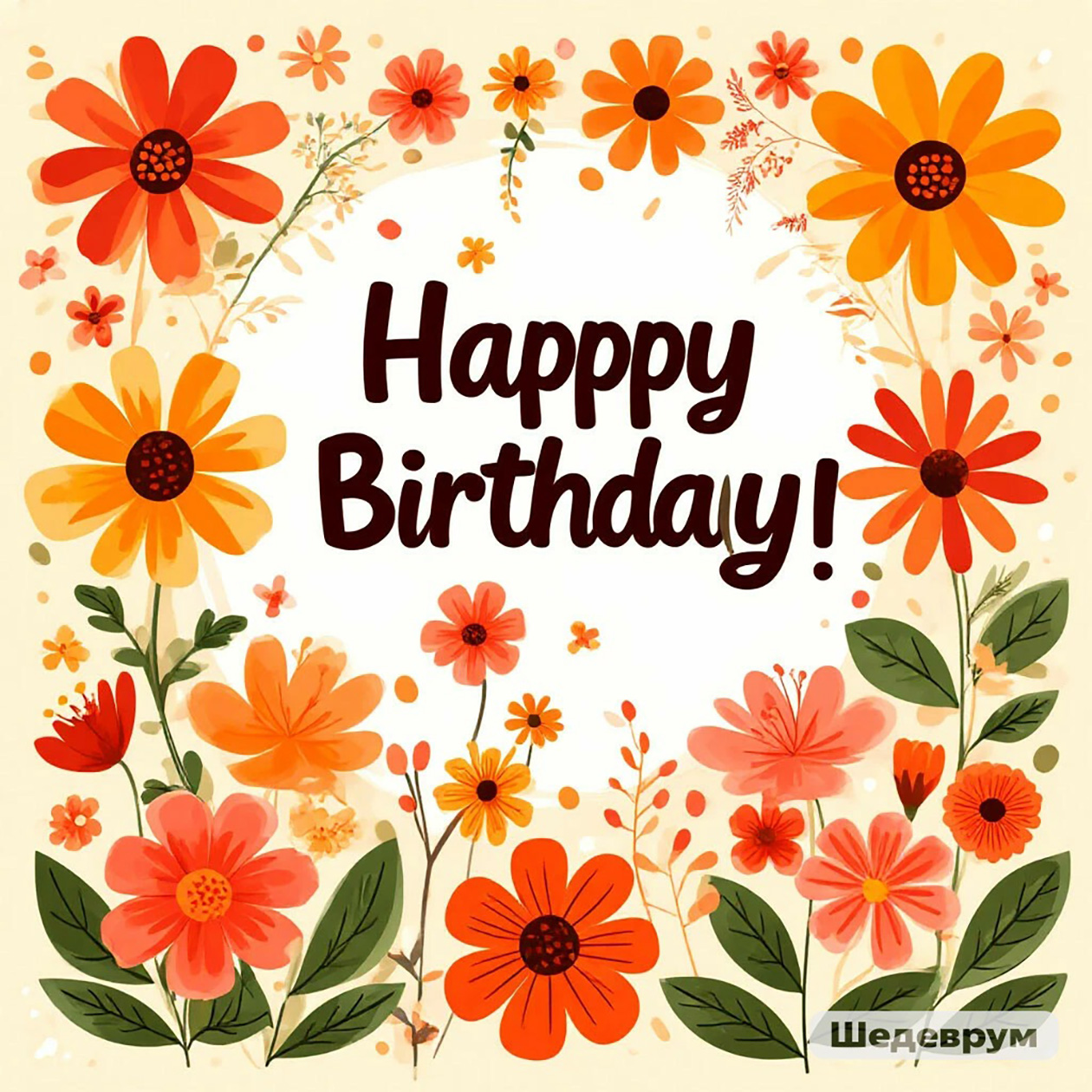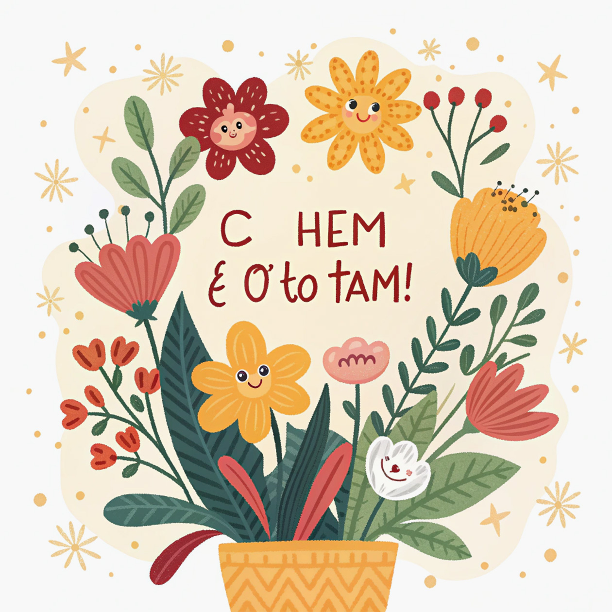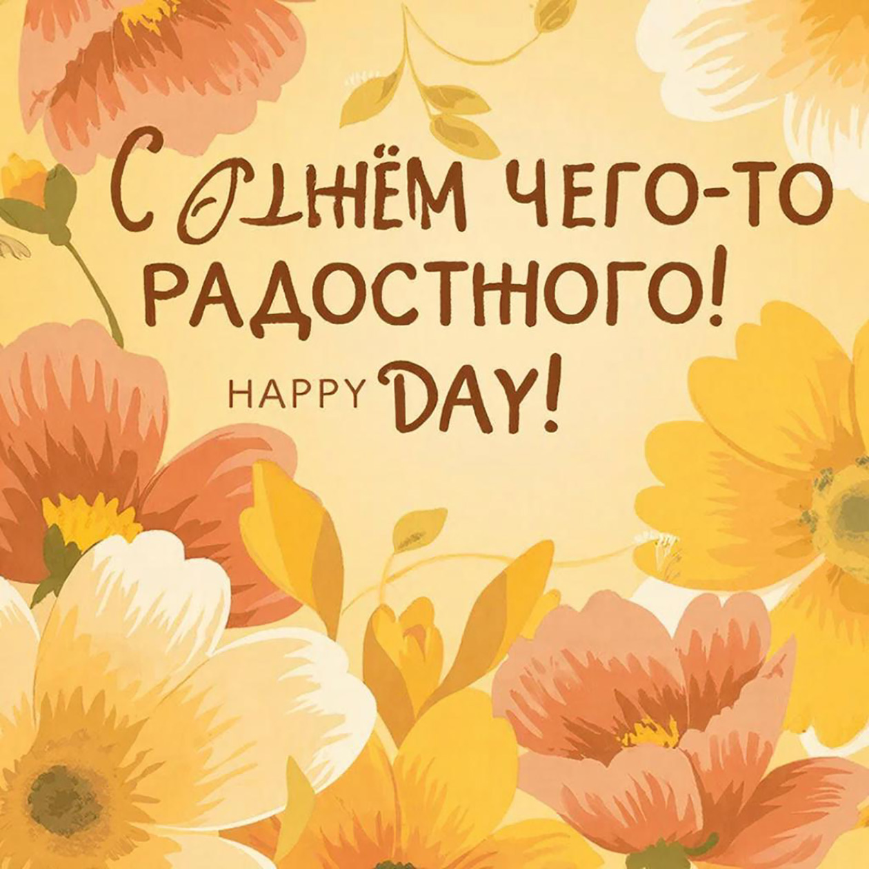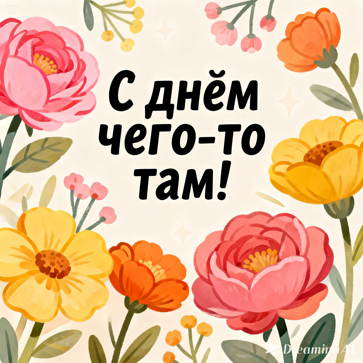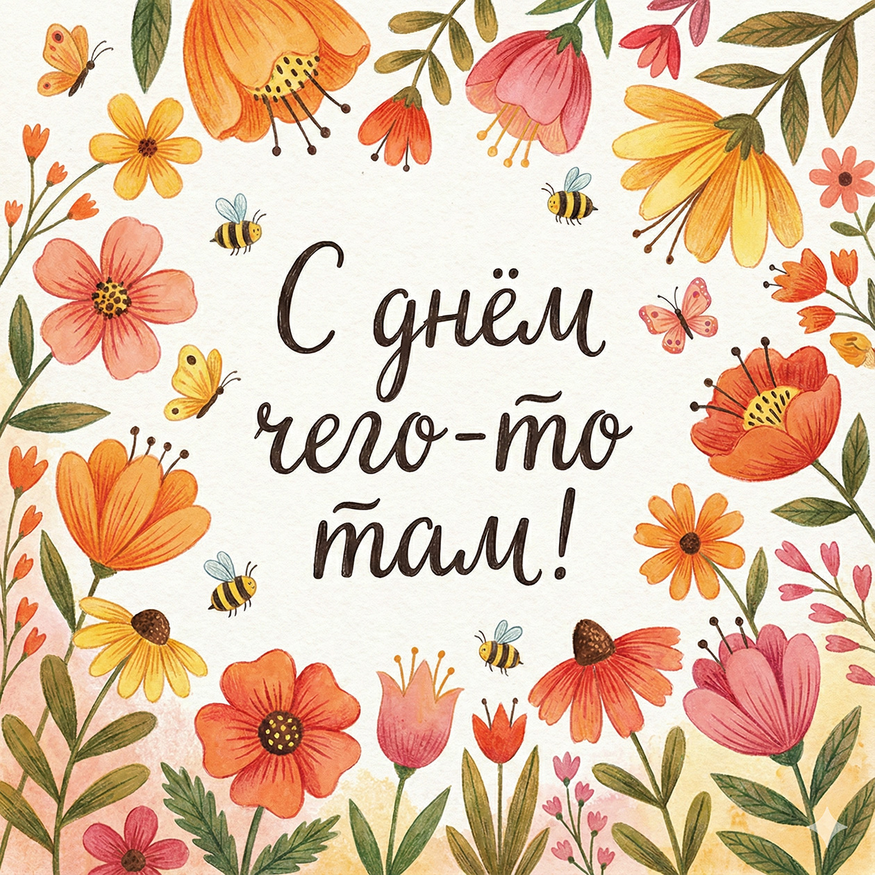 - Веселая иллюстрация для поздравительной открытки с цветами и теплыми оттенками, праздничный, но простой стиль, текст на изображении: «С днем чего-то там!».