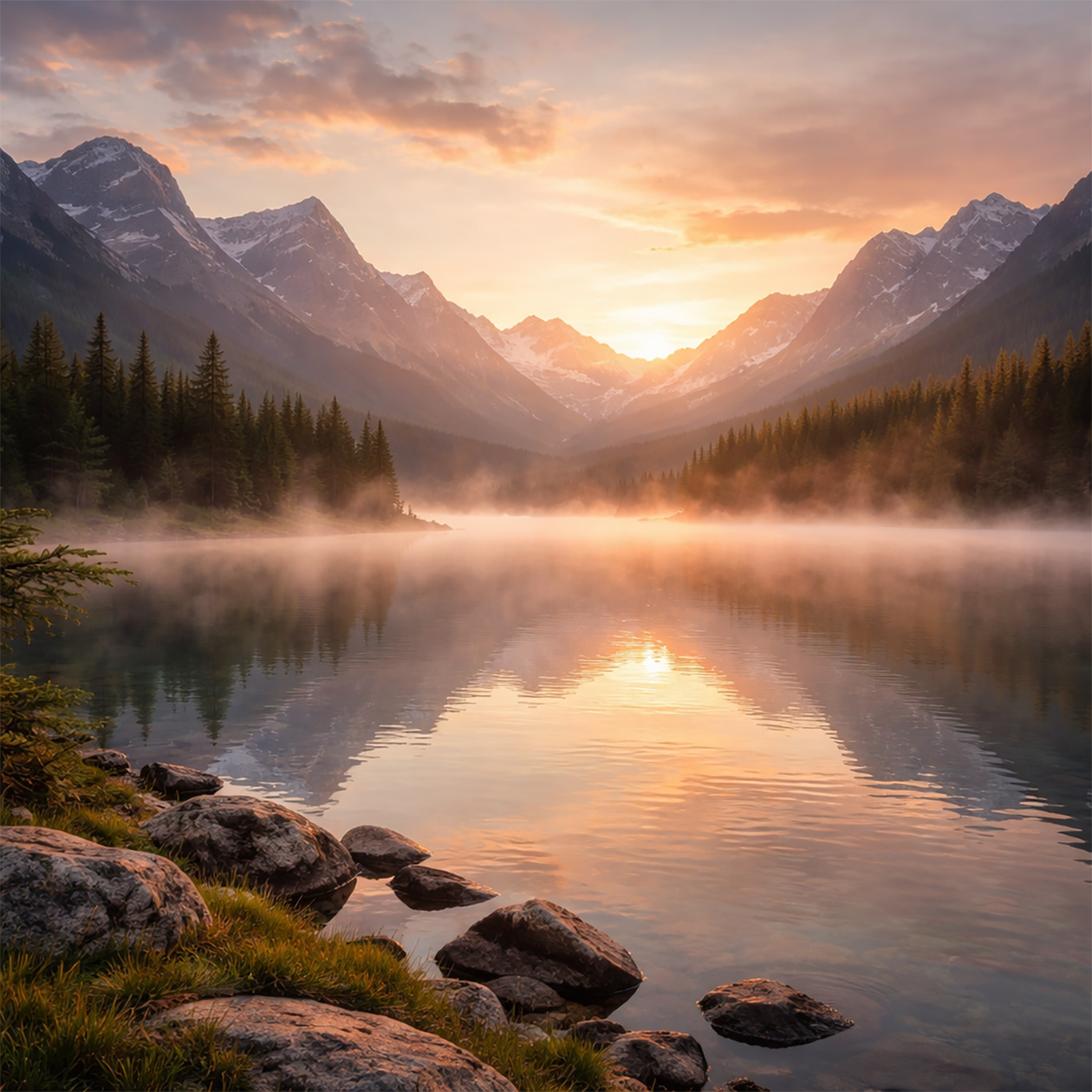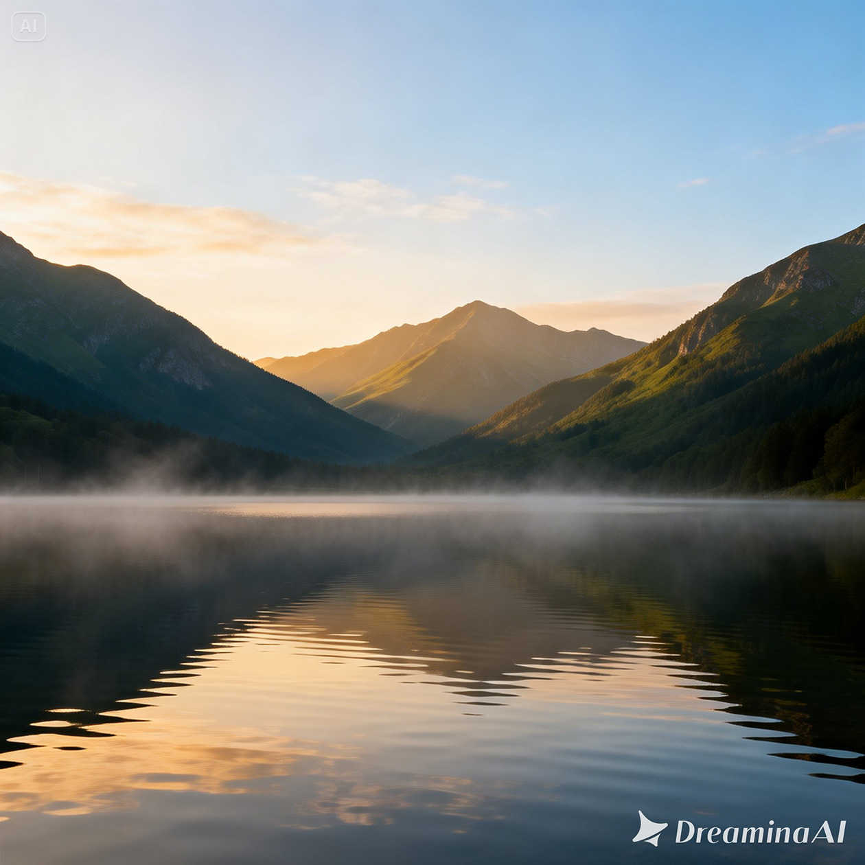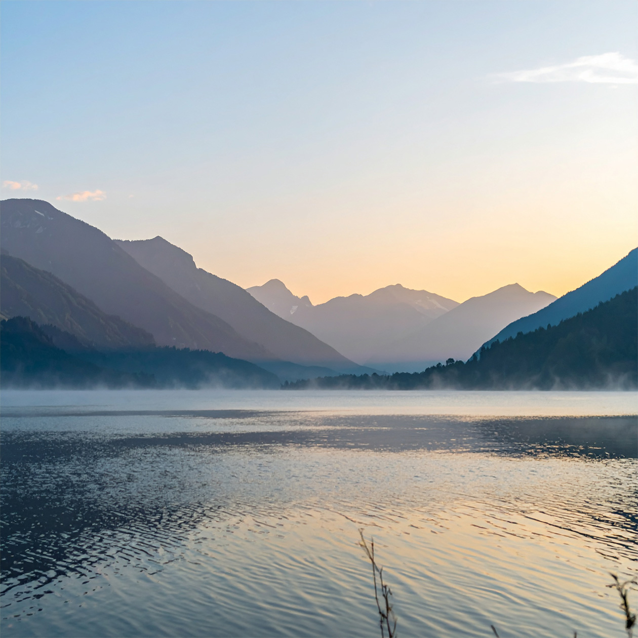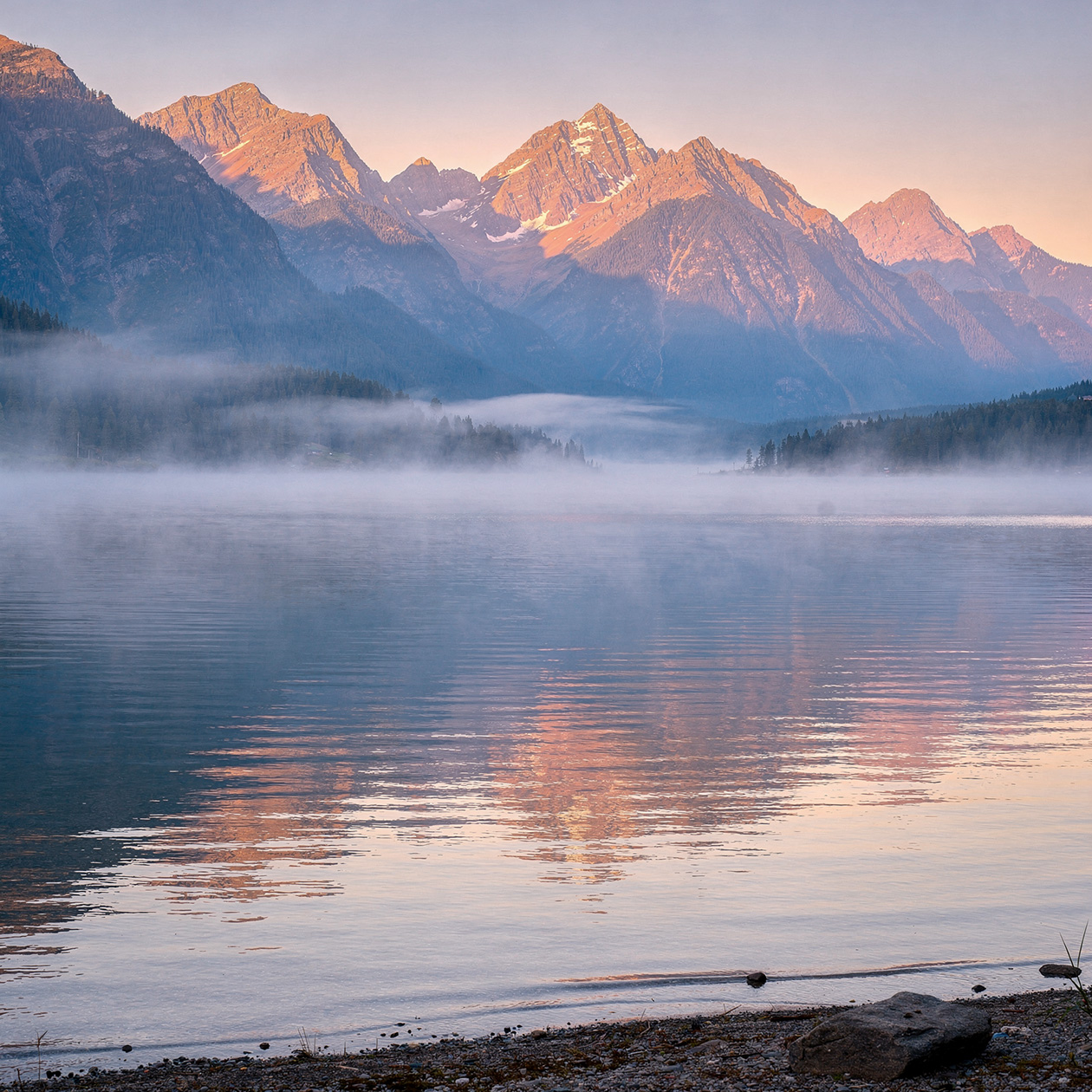 - A wide landscape view of mountains and a lake at sunrise, light mist over the water, natural colors, peaceful and realistic scenery.