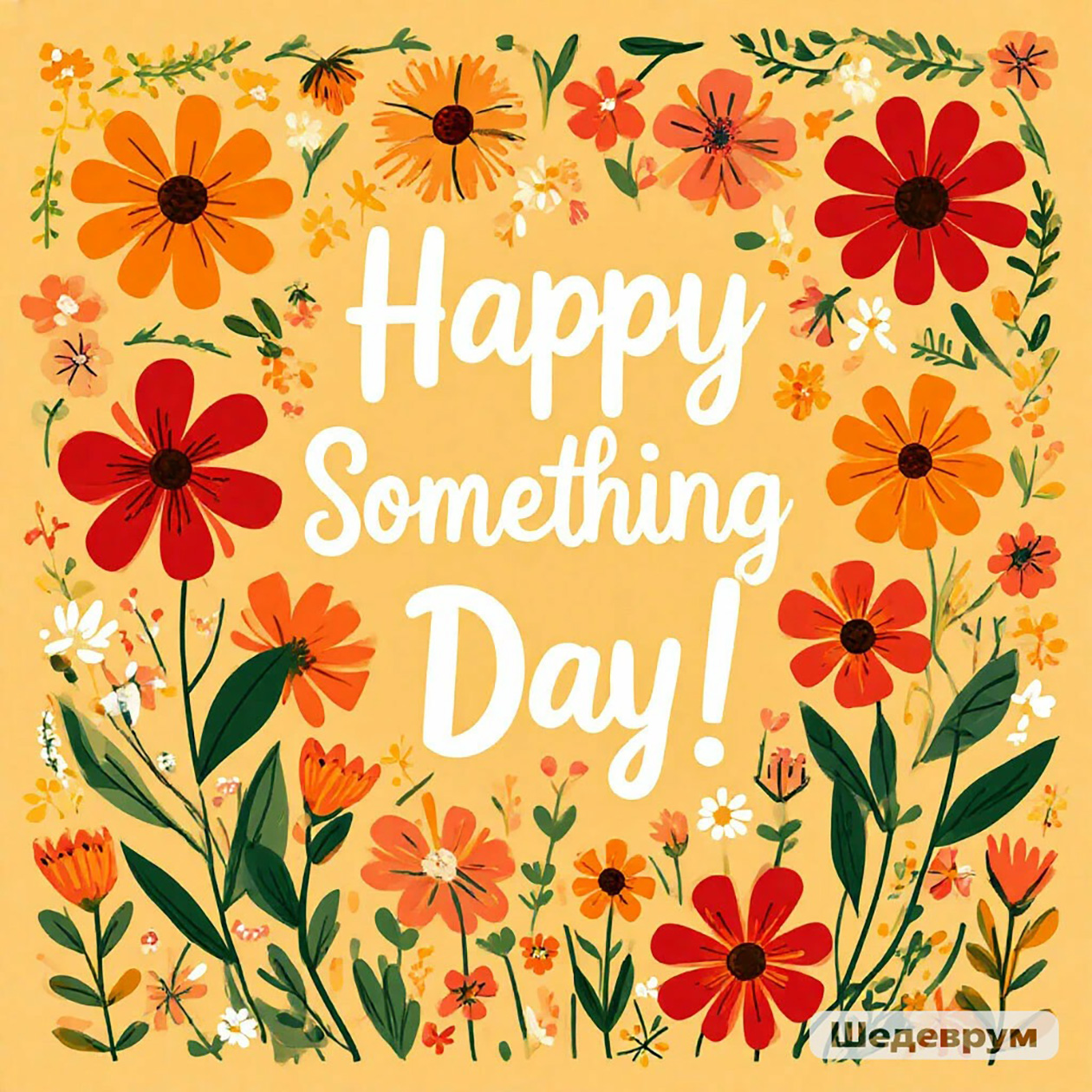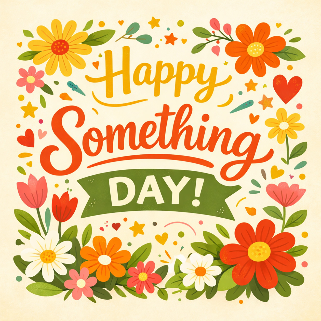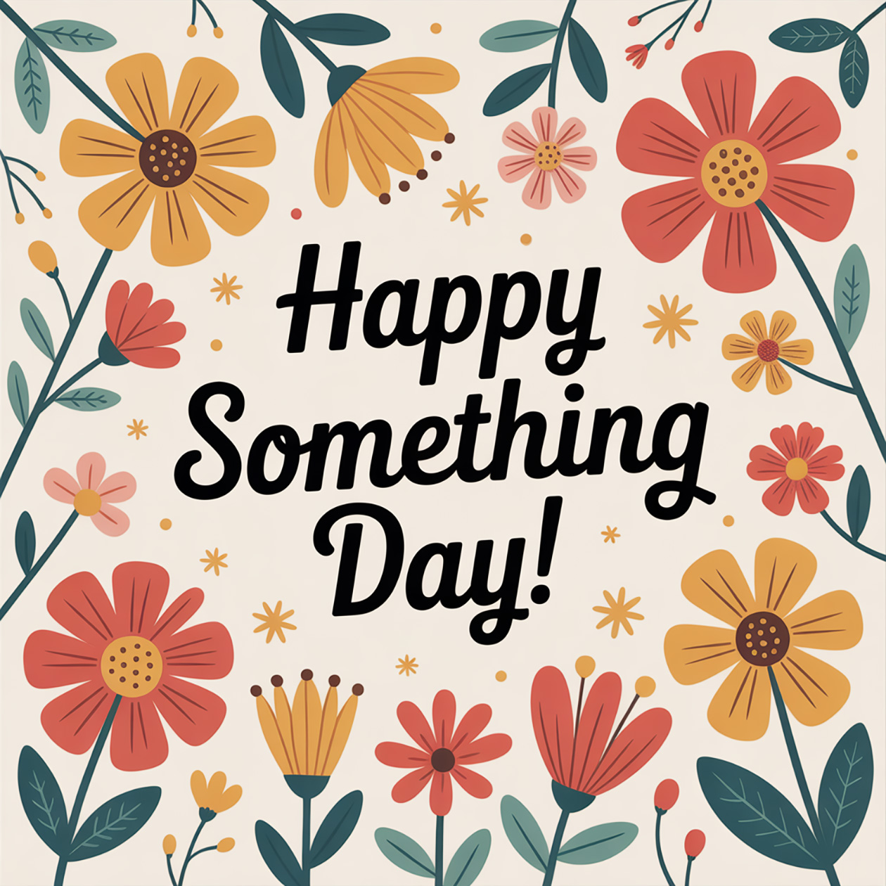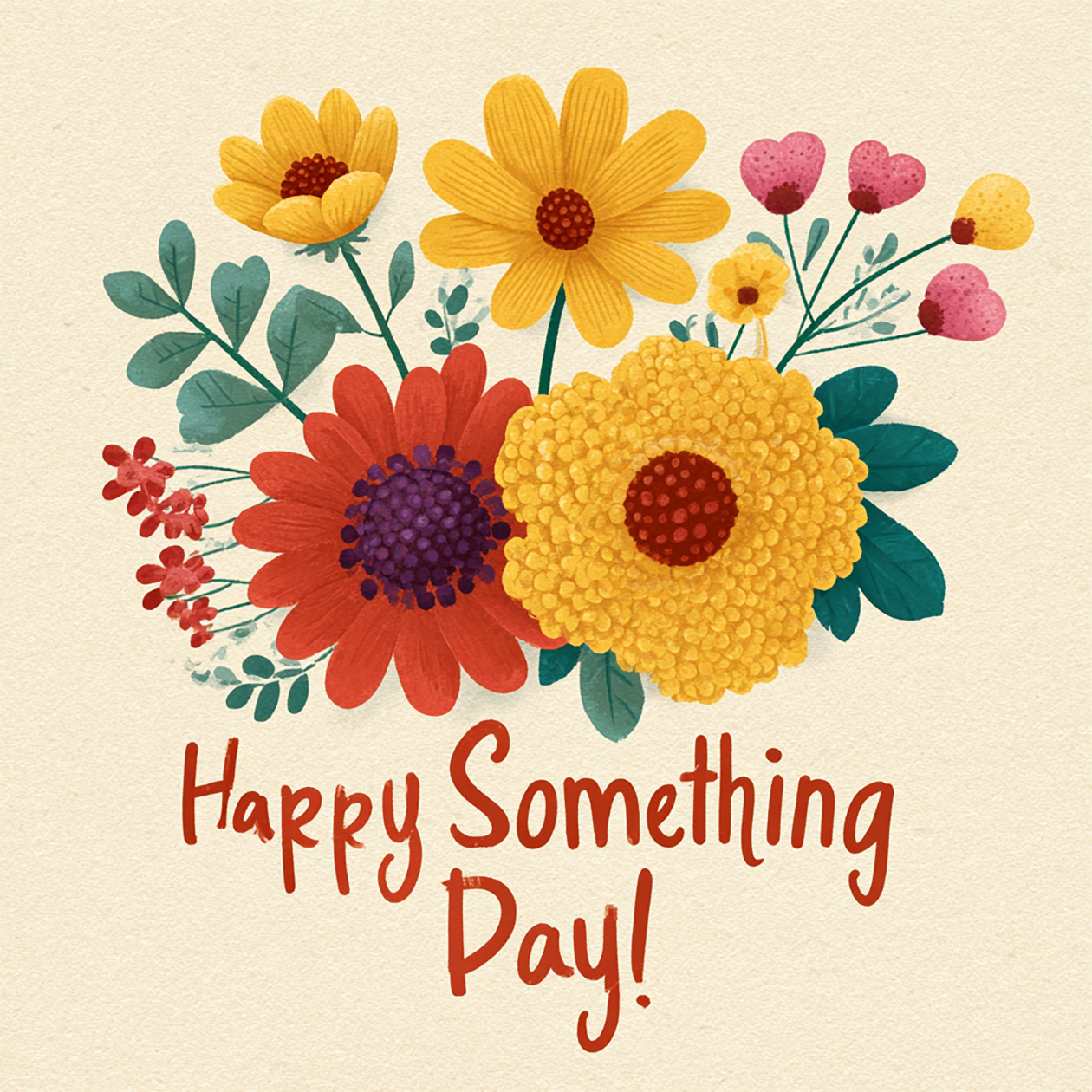 - A cheerful greeting card illustration with flowers and warm colors, festive but simple style, text on the image: “Happy Something Day!”.