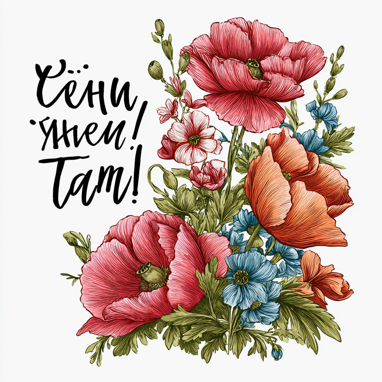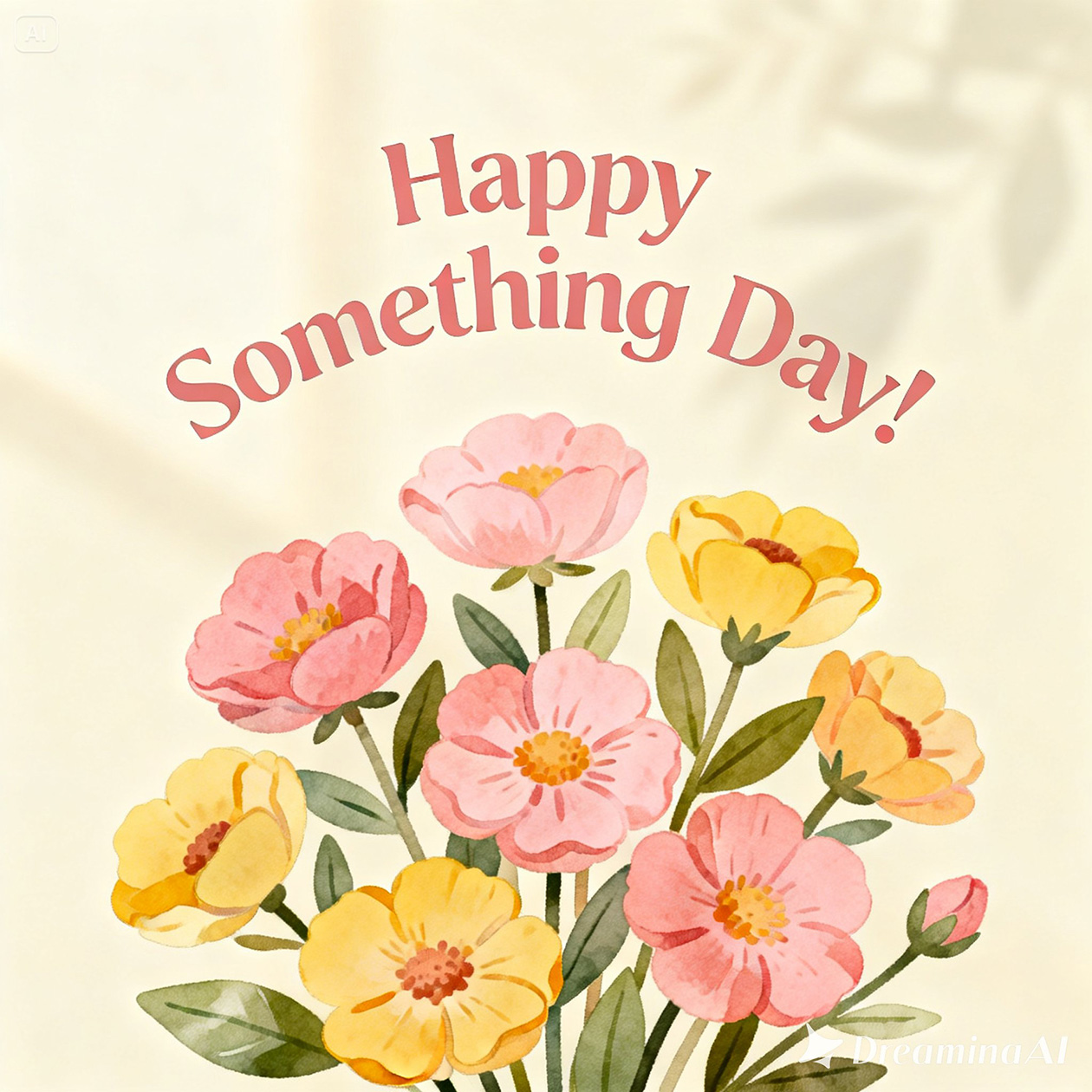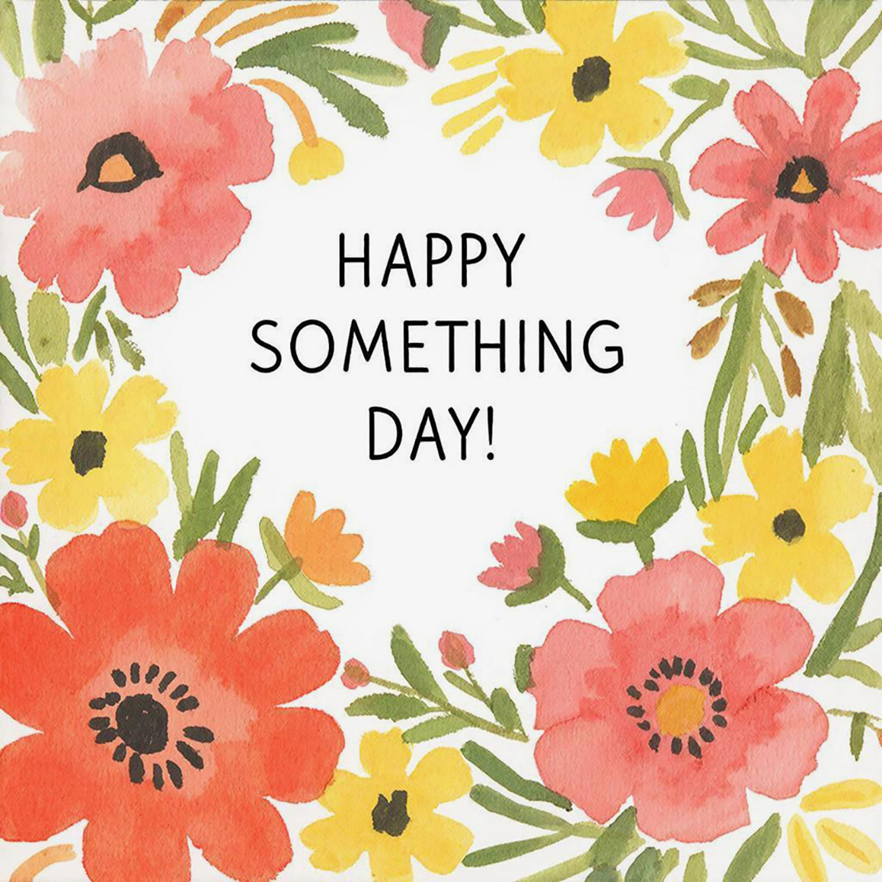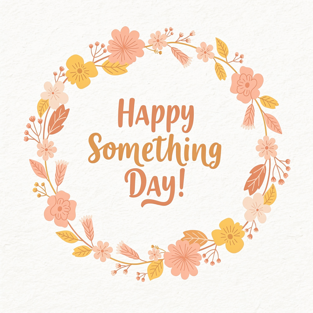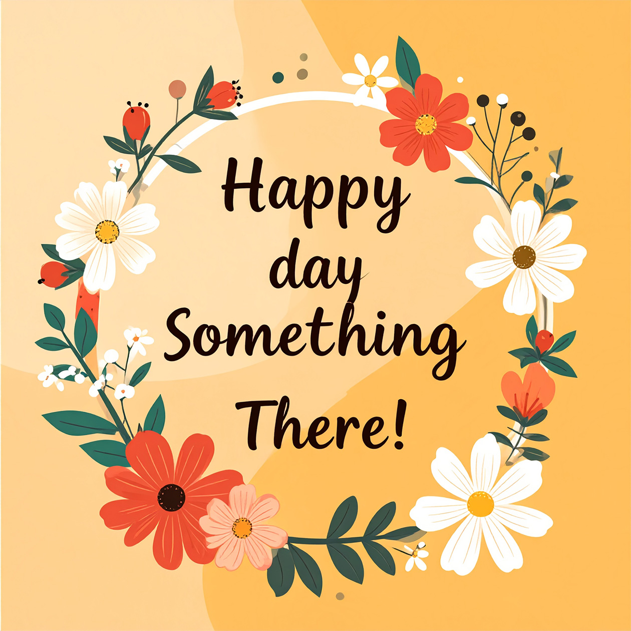 - A cheerful greeting card illustration with flowers and warm colors, festive but simple style, text on the image: “Happy Something Day!”.
