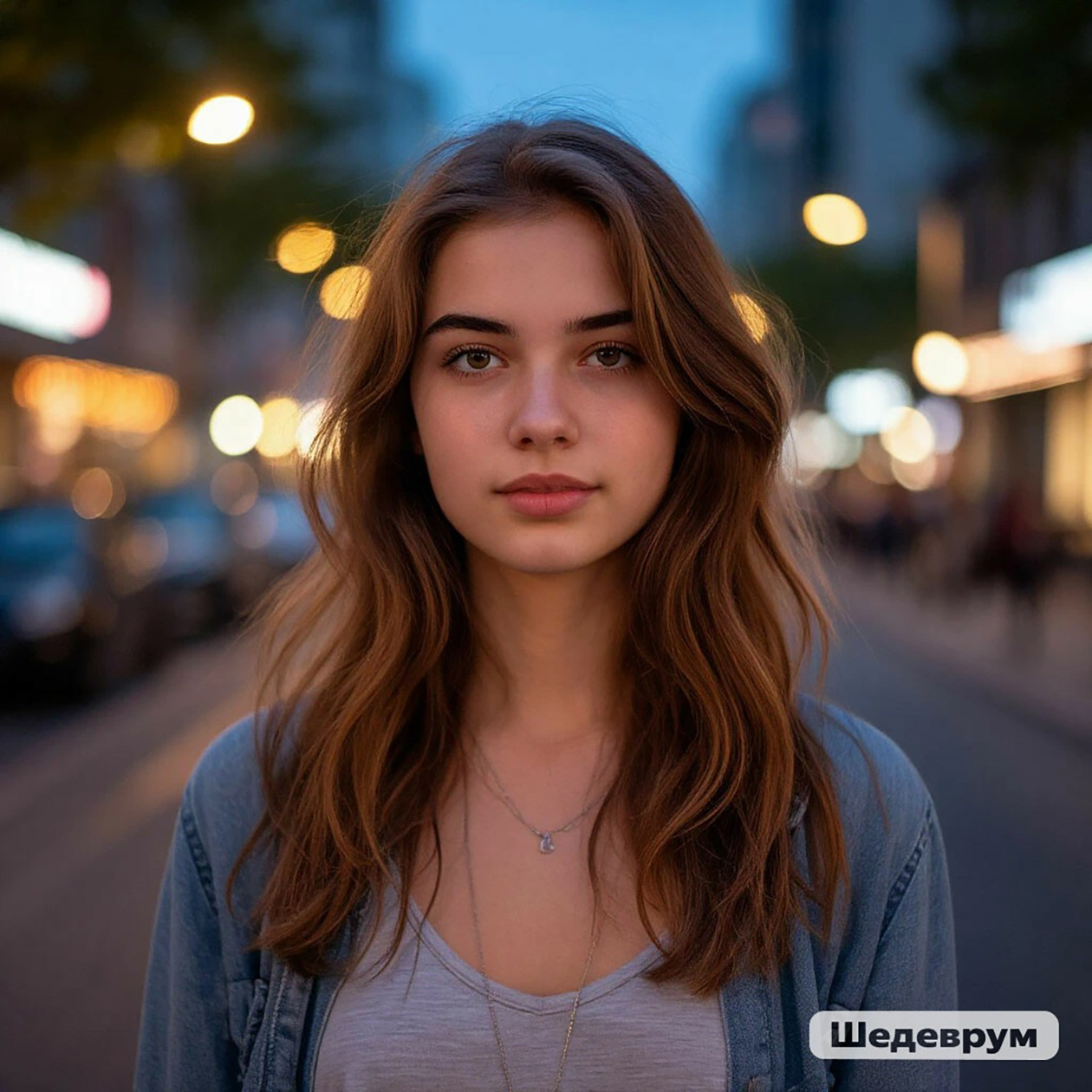 - Реалистичный портрет молодой женщины, стоящей на городской улице вечером, мягкий естественный свет, повседневная одежда, спокойное выражение лица.