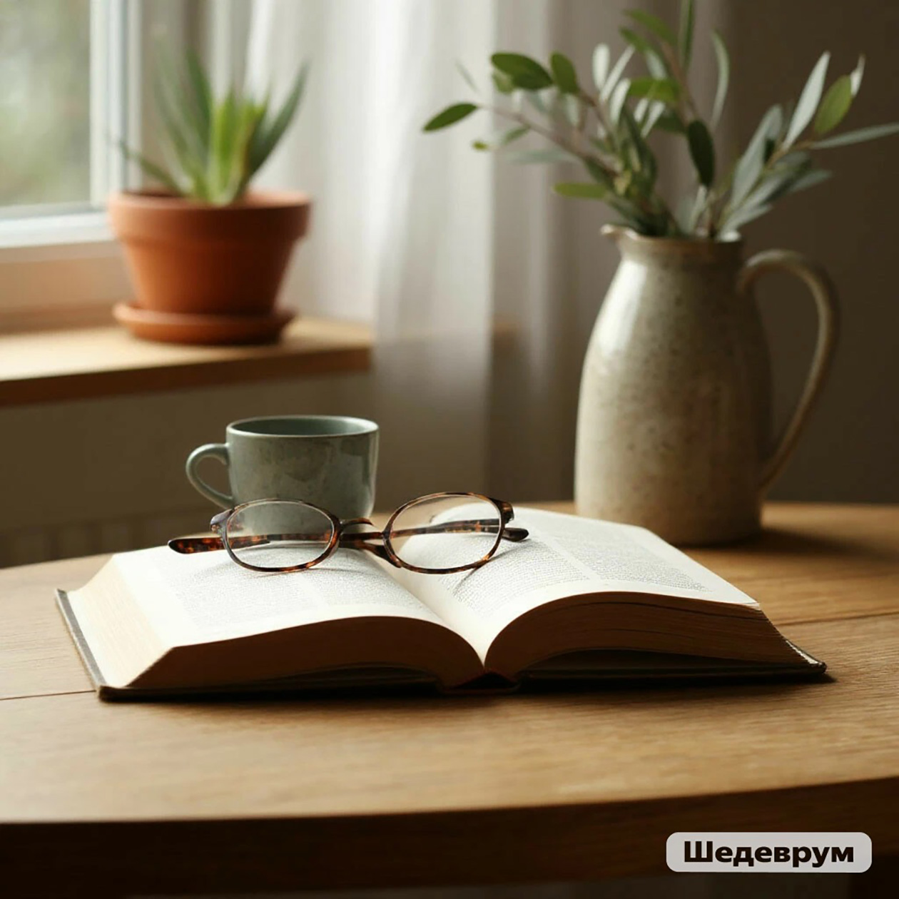 - Минималистичный натюрморт с керамической чашкой, открытой книгой и очками на деревянном столе, мягкий дневной свет, чистая и спокойная атмосфера.