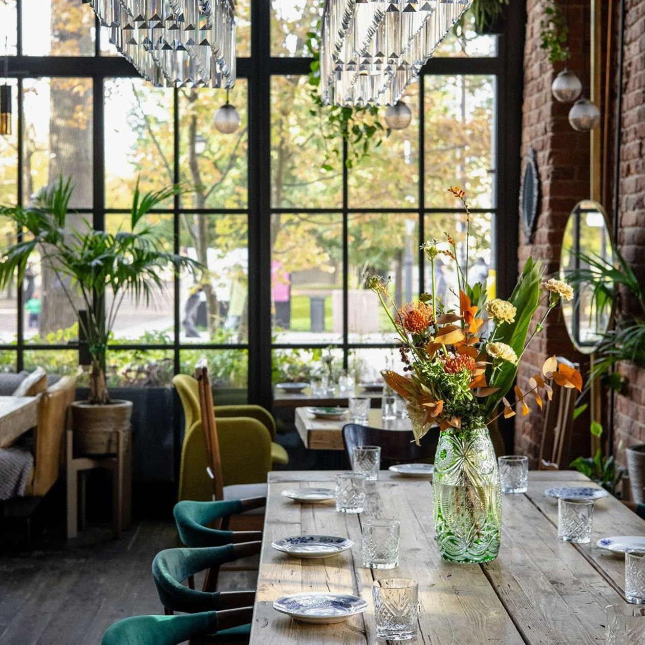 Как выглядит. Очень симпатичное место в стиле Pinterest. В интерьере — аккуратный минимализм, светлое дерево, много зелени и второй свет, который особенно выручает в частые хмурые дни. Можно устроиться за большим общим столом или уединиться за камерным столиком у окна, подглядывая за центром Новой Голландии.