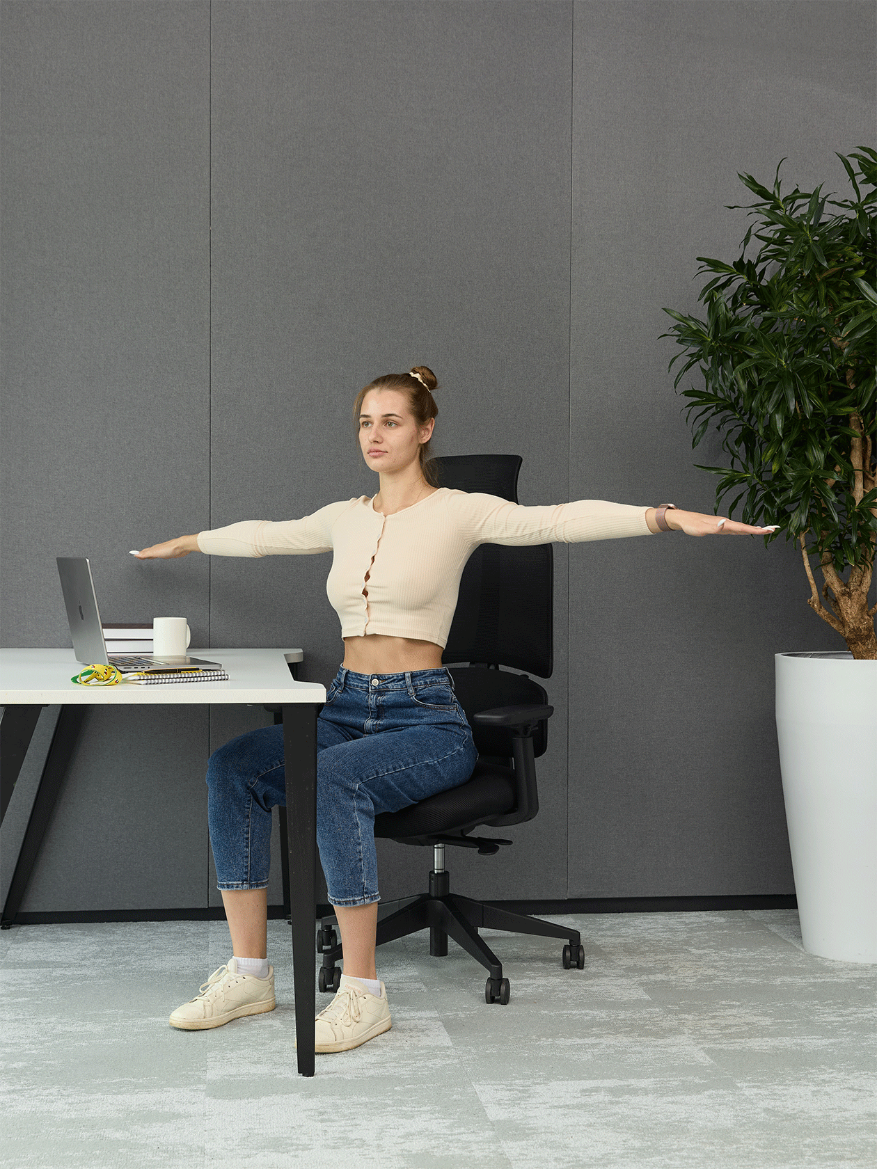 В сидячем положении грудная клетка часто зажимается, а дыхание становится поверхностным, из-за чего организм получает мало кислорода и быстрее устает, снижается концентрация. Это упражнение расслабляет межреберные мышцы и диафрагму, увеличивает глубину вдоха.