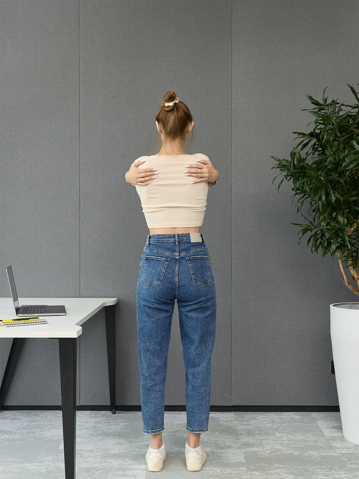 Это упражнение растягивает и тонизирует мышцы груди и область между лопаток. При сидячей работе первые часто зажаты и укорочены, а вторые — натянуты и напряжены. Разминка помогает сбалансировать работу этих мышц и поставить плечи ровнее.