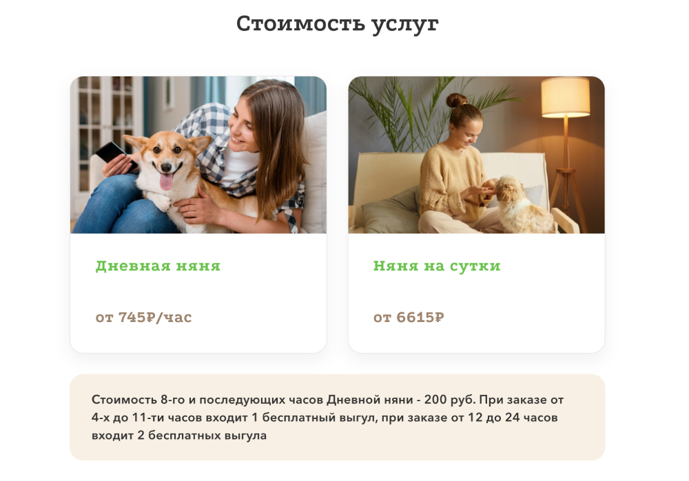 Условия. Найти подходящего ситтера помогают менеджеры: хозяин оставляет заявку, а сотрудник сервиса договаривается со свободным специалистом. «Гульдог» предлагает услуги дневной няни и передержки у ситтера. Стоимость визита к питомцу — от 745 ₽ в час или от 6 615 ₽ в сутки. Цены на передержку у ситтера начинаются от 1 190 ₽ и зависят от возраста питомца, количества выгулов и того, будут ли другие животные в квартире.