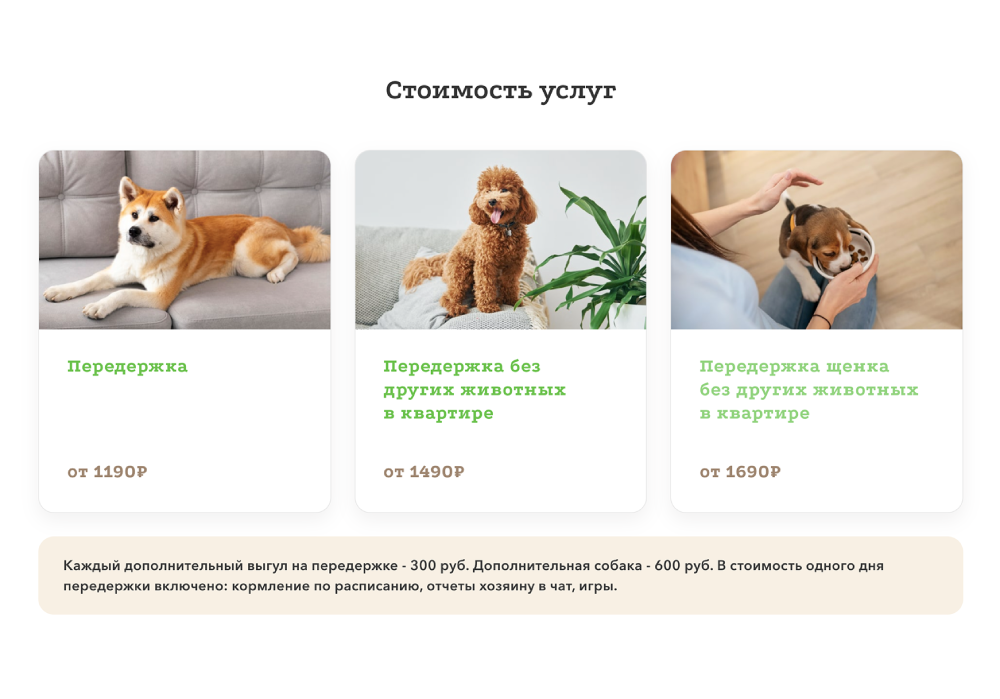 Каждый день ситтер отправляет хозяевам фотографии, видео и рассказы о том, как прошел день. Цена дневных визитов к питомцу — от 849 ₽ за час, передержка у ситтера стоит от 1 299 до 1 999 ₽ в сутки в зависимости от того, сколько выгулов в день требуется собаке. Если животных много, это не проблема: за каждую дополнительную собаку ситтер возьмет еще 250 ₽, если он навещает животных днем, 400 ₽ в сутки — если питомцы остаются на передержке.
